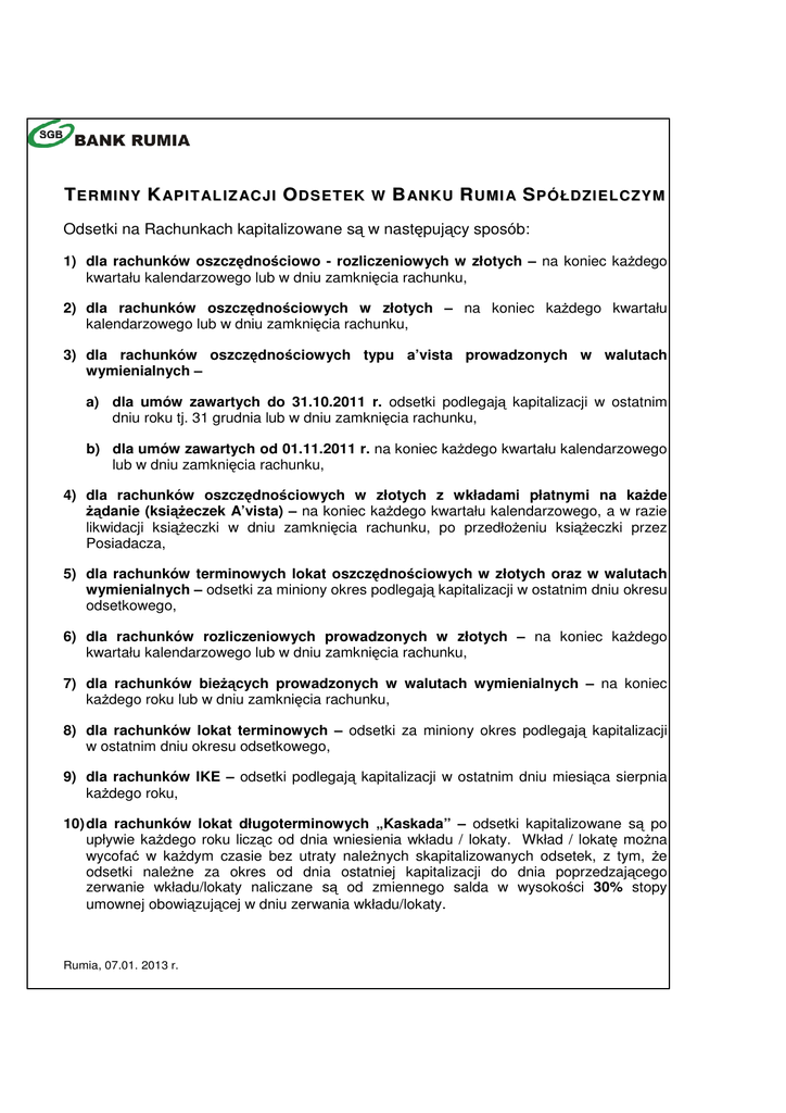 T E R M I N Y K AP I T AL I Z AC J I O D S E T E K W B AN K U R U M I A S P Ó Ł D Z I E L C Z Y M Odsetki na Rachunkach kapitalizowane są w następujący sposób: 1) dla rachunków oszczędnościowo - rozliczeniowych w złotych – na koniec każdego kwartału kalendarzowego lub w dniu zamknięcia rachunku, 2) dla rachunków oszczędnościowych w złotych – na koniec każdego kwartału kalendarzowego lub w dniu zamknięcia rachunku, 3) dla rachunków oszczędnościowych typu a’vista prowadzonych w walutach wymienialnych – a) dla umów zawartych do 31.10.2011 r. odsetki podlegają kapitalizacji w ostatnim dniu roku tj. 31 grudnia lub w dniu zamknięcia rachunku, b) dla umów zawartych od 01.11.2011 r. na koniec każdego kwartału kalendarzowego lub w dniu zamknięcia rachunku, 4) dla rachunków oszczędnościowych w złotych z wkładami płatnymi na każde żądanie (książeczek A’vista) – na koniec każdego kwartału kalendarzowego, a w razie likwidacji książeczki w dniu zamknięcia rachunku, po przedłożeniu książeczki przez Posiadacza, 5) dla rachunków terminowych lokat oszczędnościowych w złotych oraz w walutach wymienialnych – odsetki za miniony okres podlegają kapitalizacji w ostatnim dniu okresu odsetkowego, 6) dla rachunków rozliczeniowych prowadzonych w złotych – na koniec każdego kwartału kalendarzowego lub w dniu zamknięcia rachunku, 7) dla rachunków bieżących prowadzonych w walutach wymienialnych – na koniec każdego roku lub w dniu zamknięcia rachunku, 8) dla rachunków lokat terminowych – odsetki za miniony okres podlegają kapitalizacji w ostatnim dniu okresu odsetkowego, 9) dla rachunków IKE – odsetki podlegają kapitalizacji w ostatnim dniu miesiąca sierpnia każdego roku, 10) dla rachunków lokat długoterminowych „Kaskada” – odsetki kapitalizowane są po upływie każdego roku licząc od dnia wniesienia wkładu / lokaty. Wkład / lokatę można wycofać w każdym czasie bez utraty należnych skapitalizowanych odsetek, z tym, że odsetki należne za okres od dnia ostatniej kapitalizacji do dnia poprzedzającego zerwanie wkładu/lokaty naliczane są od zmiennego salda w wysokości 30% stopy umownej obowiązującej w dniu zerwania wkładu/lokaty. Rumia, 07.01. 2013 r.