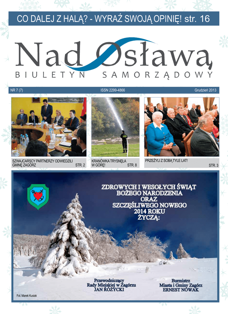 CO DALEJ Z HALĄ? - WYRAŹ SWOJĄ OPINIĘ! str. 16 NR 7 (7) SZWAJCARSCY PARTNERZY ODWIEDZILI GMINĘ ZAGÓRZ str. 2 Fot. Marek Kusiak ISSN 2299-4866 KRANÓWKA TRYSNĘŁA W GÓRĘ! str. 8 Grudzień 2013 PRZEŻYLI Z SOBĄ TYLE LAT! str. 3 Z ŻYCIA PROJEKTU 2 Szanowni Czytelnicy! Oddajemy w Wasze ręce siódmy numer Biuletynu Samorządowego Gminy Zagórz „Nad Osławą”. To ostatnie wydanie naszego kwartalnika, które finansowane jest w ramach trwającego do końca 2013 roku projektu „AKADEMIA DEMOKRACJI i ROZWOJU”. Finalizacja działań projektowych bynajmniej nie oznacza zaprzestania kontynuacji współpracy partnerskiej z samorządem Villars-sur-Glâne, jak również ukazywania się naszego biuletynu. Niniejsze wydanie przypada na okres świąteczno - noworoczny. Ten wyjątkowy czas w naturalny sposób inspiruje do czynienia bilansów i podsumowań. Z uwagi na samorządowy profil gazety, do oceny mijającego roku zaprosiliśmy na łamy „Nad Osławą” osoby, które uzyskały od mieszkańców Gminy Zagórz demokratyczne mandaty do reprezentowania naszej społeczności w wymiarze lokalnym, regionalnym i międzynarodowym. W wypowiedziach naszych gości pojawiły się m.in. życzenia świąteczne i noworoczne, do których oczywiście się dołączamy. Szanowni Państwo! Wesołych Świąt i Do Siego Roku! W imieniu Zespołu Redakcyjnego Jerzy Zuba - redaktor naczelny Wydawca: Urząd Miasta i Gminy Zagórz Redakcja: Jerzy Zuba (redaktor naczelny) i współpracownicy Adres Redakcji: 38-540 Zagórz, ul. 3 Maja 2 Kontakt: 13 46 220 62 www.akademiademokracji.pl NAD OSŁAWĄ nr 7 Szwajcarscy partnerzy odwiedzili Gminę Zagórz W dniach 29 września – 3 października br. samorządowcy i młodzież z Villars-sur-Glâne odbyli wizytę studyjną w Gminie Zagórz będącą finałowym akcentem projeku pn. „AKADEMIA DEMOKRACJI ROZWOJU”, który uzyskał ponad 320 000 zł dofinansowania Funduszu Partnerskiego Szwajcarskiego Grantu Blokowego. Pamiątkowe zdjęcie na zakończenie wizyty w Placówce Straży Granicznej w Sanoku. W składzie 16 – osobowej delegacji oprócz burmistrz Eriki Schnyder, sekretarza gminy Emmanuela Roulin, przewodniczącej Rady Generalnej Villars-sur-Glâne Francine Defferrard, pięcioosobowej grupy młodzieży znaleźli się urzędnicy i funkcjonariusze odpowiedzialni za: oświatę, gospodarkę komunalną, służbę zdrowia, sport i kulturę oraz ochronę przeciwpożarową. Oficjalne powitanie delegacji szwajcarskiej odbyło się rankiem 30 września w Sali Narad Urzędu Miasta i Gminy w Zagórzu. Następnie burmistrz Zagórza Ernest Nowak zainaugurował panelową konferencję z udziałem samorządowców szczebla gminnego, powiatowego oraz liderów lokalnych Gminy Zagórz dotyczącą rozwiązywania problemów komunalnych, tworzenia budżetu gminy, gospodarCzasopismo bezpłatne, finansowane ki odpadami oraz zarządzania w sytuacjach w ramach projektu „Akademia kryzysowych. Zwieńczeniem konferencji wyDemokracji i Rozwoju” pełnionej niezwykle interesującymi prezentacjami była sesja Rady Miejskiej w Zagórzu z udziałem: ministra Martina Micheleta – zastępcy AmbasaPROJEKT “AKADEMIA DEMOKRACJI I ROZWOJU” WSPÓŁFINANSOWANY PRZEZ SZWAJCARIĘ dora Szwajcarii w Polsce, W RAMACH SZWAJCARSKIEGO PROGRAMU WSPÓŁPRACY Z NOWYMI KRAJAMI Alicji Wosik – wicewoCZŁONKOWSKIMI UNII EUROPEJSKIEJ. WARTOŚĆ 101.401,26 CHF Projekt realizowany przyDOFINANSOWANIA: wsparciu Szwajcarii jewody podkarpackiew ramach szwajcarskiego programu PROJECT “ACADEMY OF DEMOCRACY AND DEVELOPMENT” SUPPORTED BY A GRANT FROM go, Sebastiana Niżnika SWITZERLAND THROUGH THE SWISS CONTRIBUTION TO THE ENLARGED EUROPEAN UNION. współpracy – starosty sanockiego. VALUE OF CO-FINANCING:z nowymi 101.401,26 CHF krajami członkowskimi Obrady zgodnie z pierUnii Europejskiej wotnymi zamierzeniami okazały się praktycznym rozwinięciem zagadnień omawianych podczas konferencji panelowej w odniesieniu do realiów funkcjonowania samorzą- dów Gminy Zagórz i Villars-sur-Glâne. W programie wizyty nie mogło zabraknąć czasu na zwiedzanie najcenniejszych zabytków Gminy Zagórz. Szwajcarscy goście odwiedzili ruiny Klasztoru Karmelitów Bosych, Sanktuarium Matki Bożej Nowego Życia, zespół skoczni narciarskich „Zakucie” oraz cerkiew pw. Spotkania Pańskiego w Morochowie. Wizytacje wymienionych obiektów stały się okazją do wymiany polskich i szwajcarskich doświadczeń w zakresie zarządzania kulturą i sportem oraz ochrony dziedzictwa kulturowego. Niezwykle interesujący przebieg miała wizyta szwajcarskiej młodzieży w zagórskim Gimnazjum. Młodzi Szwajcarzy pod opieką nauczycieli Ewy Bryły – Czech i Jerzego Hryszko zwiedzili szkołę, poznali strukturę szkolnictwa w Polsce, a także uczestniczyli w lekcjach otwartych prowadzonych przez nauczycieli języków obcych Andrzeja Chrobaka i Grzegorza Dorosza. Podczas szkolnego apelu licznie zgromadzeni gimnazjaliści obejrzeli prezentację na temat Szwajcarii. Ponadto rozstrzygnięto dwa konkursy. Pierwszy na temat wiedzy o Szwajcarii. Drugi na logo lub symbol budzący najtrafniejsze skojarzenia z tym krajem. Część rozrywkową apelu wypełniły popisy gimnastyków klubu Spartanie z Zahutynia pod wodzą trenera Mirosława Kaźmierczaka. Muzyczną oprawę uroczystości zapewniła Klaudia Solon (śpiew) oraz Anna Paryżak (flet). Końcowym akcentem polsko – szwajcarskiego spotkania młodzieży był występ szkolnego zespołu tanecznego. Obfitujący w liczne wrażenia dzień zakończyło spotkanie szwajcarskiej delegacji ze strażakami ochotnikami z terenu Gminy Zagórz, które zorganizowano w poraskim Domu Strażaka. Ukoronowaniem Z ŻYCIA PROJEKTU GRUDZIEŃ 2013 3 wizytacji jednostki OSP Poraż stała się biesiada regionalna, przygotowana przez tamtejsze Koło Gospodyń Wiejskich. Opisywane tu działania oprócz promocji regionalnej kuchni i kultury były przyczynkiem do wymiany polskich i szwajcarskich doświadczeń w zakresie wspó
