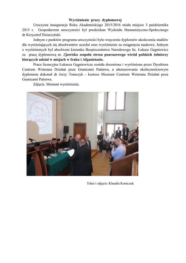 Wyróżnienie pracy dyplomowej Uroczysta inauguracja Roku Akademickiego 2015/2016 miała miejsce 3 października 2015 r. Gospodarzem uroczystości był prodziekan Wydziału Humanistyczno-Społecznego dr Krzysztof Dziurzyński. Jednym z punktów programu uroczystości było wręczenie dyplomów ukończenia studiów dla wyróżniających się absolwentów uczelni oraz wyróżnienie za osiągnięcia naukowe. Jednym z wyróżnionych był absolwent kierunku Bezpieczeństwa Narodowego lic. Łukasz Gęgniewicz za pracę dyplomową nt. Zjawisko zespołu stresu pourazowego wśród polskich żołnierzy biorących udział w misjach w Iraku i Afganistanie. Praca licencyjna Łukasza Gęgniewicza została doceniona i wyróżniona przez Dyrektora Centrum Weterana Działań poza Granicami Państwa, a uhonorowania okolicznościowym dyplomem dokonał dr Jerzy Tomczyk - kustosz Muzeum Centrum Weterana Działań poza Granicami Państwa. Zdjęcie. Moment wyróżnienia. Tekst i zdjęcie: Klaudia Koniczuk