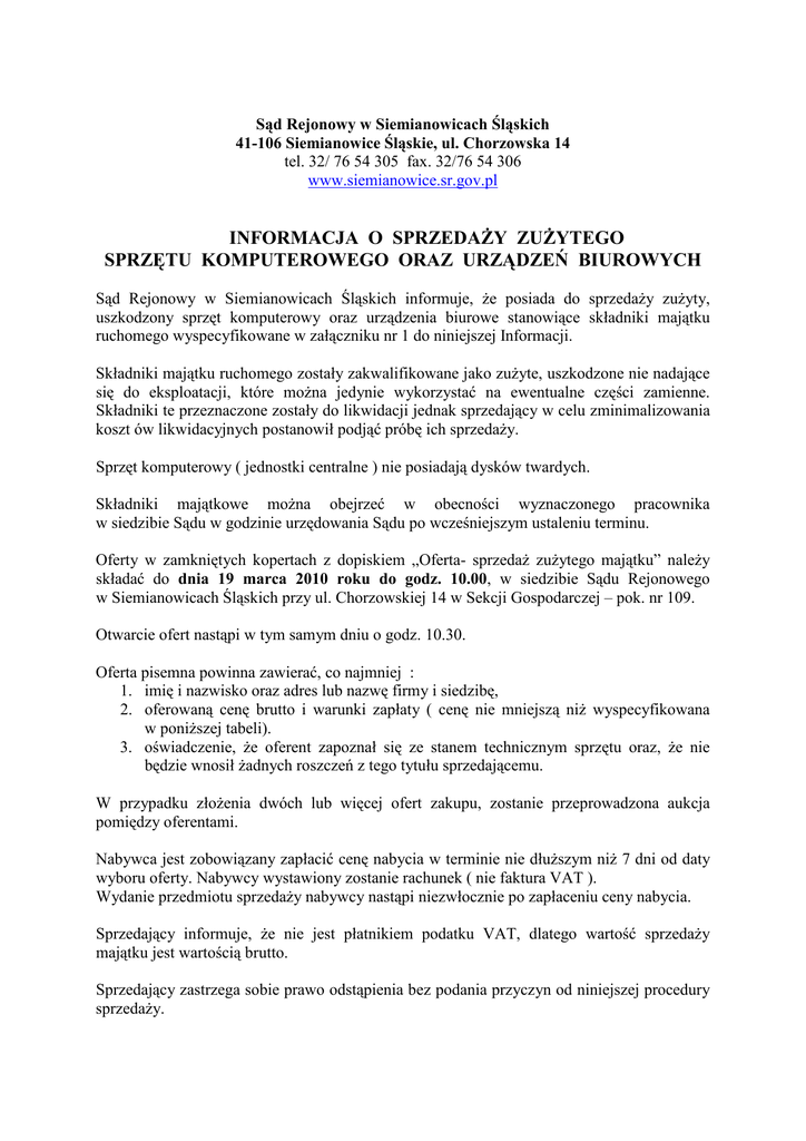Sąd Rejonowy w Siemianowicach Śląskich 41-106 Siemianowice Śląskie, ul. Chorzowska 14 tel. 32/ 76 54 305 fax. 32/76 54 306 www.siemianowice.sr.gov.pl INFORMACJA O SPRZEDAśY ZUśYTEGO SPRZĘTU KOMPUTEROWEGO ORAZ URZĄDZEŃ BIUROWYCH Sąd Rejonowy w Siemianowicach Śląskich informuje, Ŝe posiada do sprzedaŜy zuŜyty, uszkodzony sprzęt komputerowy oraz urządzenia biurowe stanowiące składniki majątku ruchomego wyspecyfikowane w załączniku nr 1 do niniejszej Informacji. Składniki majątku ruchomego zostały zakwalifikowane jako zuŜyte, uszkodzone nie nadające się do eksploatacji, które moŜna jedynie wykorzystać na ewentualne części zamienne. Składniki te przeznaczone zostały do likwidacji jednak sprzedający w celu zminimalizowania koszt ów likwidacyjnych postanowił podjąć próbę ich sprzedaŜy. Sprzęt komputerowy ( jednostki centralne ) nie posiadają dysków twardych. Składniki majątkowe moŜna obejrzeć w obecności wyznaczonego pracownika w siedzibie Sądu w godzinie urzędowania Sądu po wcześniejszym ustaleniu terminu. Oferty w zamkniętych kopertach z dopiskiem „Oferta- sprzedaŜ zuŜytego majątku” naleŜy składać do dnia 19 marca 2010 roku do godz. 10.00, w siedzibie Sądu Rejonowego w Siemianowicach Śląskich przy ul. Chorzowskiej 14 w Sekcji Gospodarczej – pok. nr 109. Otwarcie ofert nastąpi w tym samym dniu o godz. 10.30. Oferta pisemna powinna zawierać, co najmniej : 1. imię i nazwisko oraz adres lub nazwę firmy i siedzibę, 2. oferowaną cenę brutto i warunki zapłaty ( cenę nie mniejszą niŜ wyspecyfikowana w poniŜszej tabeli). 3. oświadczenie, Ŝe oferent zapoznał się ze stanem technicznym sprzętu oraz, Ŝe nie będzie wnosił Ŝadnych roszczeń z tego tytułu sprzedającemu. W przypadku złoŜenia dwóch lub więcej ofert zakupu, zostanie przeprowadzona aukcja pomiędzy oferentami. Nabywca jest zobowiązany zapłacić cenę nabycia w terminie nie dłuŜszym niŜ 7 dni od daty wyboru oferty. Nabywcy wystawiony zostanie rachunek ( nie faktura VAT ). Wydanie przedmiotu sprzedaŜy nabywcy nastąpi niezwłocznie po zapłaceniu ceny nabycia. Sprzedający informuje, Ŝe nie jest płatnikiem podatku VAT, dlatego wartość sprzedaŜy majątku jest wartością brutto. Sprzedający zastrzega sobie prawo odstąpienia bez podania przyczyn od niniejszej procedury sprzedaŜy. Załącznik Nr 1 Lp Nazwa środka Numer inwentarzowy Opis uszkodzenia Cena wywoławcza brutto ( PLN ) Proponowana cena w PLN 1 2 3 4 5 6 1 Zestaw komputer + monitor nr. ser. brak + brak SRSII/491/2/14 jednostka robocza: uszkodzona płyta główna i zasilacz. monitor: uszkodzona elektronika główna 50,00 zł 50,00 zł 2 Zestaw Komputer + Monitor nr. ser. 1523360002018 + Q770SB036J04166 SRSII/491/2/17 jednostka robocza: uszkodzona płyta główna i zasilacz. monitor: uszkodzona elektronika główna 3 Monitor "LG710BH Flatron nr. ser. 406DIQA4Q100 SRSII/491/4/13 uszkodzony kineskop i układ zasilania 20,00 zł 4 Monitor "Philips" nr. ser. CX000345701759 SRSII/491/4/18 uszkodzona płyta główna 20,00 zł 5 Monitor "Philips" nr. ser. CX000403106847 SRSII/491/4/20 uszkodzony układ korekcji, układ zasilania oraz sterownie 20,00 zł 6 Monitor "Philips" nr. ser. CX000344673304 SRSII/491/4/21 uszkodzony trafopowielacz 20,00 zł 7 Monitor "LG 710BH Flatron" nr. ser. 410DIPH03272 SRSII/491/4/22 uszkodzony trafopowiełacz 20,00 zł 8 Monitor "Philips" nr. ser. CX000342590919 SRSII/491/4/24 uszkodzony trafopowielacz i układ zasilania 20,00 zł 9 Monitor Philips 107T5 nr. ser. Brak SRS II/491/4/35 uszkodzony kineskop 20,00 zł 10 Monitor Philips 107T5 nr. ser. Brak SRS II/491/4/37 uszkodzony kineskop 20,00 zł 11 Monitor LG Flatron T710BH nr. ser. Brak SRS II/491/4/33 uszkodzony trafopowielacz 20,00 zł 12 Monitor "Philips" nr. ser. CX000345713238 SRSII/491/4/27 uszkodzony układ odchylania pionowego, układ zasilania, liczne przerwy na płycie głównej 20,00 zł 13 Monitor "Philips" nr. ser. CX000403072519 SRSII/491/4/30 uszkodzona płyta główna 20,00 zł 14 Monitor "Philips" nr. ser. CX000342590929 SRSII/491/4/38 uszkodzona płyta główna 20,00 zł 15 Komputer "Komputronik" nr. ser. 68921889 SRSII/491/3/16 uszkodzony dysk twardy, pamięci oraz płyta główna 30,00 zł 16 Komputer "Komputronik" nr. ser. Brak SRSII/491/3/18 uszkodzona płyta główna, pamięci i zasilacz 30,00 zł 17 Komputer "Komputronik" nr. ser. 84189069 SRSII/491/3/22 uszkodzona płyta główna oraz napęd 30,00 zł 18 Komputer "Bit" nr. ser. Brak SRSII/491/3/27 uszkodzona płyta główna, procesor i pamięci 30,00 zł 19 Komputer Prodata "silverII" nr. ser. 7765 SRSII/491/3/37 uszkodzony dysk twardy, pamięci oraz płyta główna 30,00 zł 30,00 zł 20 Komputer "Komputronik" nr. ser. 50507371 SRSII/491/3/40 uszkodzony procesor, płyta główna ma spuchnięte kondensatory, uszkodzony równieŜ dysk twardy 21 Komputer "Komputronik" nr. ser. EAN5903560981459 SRSII/491/3/43 uszkodzona płyta główna i zasilacz 30,00 zł 22 Komputer "Bit" nr. ser. Brak SRSII/491/3/45 uszkodzona płyta główna oraz napęd 30,00 zł 23 Monitor "Philips" nr. ser. CX000345713177 SRSII/491/4/31 uszkodzony trafopowielacz oraz układ zasilania 20,00 zł 24 Monitor "Philips" nr. ser. CX000345694432 SRSII/491/4/39 uszkodzony trafopowielacz 20,00 zł 25 Fax laserowy (brak daty produkcji) (przekazany z SO w Katowicach w 2006r. jako uŜywany) SRSII/803/4/4 sprzęt uszkodzony, nieopłacalna naprawa zgodnie z opinią serwisu 50,00 zł 26 Niszczarka PS 70 SRSII/803/5/2 sprzęt uszkodzony, nieopłacalna naprawa zgodnie z opinią serwisu 30,00 zł 27 Niszczarka PS 70 SRSII/803/5/4 sprzęt uszkodzony, nieopłacalna naprawa zgodnie z opinią serwisu 30,00 zł 28 Niszczarka P500-2 SRSII/803/5/17 sprzęt uszkodzony, nieopłacalna naprawa zgodnie z opinią serwisu 30,00 zł 29 Niszczarka PS -65C SRSII/803/5/37 sprzęt uszkodzony, nieopłacalna naprawa zgodnie z opinią serwisu 30,00 zł 30 Maszyna do pisania Brother SRSIII/800/13/2 sprz