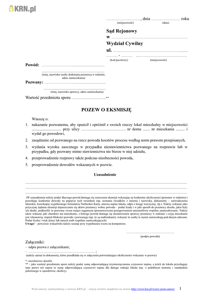 ……..……………………….., (miejscowość) dnia ……….………………… roku (data) Sąd Rejonowy w …………………………………………..……………………….… Wydział Cywilny ul. ……..………………………………………………………........... ………… - ………… (kod pocztowy) Powód: .....………………………………………….. (miejscowość) …………………………................................................ ........................................................................................ (imię, nazwisko osoby dotkniętej przemocą w rodzinie, adres zamieszkania) Pozwany: ………………………….............................................. ....................................................................................... (imię, nazwisko sprawcy, adres zamieszkania) Wartość przedmiotu sporu ................................................** POZEW O EKSMISJĘ Wnoszę o: 1. nakazanie pozwanemu, aby opuścił i opróżnił z swoich rzeczy lokal mieszkalny w miejscowości .............................. przy ulicy ……………………………. nr domu ....... nr mieszkania ......... i wydał go powodowi, 2. zasądzenie od pozwanego na rzecz powoda kosztów procesu według norm prawem przepisanych, 3. wydania wyroku zaocznego w przypadku niestawiennictwa pozwanego na rozprawie lub w przypadku, gdy pozwany mimo stawiennictwa nie bierze w niej udziału, 4. przeprowadzenie rozprawy także podczas nieobecności powoda, 5. przeprowadzenie dowodów wskazanych w pozwie. Uzasadnienie .................................................................................................................................................................................................................................. .................................................................................................................................................................................................................................. .................................................................................................................................................................................................................................. (W uzasadnieniu należy podać dlaczego powód domaga się orzeczenia eksmisji wskazując na konkretne okoliczności (przemoc w rodzinie) i powołując konkretne dowody na poparcie tych twierdzeń (np. zeznania świadków z imienia i nazwiska, dokumenty – zaświadczenie lekarskie, kserokopię wypełnionego formularza Niebieskie Karty, umowę najmu lokalu, odpis z księgi wieczystej, itp.). Należy wskazać jako przyczynę żądania eksmisji dopuszczanie się aktów przemocy wobec powoda – podać kiedy i w jaki sposób do przemocy doszło, jakie były ich skutki, podkreślić że pozwany swym rażąco nagannym (przemocowym) postępowaniem uniemożliwia wspólne zamieszkiwanie. Należy także wskazać jaki charakter ma mieszkanie, z którego powód domaga się eksmitowania sprawcy przemocy w rodzinie i czyją mieszkanie jest własnością; stopień bliskości powoda i pozwanego (np. że są małżonkami), wskazać że osoby te razem zamieszkują pod danym adresem. Podać liczbę i wiek dzieci lub innych osób wspólnie zamieszkujących) Uwaga! – powyższe wskazówki należy usunąć przy wypełnianiu wzoru na komputerze. …………………………………………... (podpis powoda) Załączniki: - odpis pozwu z załącznikami; - ………………………………………………………….… ; (należy opisać tu dokumenty, które przedkłada się w załączeniu potwierdzające okoliczności wskazane w pozwie) *- niewłaściwe skreślić. ** - jako wartość przedmiotu sporu należy podać sumę odpowiadającą trzymiesięcznemu czynszowi najmu, a jeżeli do lokalu przysługuje inne prawo niż najem to sumę odpowiadającą czynszowi najmu dla danego rodzaju lokalu (np. o podobnym metrażu i standardzie położonego w sąsiedztwie, okolicy). Wzór umowy został pobrany z serwisu KRN.pl – więcej wzorów znajdziesz na stronie http://www.krn.pl/wzory-pism-umow/ 1