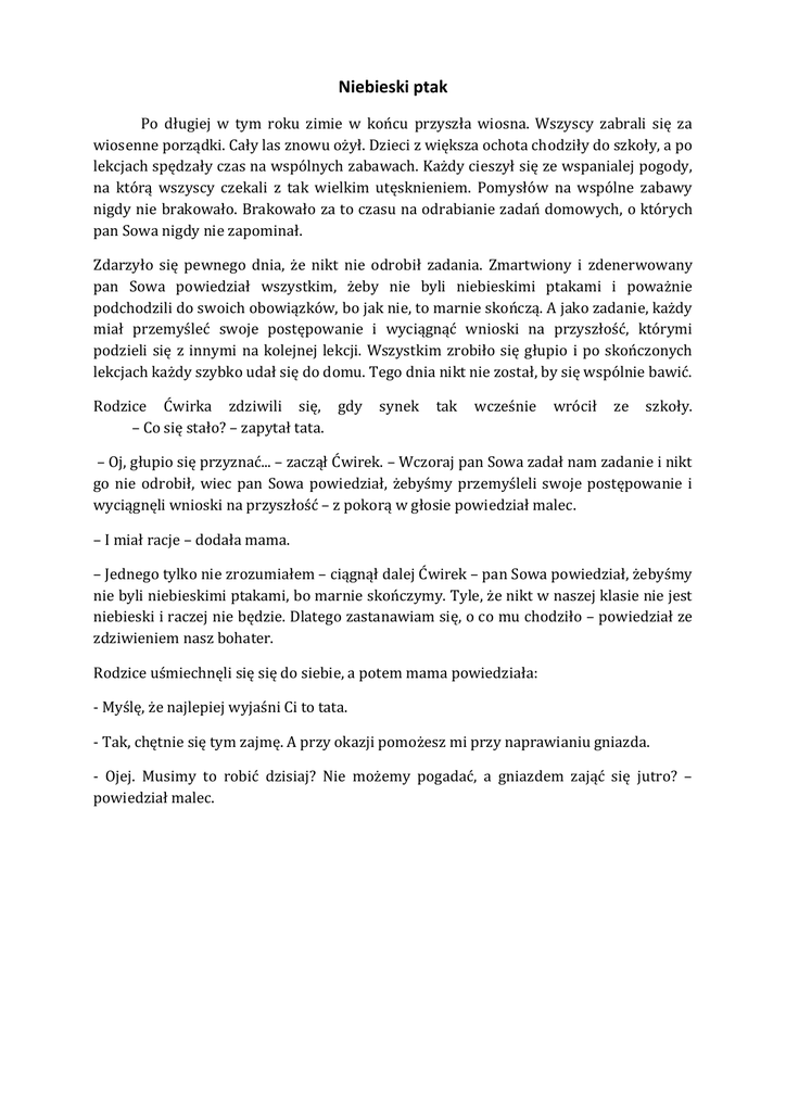 Niebieski ptak Po długiej w tym roku zimie w końcu przyszła wiosna. Wszyscy zabrali się za wiosenne porządki. Cały las znowu ożył. Dzieci z większa ochota chodziły do szkoły, a po lekcjach spędzały czas na wspólnych zabawach. Każdy cieszył się ze wspanialej pogody, na którą wszyscy czekali z tak wielkim utęsknieniem. Pomysłów na wspólne zabawy nigdy nie brakowało. Brakowało za to czasu na odrabianie zadań domowych, o których pan Sowa nigdy nie zapominał. Zdarzyło się pewnego dnia, że nikt nie odrobił zadania. Zmartwiony i zdenerwowany pan Sowa powiedział wszystkim, żeby nie byli niebieskimi ptakami i poważnie podchodzili do swoich obowiązków, bo jak nie, to marnie skończą. A jako zadanie, każdy miał przemyśleć swoje postępowanie i wyciągnąć wnioski na przyszłość, którymi podzieli się z innymi na kolejnej lekcji. Wszystkim zrobiło się głupio i po skończonych lekcjach każdy szybko udał się do domu. Tego dnia nikt nie został, by się wspólnie bawić. Rodzice Ćwirka zdziwili się, gdy – Co się stało? – zapytał tata. synek tak wcześnie wrócił ze szkoły. – Oj, głupio się przyznać... – zaczął Ćwirek. – Wczoraj pan Sowa zadał nam zadanie i nikt go nie odrobił, wiec pan Sowa powiedział, żebyśmy przemyśleli swoje postępowanie i wyciągnęli wnioski na przyszłość – z pokorą w głosie powiedział malec. – I miał racje – dodała mama. – Jednego tylko nie zrozumiałem – ciągnął dalej Ćwirek – pan Sowa powiedział, żebyśmy nie byli niebieskimi ptakami, bo marnie skończymy. Tyle, że nikt w naszej klasie nie jest niebieski i raczej nie będzie. Dlatego zastanawiam się, o co mu chodziło – powiedział ze zdziwieniem nasz bohater. Rodzice uśmiechnęli się się do siebie, a potem mama powiedziała: - Myślę, że najlepiej wyjaśni Ci to tata. - Tak, chętnie się tym zajmę. A przy okazji pomożesz mi przy naprawianiu gniazda. - Ojej. Musimy to robić dzisiaj? Nie możemy pogadać, a gniazdem zająć się jutro? – powiedział malec. - Nie – stanowczo odpowiedział tata. – Dziś jest dobra pogoda i nie ma, co czekać z pracą, bo nie wiadomo, co będzie jutro. - Nooo dobrze – niechętnie odpowiedział Ćwirek I tak obaj zabrali się do pracy. A, że zima w tym roku była długa i śnieżna było, co naprawiać. Przede wszystkim trzeba było pouzupełniać wszelkie ubytki i szpary. Stare gałązki wymienić na nowe i wzmocnić całą konstrukcję zanim przyjdą pierwsze wiosenne burze. Kiedy to wszystko będzie gotowe mama wreszcie zajmie się upiększaniem i dekorowaniem rodzinnego gniazda. Jednak nawet w ferworze pracy mały wróbelek pamiętał, że tata miał mu coś wyjaśnić. - No więc, o co chodzi z tymi niebieskimi ptakami? - Właściwie to nie z ptakami, ale z ptakiem. Jednym niebieskim ptakiem. – zaczął tata. Żyła kiedyś dawno temu bardzo biedna rodzina niebieskich ptaków. Ich największym skarbem był ich syn. Byli z niego bardzo dumni. Był bardzo zdolny, inteligentny i błyskotliwy. Dobrze się uczył i miał mnóstwo przyjaciół. W dodtku przepięknie śpiewał. Wszystko wskazywało na to, że będzie kimś wielkim i osiągnie w życiu to, czego nigdy nie udało się osiągnąć żadnemu niebieskiemu ptakowi. Wydawało się, że przejdzie do historii i pamięć o nim nigdy nie zaginie. - I co się z nim stało – zapytał zaciekawiony Ćwirek. - Wszystko układało się wspaniale, ale do czasu. Najpierw zaczął opuszczać lekcje twierdząc, że niczego nowego się nie dowie się. Całymi dniami siedział w domu nic nie robiąc. Wszystko odkładał na później. Często obiecywał, ze komuś pomoże, a potem o tym zapominał. Inni przebaczali mu, bo nie mogli oprzeć sie jego urokowi, a jemu wszystko uchodziło płazem. Z czasem stał sie arogancki i zarozumiały. Wydawało mu się, że juz wszystko wie i nic nie musi robić. Uważał się za najmądrzejszego ptaka w okolicy. Jednak inne ptaki coraz rzadziej prosiły go o cokolwiek, bo wiedziały, że nie można na niego liczyć. Rzadko dotrzymywał danego słowa. Mało, kto go odwiedzał, a jego życie stało się bardzo chaotyczne, nieuporządkowane. Coraz częściej dochodziło do różnych sprzeczek, kłótni i konfliktów z najbliższymi i przyjaciółmi. W konsekwencji wszyscy się od niego odwrócili i nie chcieli mieć z nim nic do czynienia. Cała mądrość i inteligencja jakby z niego wyparowała. Często mówił coś od rzeczy, niezrozumiale. Nikt nie chciał go słuchać. Do tego wszystkiego zaczął chorować. Stal się ospałym, wiecznie niezadowolonym i ciągle narzekającym ptakiem. I tak, kiedy zabrakło jego rodziców juz nikt się nim nie przejmował. Wszyscy jakby o nim zapomnieli. Ptaki omijały jego gniazdo, bo było w opłakanym stanie i wręcz odstraszało swoim wygładem. Nikt też nie wie, co się z nim stało. Od tego czasu wszystkie ptaki powtarzają sobie tę historię, jako przestrogę przed lenistwem. - Lenistwem? – zapytał Ćwirek. - Tak, lenistwem. Bo widzisz lenistwo to straszna choroba, która grozi każdemu z nas. To choroba ciała i duszy. I żeby nie stało się z nami jak z niebieskim ptakiem musimy codziennie stawiać sobie cele i zadania do wykonania. Dzięki temu uczymy się wytrwałości, solidności i pracowitości. Dzięki temu ciągle się rozwijamy, nasze życie staje się uporządkowane a my sami stajemy się coraz lepszymi. Praca i działaniem okazujemy tez miłość. Jak nam na kimś zależy to chcemy to jakoś pokazać a najlepszym sposobem na to nie są same słowa, ale słowa poparte czynami, działaniem, praca? Wtedy ta druga osoba wie, ze nasza słowa nie są puste i naprawdę nam na niej zależy. - Rzeczywiście to niesamowite, co mówisz. Ale wiesz mnie się czasem tak nic nie chce robić, że to jest ode mnie silniejsze. Czy to znaczy, że już mnie dopadała ta choroba? - Nie. Na szczęście nie. Każdemu z nas czasem się czegoś nie chce zro