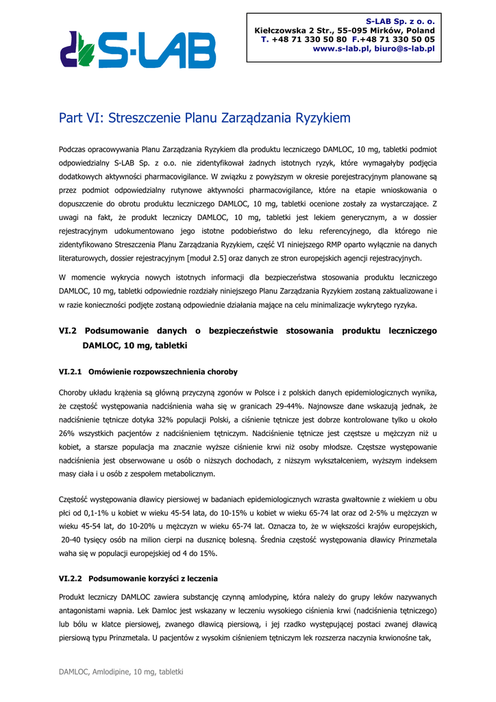 S-LAB Sp. z o. o. Kiełczowska 2 Str., 55-095 Mirków, Poland T. +48 71 330 50 80 F.+48 71 330 50 05 www.s-lab.pl, [email protected] Part VI: Streszczenie Planu Zarządzania Ryzykiem Podczas opracowywania Planu Zarządzania Ryzykiem dla produktu leczniczego DAMLOC, 10 mg, tabletki podmiot odpowiedzialny S-LAB Sp. z o.o. nie zidentyfikował żadnych istotnych ryzyk, które wymagałyby podjęcia dodatkowych aktywności pharmacovigilance. W związku z powyższym w okresie porejestracyjnym planowane są przez podmiot odpowiedzialny rutynowe aktywności pharmacovigilance, które na etapie wnioskowania o dopuszczenie do obrotu produktu leczniczego DAMLOC, 10 mg, tabletki ocenione zostały za wystarczające. Z uwagi na fakt, że produkt leczniczy DAMLOC, 10 mg, tabletki jest lekiem generycznym, a w dossier rejestracyjnym udokumentowano jego istotne podobieństwo do leku referencyjnego, dla którego nie zidentyfikowano Streszczenia Planu Zarządzania Ryzykiem, część VI niniejszego RMP oparto wyłącznie na danych literaturowych, dossier rejestracyjnym [moduł 2.5] oraz danych ze stron europejskich agencji rejestracyjnych. W momencie wykrycia nowych istotnych informacji dla bezpieczeństwa stosowania produktu leczniczego DAMLOC, 10 mg, tabletki odpowiednie rozdziały niniejszego Planu Zarządzania Ryzykiem zostaną zaktualizowane i w razie konieczności podjęte zostaną odpowiednie działania mające na celu minimalizacje wykrytego ryzyka. VI.2 Podsumowanie danych o bezpieczeństwie stosowania produktu leczniczego DAMLOC, 10 mg, tabletki VI.2.1 Omówienie rozpowszechnienia choroby Choroby układu krążenia są główną przyczyną zgonów w Polsce i z polskich danych epidemiologicznych wynika, że częstość występowania nadciśnienia waha się w granicach 29-44%. Najnowsze dane wskazują jednak, że nadciśnienie tętnicze dotyka 32% populacji Polski, a ciśnienie tętnicze jest dobrze kontrolowane tylko u około 26% wszystkich pacjentów z nadciśnieniem tętniczym. Nadciśnienie tętnicze jest częstsze u mężczyzn niż u kobiet, a starsze populacja ma znacznie wyższe ciśnienie krwi niż osoby młodsze. Częstsze występowanie nadciśnienia jest obserwowane u osób o niższych dochodach, z niższym wykształceniem, wyższym indeksem masy ciała i u osób z zespołem metabolicznym. Częstość występowania dławicy piersiowej w badaniach epidemiologicznych wzrasta gwałtownie z wiekiem u obu płci od 0,1-1% u kobiet w wieku 45-54 lata, do 10-15% u kobiet w wieku 65-74 lat oraz od 2-5% u mężczyzn w wieku 45-54 lat, do 10-20% u mężczyzn w wieku 65-74 lat. Oznacza to, że w większości krajów europejskich, 20-40 tysięcy osób na milion cierpi na dusznicę bolesną. Średnia częstość występowania dławicy Prinzmetala waha się w populacji europejskiej od 4 do 15%. VI.2.2 Podsumowanie korzyści z leczenia Produkt leczniczy DAMLOC zawiera substancję czynną amlodypinę, która należy do grupy leków nazywanych antagonistami wapnia. Lek Damloc jest wskazany w leczeniu wysokiego ciśnienia krwi (nadciśnienia tętniczego) lub bólu w klatce piersiowej, zwanego dławicą piersiową, i jej rzadko występującej postaci zwanej dławicą piersiową typu Prinzmetala. U pacjentów z wysokim ciśnieniem tętniczym lek rozszerza naczynia krwionośne tak, DAMLOC, Amlodipine, 10 mg, tabletki S-LAB Sp. z o. o. Kiełczowska 2 Str., 55-095 Mirków, Poland T. +48 71 330 50 80 F.+48 71 330 50 05 www.s-lab.pl, [email protected] że krew ma łatwiejszy przepływ. U pacjentów z chorobą niedokrwienną serca, lek Damloc ułatwia dopływ krwi do mięśnia sercowego zwiększając ilość dostarczanego tlenu, co w rezultacie zapobiega bólowi w klatce piersiowej. • W badaniu wzięło udział 152 pacjentów z łagodnym i umiarkowanym nadciśnieniem samoistnym, amlodypinę podawano w dawce 5 do 10 mg/dobę przez 24 tygodni. Średnie tętnicze ciśnienie krwi, znacząco spadło z 123,9 +/- 0,6 na początku badania do 102,3 +/- 0,8 mm Hg, na koniec badania. [Kokot F et al, 1995, M.2.5.] • W celu oceny skuteczności amlodypiny przeprowadzono badanie kliniczne u 20 pacjentów ze stabilną, przewlekłą dławicą piersiową. Amlodypinę podawano w dawce początkowej 5 mg raz na dobę, którą po 2 tygodniach zwiększono do 10 mg raz na dobę, jeśli u pacjenta nadal występował jeden atak dławicowy/tydzień. Po czterech tygodniach leczenia amlodypiną odnotowano znaczne zmniejszenie średniej liczby ataków dusznicy/tydzień. [Petkar S et al, 1994, M.2.5] • 52 pacjentów z naczynioskurczową dławicą piersiową (typu Prinzmetala) zostało poddanych badaniu. Pacjenci zostali losowo przydzieleni do grupy otrzymującej amlodypinę (10 mg) lub placebo codziennie przez 4 tygodnie. 24 pacjentów otrzymywało amlodypinę, a 28 pacjentów placebo. Liczba epizodów dusznicowych znacznie się zmniejszyła w porównaniu z placebo amlodypiny. [Chahine RA et al., 1993, M.2.5] Amlodypina jest skuteczna i dobrze tolerowana przy stosowaniu pojedynczo lub w połączeniu z innymi lekami stosowanymi w leczeniu nadciśnienia i dławicy piersiowej. VI.2.3 Nieznane informacje dotyczące korzyści z leczenia • Ciąża: Nie ustalono bezpieczeństwa stosowania amlodypiny u kobiet w ciąży. Badania na zwierzętach wykazały szkodliwy wpływ na reprodukcję, po zastosowaniu dużych dawek produktu. Stosowanie amlodypiny w ciąży jest możliwe tylko w przypadkach, gdy nie ma innego, bezpieczniejszego produktu oraz gdy choroba jest związana z większym ryzykiem dla matki i płodu. • Karmienie piersią: Nie wiadomo, czy amlodypina jest wydzielana do mleka matki. Decyzję o kontynuowaniu/zaprzestaniu karmienia piersią lub kontynuowaniu/zaprzestaniu leczenia amlodypiną należy podejmować po rozważeniu korzyści wynikających z karmienia piersią dla dziecka oraz leczenia amlodypiną dla matki. • Populacja pediatryczna: Wpływ amlodypiny na ciśnienie krwi u pacjentów poniżej 6. roku życia nie jest znany. VI.2.4 Po