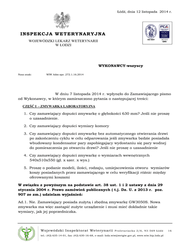Wyjaśnienia treści SIWZ - Wojewódzki Inspektorat Weterynarii w Łodzi