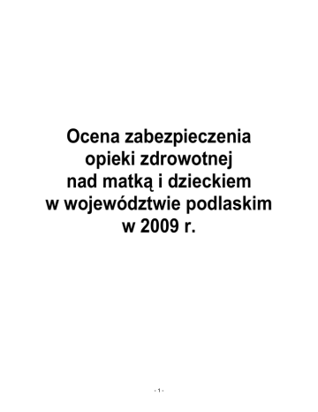 Ocena zabezpieczenia opieki zdrowotnej nad matką i dzieckiem w województwie podlaskim w 2009 r. -1- SPIS TREŚCI I. WSTĘP _______________________________________________________________________ 4 II. Zabezpieczenie opieki zdrowotnej nad dziećmi _____________________________________ 5 1. Dane demograficzne____________________________________________________________ 5 − − − 2. Podstawowa opieka zdrowotna___________________________________________________ 7 − − − 3. Opieka profilaktyczna nad dziećmi do lat 3 ............................................................................................... 7 Dane o stanie zdrowia dzieci w wieku od 0 do 5 roku Ŝycia będących pod opieką lekarzy podstawowej opieki zdrowotnej na podstawie MZ – 11............................................................................. 8 Analiza danych dotyczących stanu zdrowia dzieci w wieku od 0 do 5 lat będących pod opieką lekarzy podstawowej opieki zdrowotnej .................................................................................................... 9 Zatrudnienie w podstawowej opiece zdrowotnej ___________________________________ 10 − 4. Populacja dzieci i młodzieŜy...................................................................................................................... 5 Kadra......................................................................................................................................................... 6 Lecznictwo szpitalne. ................................................................................................................................ 6 Pielęgniarki zatrudnione w poz................................................................................................................ 10 Zabezpieczenie profilaktycznej opieki zdrowotnej nad uczniami przez pielęgniarki i higienistki szkolne w roku szkolnym 2008/2009_________________________ 12 − − − Szkoły w województwie........................................................................................................................... 12 Szkoły publiczne w mieście i na wsi........................................................................................................ 13 Szkoły niepubliczne w mieście i na wsi ................................................................................................... 14 5. Zakres opieki zdrowotnej realizowany w szkołach w roku szkolnym 2008/2009 __________ 15 6. Profilaktyczna opieka zdrowotna nad dziećmi i młodzieŜą w wieku szkolnym ___________ 16 − − − Profilaktyczne badanie lekarskie uczniów ma podstawie MZ – 06.......................................................... 16 Kwalifikacje pielęgniarek szkolnych ........................................................................................................ 17 Profilaktyczne badania lekarskie uczniów na podstawie MZ – 11........................................................... 17 7. Pielęgniarki pracujące w zakładach opieki zdrowotnej oraz praktykach indywidualnych i grupowych____________________________________________________ 18 8. Stan zdrowia dzieci i młodzieŜy w wieku od 5 do 18 lat będących pod opieką lekarzy podstawowej opieki zdrowotnej na podstawie MZ – 11________________________ 19 − 9. Analiza stanu zdrowia dzieci i młodzieŜy w wieku od 5 do 18 lat będących pod opieką lekarzy podstawowej opieki zdrowotnej na podstawie MZ – 11. ............................................................. 20 Profilaktyczna opieka zdrowotna nad dziećmi do lat 6_______________________________ 21 − − − − Profilaktyczna opieka lekarska nad dziećmi do lat 3 w 2009 roku........................................................... 21 Profilaktyczne wizyty pielęgniarek i połoŜnych u noworodków, niemowląt i dzieci do 3 roku Ŝycia w 2009 roku............................................................................................................................................. 22 Profilaktyczne wizyty połoŜnych w 2009 r. .............................................................................................. 22 Profilaktyczne badania lekarskie dzieci do 6 roku Ŝycia w 2009 roku ..................................................... 23 -2- 10. Ocena opieki zdrowotnej nad matką i dzieckiem. Część ginekologiczno-połoŜnicza________________________________________________ 24 − − PołoŜne pracujące w zakładach opieki zdrowotnej oraz praktykach indywidualnych i grupowych.......... 24 PołoŜne pracujące w podstawowej opiece zdrowotnej............................................................................ 25 11. Opieka okołoporodowa nad matką dzieckiem − − − − − Działalność oddziałów............................................................................................................................. 26 Porody, poronienia i stanowiska porodowe............................................................................................. 27 Liczba noworodków................................................................................................................................. 28 Zgony kobiet w okresie okołoporodowym ............................................................................................... 29 Przerwania ciąŜ....................................................................................................................................... 30 12. Specjalistyczna opieka nad matką i dzieckiem _____________________________________ 30 − Liczba porad i poradni............................................................................................................................. 30 13. Opieka profilaktyczna nad kobietą w poradniach dla kobiet __________________________ 32 − Badania cytodiagnostyczne..................................................................................................................... 32 -3- WSTĘP Popu