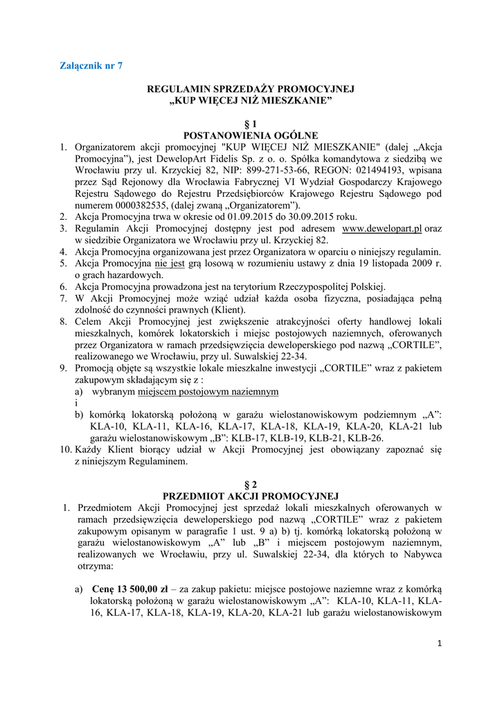 Załącznik nr 7 REGULAMIN SPRZEDAŻY PROMOCYJNEJ „KUP WIĘCEJ NIŻ MIESZKANIE” §1 POSTANOWIENIA OGÓLNE 1. Organizatorem akcji promocyjnej "KUP WIĘCEJ NIŻ MIESZKANIE" (dalej „Akcja Promocyjna”), jest DewelopArt Fidelis Sp. z o. o. Spółka komandytowa z siedzibą we Wrocławiu przy ul. Krzyckiej 82, NIP: 899-271-53-66, REGON: 021494193, wpisana przez Sąd Rejonowy dla Wrocławia Fabrycznej VI Wydział Gospodarczy Krajowego Rejestru Sądowego do Rejestru Przedsiębiorców Krajowego Rejestru Sądowego pod numerem 0000382535, (dalej zwaną „Organizatorem”). 2. Akcja Promocyjna trwa w okresie od 01.09.2015 do 30.09.2015 roku. 3. Regulamin Akcji Promocyjnej dostępny jest pod adresem www.dewelopart.pl oraz w siedzibie Organizatora we Wrocławiu przy ul. Krzyckiej 82. 4. Akcja Promocyjna organizowana jest przez Organizatora w oparciu o niniejszy regulamin. 5. Akcja Promocyjna nie jest grą losową w rozumieniu ustawy z dnia 19 listopada 2009 r. o grach hazardowych. 6. Akcja Promocyjna prowadzona jest na terytorium Rzeczypospolitej Polskiej. 7. W Akcji Promocyjnej może wziąć udział każda osoba fizyczna, posiadająca pełną zdolność do czynności prawnych (Klient). 8. Celem Akcji Promocyjnej jest zwiększenie atrakcyjności oferty handlowej lokali mieszkalnych, komórek lokatorskich i miejsc postojowych naziemnych, oferowanych przez Organizatora w ramach przedsięwzięcia deweloperskiego pod nazwą „CORTILE”, realizowanego we Wrocławiu, przy ul. Suwalskiej 22-34. 9. Promocją objęte są wszystkie lokale mieszkalne inwestycji „CORTILE” wraz z pakietem zakupowym składającym się z : a) wybranym miejscem postojowym naziemnym i b) komórką lokatorską położoną w garażu wielostanowiskowym podziemnym „A”: KLA-10, KLA-11, KLA-16, KLA-17, KLA-18, KLA-19, KLA-20, KLA-21 lub garażu wielostanowiskowym „B”: KLB-17, KLB-19, KLB-21, KLB-26. 10. Każdy Klient biorący udział w Akcji Promocyjnej jest obowiązany zapoznać się z niniejszym Regulaminem. §2 PRZEDMIOT AKCJI PROMOCYJNEJ 1. Przedmiotem Akcji Promocyjnej jest sprzedaż lokali mieszkalnych oferowanych w ramach przedsięwzięcia deweloperskiego pod nazwą „CORTILE” wraz z pakietem zakupowym opisanym w paragrafie 1 ust. 9 a) b) tj. komórką lokatorską położoną w garażu wielostanowiskowym „A” lub „B” i miejscem postojowym naziemnym, realizowanych we Wrocławiu, przy ul. Suwalskiej 22-34, dla których to Nabywca otrzyma: a) Cenę 13 500,00 zł – za zakup pakietu: miejsce postojowe naziemne wraz z komórką lokatorską położoną w garażu wielostanowiskowym „A”: KLA-10, KLA-11, KLA16, KLA-17, KLA-18, KLA-19, KLA-20, KLA-21 lub garażu wielostanowiskowym 1 ”B”: KLB-17, KLB-19, KLB-21, KLB-26 w harmonogramie płatności typu „standard”. §3 ZASADY AKCJI PROMOCYJNEJ 1. Z Akcji Promocyjnej „KUP WIĘCEJ NIŻ MIESZKANIE” mogą skorzystać Klienci, którzy: a) w okresie od 01.09.2015 do 30.09.2015 roku zawrą z Organizatorem umowę deweloperską, b) w okresie od 01.09.2015 do 30.09.2015 roku zawrą z Organizatorem aneks do zawartej już umowy deweloperskiej, c) przedmiotem umowy opisanej w paragrafie 3 ust.1a) będzie zakup jednego z lokali mieszkalnych wraz z pakietem: miejsce postojowe naziemne i komórka lokatorska położona w garażu wielostanowiskowym „A” lub „B” z uwzględnieniem rabatu opisanego w § 2 ust. 1a) d) przedmiotem aneksu do umowy deweloperskiej opisanej w paragrafie 3 ust.1b) będzie dokupienie pakietu: miejsce postojowe naziemne i komórka lokatorska położona w garażu wielostanowiskowym „A” lub „B” z uwzględnieniem rabatu opisanego w § 2 ust. 1a) c) promocja dotyczy tylko lokali mieszkalnych, miejsc postojowych naziemnych i komórek lokatorskich realizowanych w ramach przedsięwzięcia deweloperskiego pod nazwą „CORTILE”, d) promocja dotyczy tylko lokali mieszkalnych, miejsc postojowych naziemnych i komórek lokatorskich nabywanych w harmonogramie płatności typu „standard”. e) Organizator oferuje w ramach Akcji Promocyjnej „KUP WIĘCEJ NIŻ MIESZKANIE” lokale mieszkalne wraz z pakietem składającym się z komórki lokatorskiej położonej w garażu wielostanowiskowym „A” nr: KLA-10, KLA-11, KLA-16, KLA-17, KLA-18, KLA-19, KLA-20, KLA-21 i garażu wielostanowiskowym ”B”: KLB-17, KLB-19, KLB21, KLB-26 wraz z miejscem postojowym naziemnym, do których dodatkowo zostanie przekazany rabat opisany w § 2 pkt. 1a) – przy zakupie w harmonogramie płatności typu „standard”. 2. Przyznany w ramach Akcji Promocyjnej „KUP WIĘCEJ NIŻ MIESZKANIE” upust cenowy nie podlegają wymianie na równowartość pieniężną. 3. Akcja Promocyjna „KUP WIĘCEJ NIŻ MIESZKANIE” łączy się z innymi Promocjami prowadzonymi aktualnie dla inwestycji „ CORTILE”. §4 ODPOWIEDZIALNOŚĆ I REKLAMACJE ZWIĄZANE Z AKCJĄ PROMOCYJNĄ „KUP WIECEJ NIŻ MIESZKANIE” 1. Organizator nie ponosi odpowiedzialności za nieprawidłowe wyświetlanie strony internetowej lub inne utrudnienia spowodowane z przyczyn niezależnych od Organizatora. 2. W przypadku, o którym mowa w ust. 1 powyżej Klientowi nie przysługują wobec Organizatora, żadne roszczenia. 2 1. 2. 3. 4. 5. 6. §5 POSTANOWIENIA KOŃCOWE Udział Klienta w Akcji Promocyjnej oznacza akceptację jej zasad zawartych w niniejszym Regulaminie. Organizator nie ponosi odpowiedzialności za problemy techniczne utrudniające lub uniemożliwiające udział w Akcji Promocyjnej. Organizator zastrzega sobie prawo do skrócenia lub wydłużenia Akcji Promocyjnej, o czym zawiadomi poprzez ogłoszenie na stronie www.dewelopart.pl przynajmniej na 3 dni przed planowanym skróceniem lub wydłużeniem Akcji Promocyjnej. Skrócenie Akcji Promocyjnej nie narusza praw już nabytych przez Klientów. Organizator zastrzega sobie prawo do zmiany Regulaminu w czasie trwania Akcji Promocyjnej, z tym, że zmiany te nie naruszają praw już nabytych przez Klientów. W sprawach nieuregulowanych Regulam