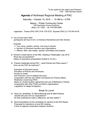 “To be useful for the nation (and Polonia) ” 1755 – 1826 Stanisław Staszic Agenda of Northeast Regional Meeting of PAC Saturday – October 10, 2015 -- 10 AM to ~ 6 PM Albany – Polish Community Center 225 Washington Avenue Extension Albany, NY 12205 - tel. 518-456-3995 organizers: Teresa (PAC-CNY) 518- 272-5727, Zbyszek (PAC-LI) 718-343-4316 1) Let us know each other: participants will have 5 min. to introduce themselves and their division. Example: Your name, position, activity, how long in division Number of individual members and organizations Officers, NDs, web master, specific committees and projects 2) Division’s observations of the NDs’ meeting in Washington July 2015: What was accomplished? Status of resolutions (presentation limited to 10 min.) 3) Present challenges facing PAC – what Polonia and Poles expect ? How can the PAC be improved ? Examples of important issues: Education of Polonia and Americans, Access to media, Anti-Polonism, how to address the issue, Cooperation with the new Polish Commission for Polonia Affairs, Restitution concerning WWII, Status of double taxation agreement and use of Medicare in Poland, Cooperating with other Polish and ethnic organizations, Legislation on illegal immigration. Break for Lunch 4) Have our candidates, Dr Maria Binienda and Dr Mark Pienkos elected last year met our expectations? Do their publications make a difference, are they helpful ? 5) Recommendations of the candidates for election to the PAC Board. Proposals for resolutions at next ND meeting. Future of regional cooperation between divisions. . 21 sierpnia, 2015 Szanowni Państwo, Wydział Centralny KPA oraz Wydział Long Island serdecznie zapraszają na: Zebranie Regionowe Wydziałów KPA (wg zaleceń ZG, zamiast drugiego w tym roku zjazdu DK) w Polish Community Center - 225 Washington Avenue Extension Albany, NY 12205 tel. do centrum 518-456-3995 sobota - 10 paździermika, 2015 r. Rejestracja po przybyciu (w tym obiad) = 30 $. Ubiór "casual", czyli garnitury niepotrzebne - to jest zebranie robocze. Celem konferencji jest: 1) Wymiana doswiadczeń 2) Wspólpraca przy realizacji projektów 3) Przygotowanie się do przyszłorocznego Zjazdu Delegatów Uczestnicy konferencji mogą: - być biernymi obserwatorami, - brać udział w dyskusji, - przedstawiać pomysły, projekty, etc. Proszę o uzgodnienie między soba w wydziale ; kto i o czym będzie mówił i przygotować sie do prezentacji. Jest dużo spraw do omówienia - czas mamy ograniczony. Można mówić po polsku lub angielsku, jak komu wygodnie. Goście mile widziani. Jest możliwość noclegu w pobliskich hotelach, jak też zwiedzania i wypoczynku. Jeśli Ty lub ktoś z Twego wydziału wybiera sie do Albany Proszę nas powiadomić. Musimy wiedzieć ile osób przyjedzie. Serdecznie zapraszamy, Zbyszek Koralewski Sekretarz, KPA-LI 718 -343-4316 Uwaga: Agenda i zaproszenie zostały zatwierdzone przez prezesa PAC-LI “Być narodowi (i Polonii) użytecznym” 1755 – 1826 Stanisław Staszic Agenda spotkania Regionalnego KPA Sobota – 10 października, 2015 -- od 10 rano do 18 Albany – Polish Community Center 225 Washington Avenue Extension Albany, NY 12205 - tel. do centrum 518-456-3995 organizatorzy: Teresa (KPA-CNY) 518- 272-5727, Zbyszek (KPA-LI) 718-343-4316 1) Poznajmy się: Uczestnicy będą mieć 5 min. na przedstawienie siebie i ich wydziałów Na przykład: Imię pozycja, działalność, jak długo w wydziale Ilość członków indywidualnych i organizacji Członkowie zarządu, Dyrektorzy Krajowi, kto jest odpowiedzialny za stronę internetową, komitety/zespoły i ich projekty 2) Obserwacje ze spotkania Dyrektorów Krajowych w lipcu w Waszyngtonie. Co zostało osiągnięte ? Status rezolucji (prezentacje ograniczone do 10 min.) 3) Wyzwania stojące obecnie przed KPA – co Polonia I Polacy oczekują? Jak działalność KPA może być usprawniona ? Co mogą zrobić wydziały, a czym powinien zająć się ZG ? Przykłady spraw ważnych: Edukacja Polonii i Amerykanów Akces do mediów Anti-Polonism, jak do tego podejść Kooperacja z nową Komisją d/s Polonii Restytucje związane z II WŚ Status umowy o podwójnym opodatkowaniu i Medicare w Poland. Kooperacja z polskimi I innymi organizacjami Sprawa nielegalnych emigrantów. Przerwa na Obiad 4) Czy nasi kandydaci, Dr Maria Binienda i Dr Mark Pienkos wybrani w zeszłym roku spełniają nasze oczekiwania? Czy ich publikacje przyniosły zmiany, czy są one pomocne ? 5) Rekomendacje na pozycje w zarządzie KPA. Propozycje rezolucji na następne spotkanie Dyrektorów Krajowych. Przyszłość regionalnej współpracy między wydziałami.