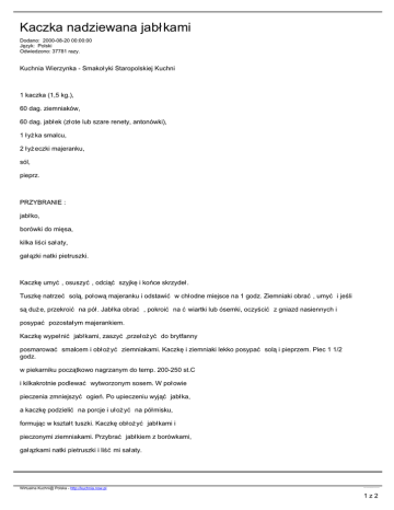 Kaczka nadziewana jabłkami Dodano: 2000-08-20 00:00:00 Język: Polski Odwiedzono: 37781 razy. Kuchnia Wierzynka - Smakołyki Staropolskiej Kuchni 1 kaczka (1,5 kg.), 60 dag. ziemniaków, 60 dag. jabłek (złote lub szare renety, antonówki), 1 łyżka smalcu, 2 łyżeczki majeranku, sól, pieprz. PRZYBRANIE : jabłko, borówki do mięsa, kilka liści sałaty, gałązki natki pietruszki. Kaczkę umyć, osuszyć, odciąć szyjkę i końce skrzydeł. Tuszkę natrzeć solą, połową majeranku i odstawić w chłodne miejsce na 1 godz. Ziemniaki obrać, umyć i jeśli są duże, przekroić na pół. Jabłka obrać , pokroić na ćwiartki lub ósemki, oczyścić z gniazd nasiennych i posypać pozostałym majerankiem. Kaczkę wypełnić jabłkami, zaszyć,przełożyć do brytfanny posmarować smalcem i obłożyć ziemniakami. Kaczkę i ziemniaki lekko posypać solą i pieprzem. Piec 1 1/2 godz. w piekarniku początkowo nagrzanym do temp. 200-250 st.C i kilkakrotnie podlewać wytworzonym sosem. W połowie pieczenia zmniejszyć ogień. Po upieczeniu wyjąć jabłka, a kaczkę podzielić na porcje i ułożyć na półmisku, formując w kształt tuszki. Kaczkę obłożyć jabłkami i pieczonymi ziemniakami. Przybrać jabłkiem z borówkami, gałązkami natki pietruszki i liśćmi sałaty. Wirtualna Kuchni@ Polska - http://kuchnia.now.pl przepis nr 206, plik wygenerowano 2017.03.07 02:52 1z2 :D:D:D: Nadesłał(a):pokk 2006-05-23 21:05:41 Przepisane kropka w kropke z książki kucharskiej która jest w necie Nadesłał(a): 2009-11-21 09:11:41 Wirtualna Kuchni@ Polska - http://kuchnia.now.pl przepis nr 206, plik wygenerowano 2017.03.07 02:52 2z2
