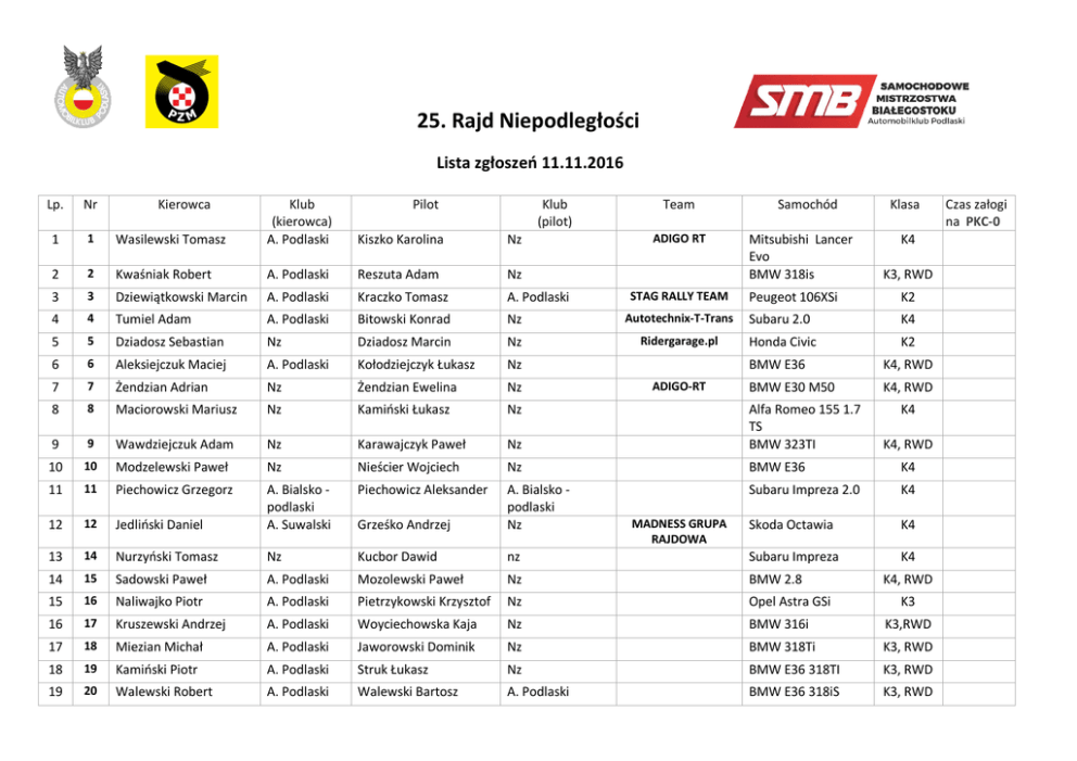 25. Rajd Niepodległości Lista zgłoszeń 11.11.2016 Lp. Nr 1 1 2 Kierowca Wasilewski Tomasz Klub (kierowca) A. Podlaski Pilot Klub (pilot) Team Kiszko Karolina Nz 2 Kwaśniak Robert A. Podlaski Reszuta Adam Nz 3 3 Dziewiątkowski Marcin A. Podlaski Kraczko Tomasz A. Podlaski 4 4 Tumiel Adam A. Podlaski Bitowski Konrad Nz 5 5 Dziadosz Sebastian Nz Dziadosz Marcin Nz 6 6 Aleksiejczuk Maciej A. Podlaski Kołodziejczyk Łukasz Nz 7 7 Żendzian Adrian Nz Żendzian Ewelina Nz 8 8 Maciorowski Mariusz Nz Kamiński Łukasz Nz 9 9 Wawdziejczuk Adam Nz Karawajczyk Paweł Nz Alfa Romeo 155 1.7 TS BMW 323TI 10 10 Modzelewski Paweł Nz Nieścier Wojciech Nz BMW E36 K4 11 11 Piechowicz Grzegorz Piechowicz Aleksander K4 12 Jedliński Daniel Grześko Andrzej A. Bialsko podlaski Nz Subaru Impreza 2.0 12 A. Bialsko podlaski A. Suwalski Skoda Octawia K4 13 14 Nurzyński Tomasz Nz Kucbor Dawid nz Subaru Impreza K4 14 15 Sadowski Paweł A. Podlaski Mozolewski Paweł Nz BMW 2.8 15 16 Naliwajko Piotr A. Podlaski Pietrzykowski Krzysztof Nz Opel Astra GSi 16 17 Kruszewski Andrzej A. Podlaski Woyciechowska Kaja Nz BMW 316i K3,RWD 17 18 Miezian Michał A. Podlaski Jaworowski Dominik Nz BMW 318Ti K3, RWD 18 19 Kamiński Piotr A. Podlaski Struk Łukasz Nz BMW E36 318TI K3, RWD 19 20 Walewski Robert A. Podlaski Walewski Bartosz A. Podlaski BMW E36 318iS K3, RWD ADIGO RT STAG RALLY TEAM Samochód Mitsubishi Lancer Evo BMW 318is Klasa K4 K3, RWD Peugeot 106XSi K2 Autotechnix-T-Trans Subaru 2.0 K4 Ridergarage.pl Honda Civic K2 ADIGO-RT MADNESS GRUPA RAJDOWA BMW E36 K4, RWD BMW E30 M50 K4, RWD K4 K4, RWD K4, RWD K3 Czas załogi na PKC-0 20 21 Junczyk Adam 21 22 22 Stefaniuk Marcin Konopko Cezary A. Bialsko podlaski A. Podlaski Renault Clio K3 Rudzki Włodzimierz A. Bialsko podlaski A. Podlaski Fiat 125p K3 23 Kluczuk Łukasz Nz Lulewicz Tomasz Nz Lada 2107 K3, RWD 23 24 Zacharczuk Piotr Nz Wysocki Krzysztof Nz BMW E36 K3, RWD 24 25 26 25 26 27 Bogdan Urszula Wysocki Grzegorz Filipek Andrzej Kobeszko Rafał Bujalski Konrad Matysiak Maciej Nz Nz Moto Auto Klub BMW 318ti Peugeot 206 Opel Astra GSI K3, RWD K3 K3 27 28 29 30 31 32 33 28 29 30 31 32 33 34 Malinowski Marcin Sianko Grzegorz Trochimczyk Radosław Lewko Hubert Wierzbicki Krzysztof Mindaugas Simkevicius Karasauskas Vaidas Kmiecik Sebastian Pliszka Jacek Bursiewicz Emil Kulina Dariusz Wierzbicka Agnieszka Suchocki Marek Siereda Bartosz Nz Nz Nz Nz Nz Nz Nz Toyota Yaris Honda CIvic Honda CRX Mitsubishi Colt Peugeot 2016 Honda Civic Honda Civic K2 K2 K2 K2 K2 K2 K2 34 35 36 37 38 39 40 41 42 43 44 45 46 47 48 49 50 35 36 37 38 39 53 40 41 42 43 44 45 46 47 48 49 50 Dzieszuta Wojciech Pazik Piotr Czugan Artur Biegus Paweł Adamski Tomasz Teter Bartek Dąbkowski Robert Grabowska Magdalena Gudanowski Tomasz Radziwoniuk Paweł Puchowicz Igor Lewicki Mateusz Sikorski Krzysztof Sochacki Piotr Sacharkiewicz Wojciech Zagon Wiesław Nausedas Saulius Nz A. Podlaski Moto Auto Klub Nz A. Podlaski A. Podlaski A. Podlaski A. Podlaski Nz Alytaus Autoklubas A. Podlaski Nz A. Podlaski A. Podlaski Nz A. Polski A. Podlaski Nz A. Podlaski Nz Nz A. Podlaski A. Podlaski A. Podlaski Nz A. Podlaski Kauno Automobiliu Klubas Piotrowski Robert Pazik Bogumił Dudzicz Dawid Biegański Michał Franckowiak Paweł Stepień Mateusz Dąbkowska Ilona Mikiewicz Adrian Śliwski Paweł Niczyporuk Andrzej Sztukowski Łukasz Bryzgiel Patryk Rutkowski Michał Dybowski Maciej Kardasz Wojciech Janusz Leszek Vincas Verbyla Nz Nz Nz Nz Nz A. Polski Nz Nz Nz Nz Nz Nz nz Nz Nz TKM Kauno Automobiliu Klubas STAG RALLY TEAM VW Golf II Mitsubishi Colt Peugeot 106 Honda Civic Citroen Saxo Citroen Saxo Ford Focus Renault Megane Fiat Panda Volkswagen Polo Fiat CCS Fiat Seicento Fiat Cinquecento Fiat Punto Fiat Seicento Renault Clio Subaru Impreza K2 K2 K2 K2 K2 K2 K2 K2 K1 K1 K1 K1 K1 K1 K1 Gość Gość 51 52 51 52 Saulevicius Dariusz Rogiński Daniel Rally4fun A. Polski Abramowicz Maciej Nz Toyota Yaris TSport Mazda 323 Dyrektor imprezy Piotr Bagniuk Gość Gość