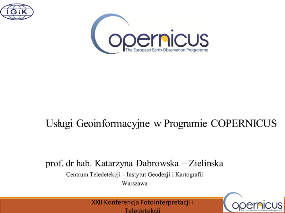 Usługi Geoinformacyjne w Programie COPERNICUS prof. dr hab. Katarzyna Dabrowska – Zielinska Centrum Teledetekcji - Instytut Geodezji i Kartografii Warszawa XXII Konferencja Fotointerpretacji i Copernicus to inicjatywa Unii Europejskiej, która dotyczy obserwacji Ziemi i jest realizowana we współpracy z krajami członkowskimi, której celem jest stworzenie serwisów informacyjnych, które zapewnią dostęp do wiarygodnych danych i informacji z zakresu środowiska i bezpieczeństwa i są dostosowane do potrzeb szerokiego wachlarza użytkowników. Użytkowników włączając decydentów na poziomie europejskim, krajowym, regionalnym i lokalnym, którzy opracowują i wdrażają politykę głównie w zakresie środowiska naturalnego Copernicus staje się narzędziem do wspierania bioróżnorodności, monitoringu ekosystemów, jak również dostosowania się do zmian klimatu i łagodzenia ich skutków. 2016-10-07 XXII KONFERENCJA FOTOINTERPRETACJI I TELEDETEKCJI Struktura Copernicus: Komponent kosmiczny – zapewnia dostęp do danych satelitarnych – satelity Sentinel 1-5 Komponent in-situ – zapewnia dostęp do danych wykonanych z pułapu lotniczego, morskiego oraz naziemnego – odpowiedzialność krajów członkowskich Komponent usługowy – zapewnia dostęp do danych z 6 obszarów: lądy, zarządzanie kryzysowe, bezpieczeństwo, morza i oceany, atmosfera, oraz zmiany klimatu 2016-10-07 XXII KONFERENCJA FOTOINTERPRETACJI I TELEDETEKCJI Udział w ProgramieCopernicus Komisja Europejska – DG Enterprise • Europejska Agencja Kosmiczna (ESA) – komponent satelitarny • Europejska Agencja Środowiska (EEA) - komponent in- situ • EUMETSAT – agencja satelitów meteorologicznych • Państwa Członkowskie (rządy) • Regiony (samorządy) • Przedsiębiorstwa sektora kosmicznego • Użytkownicy inni niż wyżej wymienieni 2016-10-07 XXII KONFERENCJA FOTOINTERPRETACJI I TELEDETEKCJI 2016-10-07 XXII KONFERENCJA FOTOINTERPRETACJI I TELEDETEKCJI Serwisy COPERNICUS dotyczą sześciu obszarów tematycznych Monitorowanie Lądu Monitorowanie Mórz Monitorowanie Atmosfery Zarządzanie Bezpieczeństwem Bezpieczeństwo Zmiany Klimatyczne Serwisy osiągnęły różny stopień zaawansowania. Zmiany Klimatyczne i Bezpieczeństwo w końcowej fazie przygotowań. 2016-10-07 XXII KONFERENCJA FOTOINTERPRETACJI I TELEDETEKCJI SERWIS LĄDOWY (już operacyjny) W skład wchodzą trzy komponenty Pan – Europejski – Koordynowany przez Europejską Agencję ds. Środowiska składa się z pięciu warstw dotyczących: powierzchni nienaturalnych (drogi, chodniki), obszarów leśnych, obszarów rolniczych (łąki), obszarów bagiennych oraz małych obszarów wodnych . W ramach Pan-Europejskiego Komponentu jest uaktualniana baza Corine Land Cover na rok 2012 Komponent Globalny jest koordynowany przez Komisję Europejską – Joint Research Center – JRC – dostarcza danych biofizycznych zmiennych w skali globalnej, tj. LAI, Albedo, Wskaźnik Wilgotności, wskaźnik pokrycia roślinności. temperatura powierzchni, odbicie spektralne Komponent Lokalny jest koordynowany przez Europejską Agencję Środowiska – dostarczanie informacji uzupełniającej komponent Pan – Europejski, i koncentruje się na tzw „hot spots” aktualizacja „Urban Atlas”, wkrótce następny komponent lokalny to bioróżnorodność wzdłuż rzek . 2016-10-07 XXII KONFERENCJA FOTOINTERPRETACJI I TELEDETEKCJI SERWIS LĄDOWY (już operacyjny) Serwis jest operacyjny od 2012 roku W grudniu 2014, the Komisja Europejska podpisała umowę „Delegation Agreement” z Europejską Agencją ds. Środowiska (EEA) do implementacji Pan-Europejskiego i Lokalnego komponentu. Oprócz omówionych komponentów Serwis również wspomaga generowanie PanEuropejskiego Numerycznego Modelu Terenu (DEM) 2016-10-07 XXII KONFERENCJA FOTOINTERPRETACJI I TELEDETEKCJI 2016-10-07 XXII KONFERENCJA FOTOINTERPRETACJI I TELEDETEKCJI 2016-10-07 XXII KONFERENCJA FOTOINTERPRETACJI I TELEDETEKCJI 2016-10-07 XXII KONFERENCJA FOTOINTERPRETACJI I TELEDETEKCJI SERWIS MÓRZ i OCEANÓW (już operacyjny) Copernicus Marine Environment Monitoring Service (CMEMS) Serwis dostarcza regularnych informacji o dynamice , stanie fizycznym ekosystemu mórz i oceanów • dane o temperaturze wody, • zasoleniu, • wysokości poziomu morza , • prądach morskie, • zlodzenia Dostarczenie przez serwis biogeochemicznych danych pozwala na monitorowanie jakości wody i kontroli zanieczyszczeń Dane o prądach morskich, o sile i kierunku wiatru, lokalizacja powierzchni loduwspomagają wyznaczeniu tras statków, operacji morskich, ratownictwo morskie Serwis dostarcza danych dla rybołówstwa W listopadzie 2014 r. Komisja Europejska podpisała umowę z Mercator Ocean do implementacji serwisu . Serwis działa operacyjnie od maja 2015 Dane dostarczane są bezpłatnie poprzez portal: marine.copernicus.eu 2016-10-07 XXII KONFERENCJA FOTOINTERPRETACJI I TELEDETEKCJI Serwis Monitorowania Atmosfery Serwis dostarczający danych o składzie atmosfery: C02 , metan, dwutlenku siarki, ozone, aerozole, radiacja słoneczna Dostarcza informacji o emisjach stanowiących wkład do modeli transportu związków chemicznych i określenia strumieni C02 i CH4 Dostarcza również prognozę 4 dniową i analizę jakości powietrza W listopadzie 2014, Komisja Europejska podpisała porozumienie dotyczące delegowania ECMWF (European Centre for Medium-Range Weather Forecast) do implementacji serwisu Produkty dostarczane w serwisie można uzyskać bezpłatnie poprzez Interactive Catalogue na platformie atmosphere.copernicus.eu 2016-10-07 XXII KONFERENCJA FOTOINTERPRETACJI I TELEDETEKCJI Serwis Zarządzanie Sytuacją Kryzysową (Emergency Management Service EMS) Serwis dotyczy zagrożeń wywołanych przez człowieka, pomocy humanitarnej i informacji dostarczanej poprzez satelity w czasie rzeczywistym, w systemie otwartym Komponent mapowy Serwisu (GIO EMS - Mapping) ma pokrycie globalne i wprowadza informacje w postaci m