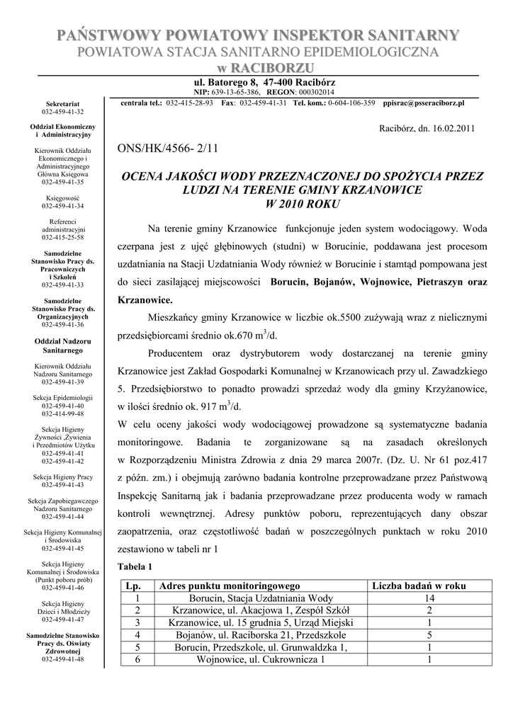 PAŃSTWOWY POWIATOWY INSPEKTOR SANITARNY POWIATOWA STACJA SANITARNO EPIDEMIOLOGICZNA w RACIBORZU ul. Batorego 8, 47-400 Racibórz Sekretariat 032-459-41-32 NIP: 639-13-65-386, REGON: 000302014 centrala tel.: 032-415-28-93 Fax: 032-459-41-31 Tel. kom.: 0-604-106-359 Oddział Ekonomiczny i Administracyjny Kierownik Oddziału Ekonomicznego i Administracyjnego Główna Księgowa 032-459-41-35 Księgowość 032-459-41-34 Racibórz, dn. 16.02.2011 ONS/HK/4566- 2/11 OCENA JAKOŚCI WODY PRZEZNACZONEJ DO SPOśYCIA PRZEZ LUDZI NA TERENIE GMINY KRZANOWICE W 2010 ROKU Referenci administracyjni 032-415-25-58 Samodzielne Stanowisko Pracy ds. Pracowniczych i Szkoleń 032-459-41-33 Samodzielne Stanowisko Pracy ds. Organizacyjnych 032-459-41-36 Oddział Nadzoru Sanitarnego [email protected] Na terenie gminy Krzanowice funkcjonuje jeden system wodociągowy. Woda czerpana jest z ujęć głębinowych (studni) w Borucinie, poddawana jest procesom uzdatniania na Stacji Uzdatniania Wody równieŜ w Borucinie i stamtąd pompowana jest do sieci zasilającej miejscowości Borucin, Bojanów, Wojnowice, Pietraszyn oraz Krzanowice. Mieszkańcy gminy Krzanowice w liczbie ok.5500 zuŜywają wraz z nielicznymi przedsiębiorcami średnio ok.670 m3/d. Producentem oraz dystrybutorem wody dostarczanej na terenie gminy Kierownik Oddziału Nadzoru Sanitarnego 032-459-41-39 Krzanowice jest Zakład Gospodarki Komunalnej w Krzanowicach przy ul. Zawadzkiego Sekcja Epidemiologii 032-459-41-40 032-414-99-48 w ilości średnio ok. 917 m3/d. Sekcja Higieny śywności ,śywienia i Przedmiotów UŜytku 032-459-41-41 032-459-41-42 Sekcja Higieny Pracy 032-459-41-43 Sekcja Zapobiegawczego Nadzoru Sanitarnego 032-459-41-44 Sekcja Higieny Komunalnej i Środowiska 032-459-41-45 Sekcja Higieny Komunalnej i Środowiska (Punkt poboru prób) 032-459-41-46 Sekcja Higieny Dzieci i MłodzieŜy 032-459-41-47 Samodzielne Stanowisko Pracy ds. Oświaty Zdrowotnej 032-459-41-48 5. Przedsiębiorstwo to ponadto prowadzi sprzedaŜ wody dla gminy KrzyŜanowice, W celu oceny jakości wody wodociągowej prowadzone są systematyczne badania monitoringowe. Badania te zorganizowane są na zasadach określonych w Rozporządzeniu Ministra Zdrowia z dnia 29 marca 2007r. (Dz. U. Nr 61 poz.417 z późn. zm.) i obejmują zarówno badania kontrolne przeprowadzane przez Państwową Inspekcję Sanitarną jak i badania przeprowadzane przez producenta wody w ramach kontroli wewnętrznej. Adresy punktów poboru, reprezentujących dany obszar zaopatrzenia, oraz częstotliwość badań w poszczególnych punktach w roku 2010 zestawiono w tabeli nr 1 Tabela 1 Lp. 1 2 3 4 5 6 Adres punktu monitoringowego Borucin, Stacja Uzdatniania Wody Krzanowice, ul. Akacjowa 1, Zespół Szkół Krzanowice, ul. 15 grudnia 5, Urząd Miejski Bojanów, ul. Raciborska 21, Przedszkole Borucin, Przedszkole, ul. Grunwaldzka 1, Wojnowice, ul. Cukrownicza 1 Liczba badań w roku 14 2 1 5 1 1 W pobranych próbkach wody ocenie poddawano zarówno parametry mikrobiologiczne jak i fizykochemiczne w zakresie ustalonym Rozporządzeniem Ministra Zdrowia z dnia 29 marca 2007r. (Dz. U. Nr 61 poz.417z późn. zm.) i obejmującym: monitoring kontrolny – mający na celu zweryfikowanie jakości mikrobiologicznej wody, ocenę skuteczności zastosowanych procesów uzdatniania i dezynfekcji a takŜe ocenę jej akceptowalności przez konsumentów, oraz monitoring przeglądowy- w którym analizowany jest poszerzony zakres parametrów, umoŜliwiający pełną ocenę bezpieczeństwa jej spoŜywania ze względu na zdrowie ludzi. Wyniki badań poszczególnych parametrów jakości wody do spoŜycia na terenie gminy i ich wartości zestawiono w tabeli nr 2 Tabela 2 Lp. Parametr (jednostka) Wartość średnia Wartość Wartość Wartość minimalna maksymalna dopuszczalna Badania fizykochemiczne 1. 2. 3. 4. 5. 6. 7. 8. 9. 10. 11. 12. 13. 14. 15.. 16. 17. 18. 19. 20. 21. 22. 23. 24. 25. 26. 27. 28. 29. 30. 31. 32. 33. 34. Barwa (mg/l) Mętność (NTU) Odczyn (pH) Przewodność elektryczna właściwa (µS/cm) Zapach Smak Jon amonowy (mg/l) Azotany (mg/l) Azotyny (mg/l) śelazo (µg/l) Mangan (µg/l) Glin (mg/l) Temperatura (°C) Chlor (mg/l) Chlorki (mg/l) Fluorki (mg/l) Miedź (mg/l) Siarczany (mg/l) 1,2-dichloroetan (µg/l) Benzo(a)piren (µg/l) Benzo(b)fluoranten (µg/l) Benzo(ghi)perylen (µg/l) Benzo(k)fluoranten (µg/l) Indeno(1,2,3-c,d)piren (µg/l) Bromodichlorometan (mg/l) Dibromochlorometan (mg/l) Tribromometan (mg/l) Trichlorometan (mg/l) Suma THM (µg/l) Trichloroeten (µg/l) Tetrachloroeten (µg/l) Suma trichloroetenu i tetrachloroetenu (µg/l) Tetrachlorometan (czterochlorek węgla) Utlenialność nadmanganianowa (mg/l) 5,7 0,71 7,3 470 5 0,26 6,2 457 akceptowalny akceptowalny akceptowalny akceptowalny 1,12 10,8 6,7 0,15 0,043 36 <0,50 <0,0012 <0,0012 <0,0012 <0,0003 <0,0014 <0,00046 <0,0021 <0,00167 <0,00061 <4,84 <0,350 <0,450 <0,8 <0,0002 0,67 <0,15 0,9 <0,01 <60 12 <0,01 8,2 <0,02 6,7 0,15 0,043 36 <0,50 <0,0012 <0,0012 <0,0012 <0,0003 <0,0014 <0,00046 <0,0021 <0,00167 <0,00061 <4,84 <0,350 <0,450 <0,8 <0,0002 0,67 10 2,8 7,83 485 0-15 0-1 6,5-9,5 0-2500 akceptowalny akceptowalny akceptowalny akceptowalny <0,2 1,5 <0,02 240 <50 <0,04 13,1 0,14 6,7 0,15 0,043 36 <0,50 <0,0012 <0,0012 <0,0012 <0,0003 <0,0014 <0,00046 <0,0021 <0,00167 <0,00061 <4,84 <0,350 <0,450 <0,8 <0,0002 0,67 0-0,5 0-50 0-0,5 0-200 0-50 0-0,200 0-0,3 0-250 0-1,5 0-2,0 0-250 0-3 0-0,010 0-0,015 0-0,030 0-100 0-10 0-0,002 0-5 2 Wielopierścieniowe węglowodory aromatyczne (suma) (µg/l) Bromiany (µg/l) Magnez (mg/l) Twardość 35. 36. 37. 38. <0,003 <0,003 <0,003 0-0,10 3 6 232 3 6 232 3 6 232 0-10 30-125 60-500 0 0 0 6 5 0 1 36 0 0 0 0-100 Badania mikrobiologiczne 1. 2. 3. 4. Bakterie grupy coli (jtk/100ml) Escherichia coli (jtk/100ml) Enterokoki (paciorkowce kałowe) (jtk/100ml) Ogólna liczba bakterii w 22oC po 72h (jtk/1ml) 0 21 Wyniki badań w których stwierdzano nieprawidłowości w wodzie wodociągowej gminy Krzanowice zawiera tabela