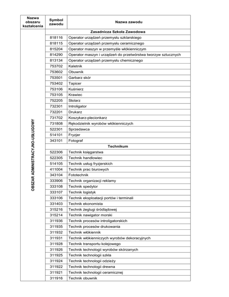 Nazwa obszaru kształcenia Symbol zawodu Nazwa zawodu OBSZAR ADMINISTRACYJNO-USŁUGOWY Zasadnicza Szkoła Zawodowa 818116 Operator urządzeń przemysłu szklarskiego 818115 Operator urządzeń przemysłu ceramicznego 815204 Operator maszyn w przemyśle włókienniczym 814290 Operator maszyn i urządzeń do przetwórstwa tworzyw sztucznych 813134 Operator urządzeń przemysłu chemicznego 753702 Kaletnik 753602 Obuwnik 753501 Garbarz skór 753402 Tapicer 753106 Kuśnierz 753105 Krawiec 752205 Stolarz 732301 Introligator 732201 Drukarz 731702 Koszykarz-plecionkarz 731808 Rękodzielnik wyrobów włókienniczych 522301 Sprzedawca 514101 Fryzjer 343101 Fotograf Technikum 522306 Technik księgarstwa 522305 Technik handlowiec 514105 Technik usług fryzjerskich 411004 Technik prac biurowych 343104 Fototechnik 333906 Technik organizacji reklamy 333108 Technik spedytor 333107 Technik logistyk 333106 Technik eksploatacji portów i terminali 331403 Technik ekonomista 315216 Technik Ŝeglugi śródlądowej 315214 Technik nawigator morski 311936 Technik procesów introligatorskich 311935 Technik procesów drukowania 311932 Technik włókiennik 311931 Technik włókienniczych wyrobów dekoracyjnych 311928 Technik transportu kolejowego 311926 Technik technologii wyrobów skórzanych 311925 Technik technologii szkła 311924 Technik technologii odzieŜy 311922 Technik technologii drewna 311921 Technik technologii ceramicznej 311916 Technik obuwnik 311912 Technik garbarz 311911 Technik cyfrowych procesów graficznych 311603 Technik technologii chemicznej 311601 Technik papiernictwa 311103 Technik analityk Szkoła Policealna 514207 Technik usług kosmetycznych 441403 Technik archiwista 431103 Technik rachunkowości 421108 Technik usług pocztowych i finansowych 334306 Technik administracji 311927 Technik transportu drogowego OBSZAR BUDOWLANY Zasadnicza Szkoła Zawodowa 843201 Mechanik maszyn i urządzeń drogowych 721303 Blacharz izolacji przemysłowych 713303 Kominiarz 712905 Monter zabudowy i robót wykończeniowych w budownictwie 712616 Monter sieci, instalacji i urządzeń sanitarnych 712613 Monter systemów rurociągowych 712403 Monter izolacji przemysłowych 712401 Monter izolacji budowlanych 712101 Dekarz 711701 Monter budownictwa wodnego 711603 Monter nawierzchni kolejowej 711501 Cieśla 711402 Betoniarz-zbrojarz 711301 Kamieniarz 711203 Zdun 711202 Murarz-tynkarz 711102 Monter konstrukcji budowlanych Technikum 311930 Technik urządzeń i systemów energetyki odnawialnej 311913 Technik gazownictwa 311210 Technik renowacji elementów architektury 311209 Technik urządzeń sanitarnych 311207 Technik dróg i mostów kolejowych 311206 Technik drogownictwa 311204 Technik budownictwa 311205 Technik budownictwa wodnego 311104 Technik geodeta OBSZAR ELEKTRYCZNO-ELEKTRONICZNY Zasadnicza Szkoła Zawodowa 742202 Monter sieci i urządzeń telekomunikacyjnych 742114 Monter mechatronik 742102 Monter-elektronik 741201 Elektromechanik 741103 Elektryk Technikum 352203 Technik telekomunikacji 351204 Technik tyfloinformatyk 351203 Technik informatyk 351103 Technik teleinformatyk 315316 Technik awionik 311410 Technik mechatronik 311408 Technik elektronik 311407 Technik automatyk sterowania ruchem kolejowym 311307 Technik energetyk 311303 Technik elektryk 311302 Technik elektroenergetyk transportu szynowego Szkoła Policealna 352121 Technik urządzeń audiowizualnych 311409 Technik elektroniki medycznej OBSZAR MECHANICZNY I GÓRNICZO-HUTNICZY Zasadnicza Szkoła Zawodowa 834103 Mechanik-operator pojazdów i maszyn rolniczych 812107 Operator maszyn i urządzeń odlewniczych 812106 Operator maszyn i urządzeń metalurgicznych 812105 Operator maszyn i urządzeń do obróbki plastycznej 811303 Wiertacz 811301 Górnik eksploatacji otworowej 811102 Górnik odkrywkowej eksploatacji złóŜ 811101 Górnik eksploatacji podziemnej 741203 Elektromechanik pojazdów samochodowych 731106 Zegarmistrz 731104 Optyk-mechanik 731103 Mechanik precyzyjny 731102 Mechanik automatyki przemysłowej i urządzeń precyzyjnych 723310 Mechanik-monter maszyn i urządzeń 723103 Mechanik pojazdów samochodowych 722307 Operator obrabiarek skrawających 722204 Ślusarz 722101 Kowal 721402 Monter kadłubów okrętowych 721306 Blacharz samochodowy 721301 Blacharz 721104 Modelarz odlewniczy 713201 Lakiernik Technikum 325302 Technik optyk 315317 Technik mechanik lotniczy 315105 Technik mechanik okrętowy 311910 Technik budownictwa okrętowego 311707 Technik wiertnik 311706 Technik przeróbki kopalin stałych 311705 Technik odlewnik 311704 Technik hutnik 311703 Technik górnictwa podziemnego 311702 Technik górnictwa otworowego 311701 Technik górnictwa odkrywkowego 311513 Technik pojazdów samochodowych 311512 Technik mechanizacji rolnictwa 311504 Technik mechanik OBSZAR ROLNICZO-LEŚNY Z OCHRONĄ ŚRODOWISKA Zasadnicza Szkoła Zawodowa 834105 Operator maszyn leśnych 622201 Rybak śródlądowy 613003 Rolnik 612302 Pszczelarz 611303 Ogrodnik Technikum 331402 Technik agrobiznesu 325511 Technik ochrony środowiska 324002 Technik weterynarii 315215 Technik rybołówstwa morskiego 314301 Technik leśnik 314208 Technik rybactwa śródlądowego 314207 Technik rolnik 314206 Technik pszczelarz 314205 Technik ogrodnik 314203 Technik hodowca koni 314202 Technik architektury krajobrazu 311208 Technik inŜynierii środowiska i melioracji 311106 Technik geolog Szkoła Policealna 343203 Florysta OBSZAR TURYSTYCZNO-GASTRONOMICZNY Zasadnicza Szkoła Zawodowa 911205 Pracownik pomocniczy obsługi hotelowej 816003 Operator maszyn i urządzeń przemysłu spoŜywczego 751204 Piekarz 751201 Cukiernik 751107 Wędliniarz 512001 Kucharz Technikum 515203 Technik turystyki wiejskiej 513101 Kelner 422402 Technik hotelarstwa 422103 Technik obsługi turystycznej 343404 Technik Ŝywienia i usług gastronomicznych 314403 Technik technologii Ŝywności 314402 Technik przetwórstwa mleczarskiego OBSZAR MEDYCZNO-SPOŁECZNY Szkoła Policealna 532102 Opiekun medyczny 341315 Technik ochrony fiz