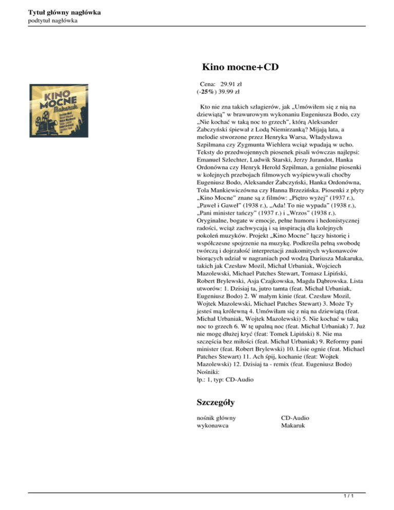 Tytuł główny nagłówka podtytuł nagłówka Kino mocne+CD Cena: 29.91 zł (-25%) 39.99 zł Kto nie zna takich szlagierów, jak „Umówiłem się z nią na dziewiątą” w brawurowym wykonaniu Eugeniusza Bodo, czy „Nie kochać w taką noc to grzech”, którą Aleksander Żabczyński śpiewał z Lodą Niemirzanką? Mijają lata, a melodie stworzone przez Henryka Warsa, Władysława Szpilmana czy Zygmunta Wiehlera wciąż wpadają w ucho. Teksty do przedwojennych piosenek pisali wówczas najlepsi: Emanuel Szlechter, Ludwik Starski, Jerzy Jurandot, Hanka Ordonówna czy Henryk Herold Szpilman, a genialne piosenki w kolejnych przebojach filmowych wyśpiewywali choćby Eugeniusz Bodo, Aleksander Żabczyński, Hanka Ordonówna, Tola Mankiewiczówna czy Hanna Brzezińska. Piosenki z płyty „Kino Mocne” znane są z filmów: „Piętro wyżej” (1937 r.), „Paweł i Gaweł” (1938 r.), „Ada! To nie wypada” (1938 r.), „Pani minister tańczy” (1937 r.) i „Wrzos” (1938 r.). Oryginalne, bogate w emocje, pełne humoru i hedonistycznej radości, wciąż zachwycają i są inspiracją dla kolejnych pokoleń muzyków. Projekt „Kino Mocne” łączy historię i współczesne spojrzenie na muzykę. Podkreśla pełną swobodę twórczą i dojrzałość interpretacji znakomitych wykonawców biorących udział w nagraniach pod wodzą Dariusza Makaruka, takich jak Czesław Mozil, Michał Urbaniak, Wojciech Mazolewski, Michael Patches Stewart, Tomasz Lipiński, Robert Brylewski, Asja Czajkowska, Magda Dąbrowska. Lista utworów: 1. Dzisiaj ta, jutro tamta (feat. Michał Urbaniak, Eugeniusz Bodo) 2. W małym kinie (feat. Czesław Mozil, Wojtek Mazolewski, Michael Patches Stewart) 3. Może Ty jesteś mą królewną 4. Umówiłam się z nią na dziewiątą (feat. Michał Urbaniak, Wojtek Mazolewski) 5. Nie kochać w taką noc to grzech 6. W tę upalną noc (feat. Michał Urbaniak) 7. Już nie mogę dłużej kryć (feat: Tomek Lipiński) 8. Nie ma szczęścia bez miłości (feat. Michał Urbaniak) 9. Reformy pani minister (feat. Robert Brylewski) 10. Lisie ognie (feat. Michael Patches Stewart) 11. Ach śpij, kochanie (feat: Wojtek Mazolewski) 12. Dzisiaj ta - remix (feat. Eugeniusz Bodo) Nośniki: lp.: 1, typ: CD-Audio Szczegóły nośnik główny wykonawca CD-Audio Makaruk 1/1 Powered by TCPDF (www.tcpdf.org)