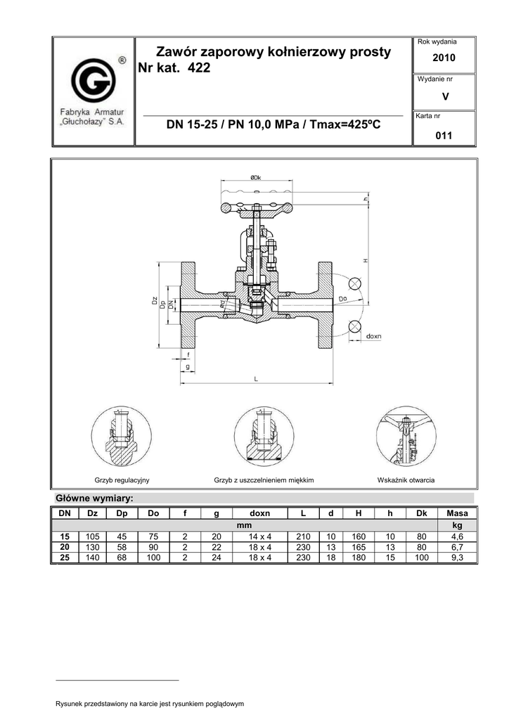 Rok wydania Zawór zaporowy kołnierzowy prosty Nr kat. 422 2010 Wydanie nr V Karta nr DN 15-25 / PN 10,0 MPa / Tmax=425ºC 011 Grzyb regulacyjny Grzyb z uszczelnieniem miękkim Wskaźnik otwarcia Główne wymiary: DN Dz Dp Do f g 15 20 25 105 130 140 45 58 68 75 90 100 2 2 2 20 22 24 doxn mm 14 x 4 18 x 4 18 x 4 1 Rysunek przedstawiony na karcie jest rysunkiem poglądowym L d H h Dk 210 230 230 10 13 18 160 165 180 10 13 15 80 80 100 Masa kg 4,6 6,7 9,3 Zastosowanie: Zawory zaporowe kołnierzowe można montować w dowolnym położeniu na rurociągach, zwracając jedynie uwagę na prawidłowy kierunek przepływu czynnika, który powinien być z godny z oznaczeniem na kadłubie. Zawory przeznaczone są do odcinania przepływu czynnika roboczego. W wykonaniu z grzybem regulacyjnym służą ponadto do dławienia przepływu czynnika roboczego. Czynnik roboczy: Zawory przeznaczone są do wody, pary, oleju oraz innych neutralnych czynników ciekłych i gazowych w przedziale temperatur od -29˚C do 425˚C. Zakres stosowania: Największe ciśnienie robocze [w bar] przy temp. czynnika [°°C] -29ºC +38ºC 100ºC 200ºC 300ºC 350ºC 400ºC 425ºC 100 A105 100 100 93 88 78 74 69 58 Szczegółowe informacje zawiera wykres „Dopuszczalne parametry robocze armatury dla stosowanych materiałów” (Układ p/t) w części IV katalogu. Materiał PN Materiały podstawowe: Nazwa części Materiał Kadłub A105 Pokrywa Trzpień A105 X30Cr13 Siedlisko kadłuba X30Cr13 Siedlisko grzyba X30Cr13 Uszczelnienia Grafit Uwagi: 1. 2. 3. 4. 5. Kołnierze zaworów wykonanie standard: przylga „B2” wg. PN-EN 1092. Na życzenie klienta wykonujemy inne rodzaje przylg. Klasa szczelności A wg PN-EN 12266-1. Długość budowy wg PN-EN 558-1 Wymagania i badania techniczne zaworów wg. PN-EN 12266-1. Świadectwo odbioru wg życzenia klienta – wg PN-EN 10204. UWAGA – W zapytaniu / zamówieniu prosimy o podanie norm i typu przyłącza oraz medium i parametry pracy. Producent i dostawca: Fabryka Armatur „Głuchołazy” S.A. Adres: 48-340 Głuchołazy ul. Wrocławska 1A tel.: 077 / 439 19 44 fax: 077 / 439 19 46 e-mail: [email protected] http: www.fagsa.com.pl Producent zastrzega możliwość wprowadzenia zmian w wyrobach bez powiadamiania.