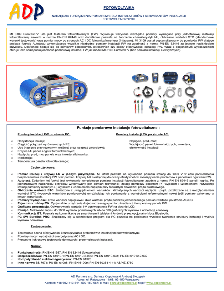 FOTOWOLTAIKA NARZĘDZIA I URZĄDZENIA POMIAROWE DLA INSTALATORÓW I SERWISANTÓW INSTALACJI FOTOWOLTAICZNYCH MI 3109 EurotestPV Lite jest testerem fotowoltaicznym (FW). Wykonuje wszystkie niezbędne pomiary wymagane przy jednofazowej instalacji fotowoltaicznej zawarte w normie PN-EN 62446 oraz dodatkowo pozwala na tworzenie charakterystyk I-U, obliczanie wartości STC (standardowe warunki testowania) oraz pomiar mocy po stronach AC i DC falownika/inwertera (1-fazowo). MI 3109 został zoptymalizowany do pomiarów FW dlatego posiada funkcję Autotestu wykonującego wszelkie niezbędne pomiary instalacji FW na zgodność z normą PN-EN 62446 za jednym naciśnięciem przycisku. Doskonale nadaje się do pomiarów odbiorczych, okresowych czy oceny efektywności instalacji FW. Wraz z opcjonalnym wyposażeniem oferuje taką samą funkcjonalność pomiarową instalacji FW jak model MI 3108 EurotestPV (bez pomiaru instalacji elektrycznych). Funkcje pomiarowe instalacje fotowoltaiczne : Pomiary instalacji FW po stronie DC: • • • • • • • Rezystancja izolacji; Ciągłość połączeń wyrównawczych PE; Uoc (napięcie przy rozwartym wejściu) oraz Isc (prąd zwarciowy); Krzywa I-U paneli i ogniw fotowoltaicznych; Napięcie, prąd, moc panela oraz inwertera/falownika; Irradiancja; Temperatura panela fotowoltaicznego; Pomiary instalacji FW po stronie AC: Napięcie, prąd, moc; Wydajność paneli fotowoltaicznych, inwertera, efektywność instalacji. Cechy użytkowe: • • • • • • • • • Pomiar izolacji i krzywej I-U w jednym przyrządzie. MI 3109 pozwala na wykonanie pomiaru izolacji do 1000 V w celu potwierdzenia bezpieczeństwa instalacji FW oraz pomiaru krzywej I-U niezbędnej do oceny efektywności i rozwiązywania problemów z panelami i ogniwami FW. Autotest. Zadaniem tej funkcji jest wykonanie kompletnego pomiaru instalacji fotowoltaicznej zgodnie z normą PN-EN 62446 paneli i ogniw. Po jednorazowym naciśnięciu przycisku wykonywany jest pomiar: rezystancji izolacji pomiędzy dodatnim (+) wyjściem i uziemieniem; rezystancji izolacji pomiędzy ujemnym (-) wyjściem i uziemieniem napięcia przy rozwartym obwodzie; prądu zwarciowego. Obliczanie wartości STC. Zmierzone z uwzględnieniem warunków klimatycznych wartości napięcia i prądu przeliczane są z uwzględnieniem wartości STC (typowych warunków pomiarowych) umożliwiając ich porównanie z wartościami referencyjnymi nawet jeśli pomiary wykonano w innych warunkach. Pomiary wydajności. Dwie wartości napięciowe i dwie wartości prądu podczas jednoczesnego pomiaru wartości po stronie AC/DC. Rejestrator zdalny FW. Opcjonalnie urządzenie do jednoczesnego pomiaru irradiancji i temperatury panela FW. Graficzna prezentacja. Odwzorowanie wartości I-V ogniwa/panela FW na ekranie LCD. Pamięć. Możliwość zapisu do 1800 wyników pomiarowych lub do 500 graficznych wyników z adnotacją czasową. Komunikacja BT. Pozwala na komunikację ze smartfonami i tabletami Android przez opcjonalny klucz Bluetooth. PC SW Eurolink PRO. Znajdujący się w standardzie program dla PC pozwala na pobieranie wyników tworzenie struktury instalacji i wydruk wyników pomiarów. Zastosowanie: • • • Testowanie ocena efektywności i rozwiązywanie problemów z instalacjami fotowoltaicznymi. Pomiary mocy i wydajności energetycznej AC i DC. Pierwotne i okresowe testowanie domowych i przemysłowych instalacji. Normy: • • • • Funkcjonalność: PN/EN 61557; PN-EN 62446 (fotowoltaika) Bezpieczeństwo: PN-EN 61010-1;PN-EN 61010-2-030; PN-EN 61010-031; PN-EN 61010-2-032 Kompatybilność elektromagnetyczna: PN-EN 61326 Inne normy: BS 7671; PN-EN 61008; PN-EN 61009; PN-EN 60364-4-41; AS/NZ 3760 AD Partners s.c. Dariusz Kłopotowski Andrzej Skrzypek Adres: ul. Ratuszowa 11/68, 03-450 Warszawa Kontakt: +48 602-413-544; 502-150-667; e-mail: [email protected] http:// www.adpartners.pl