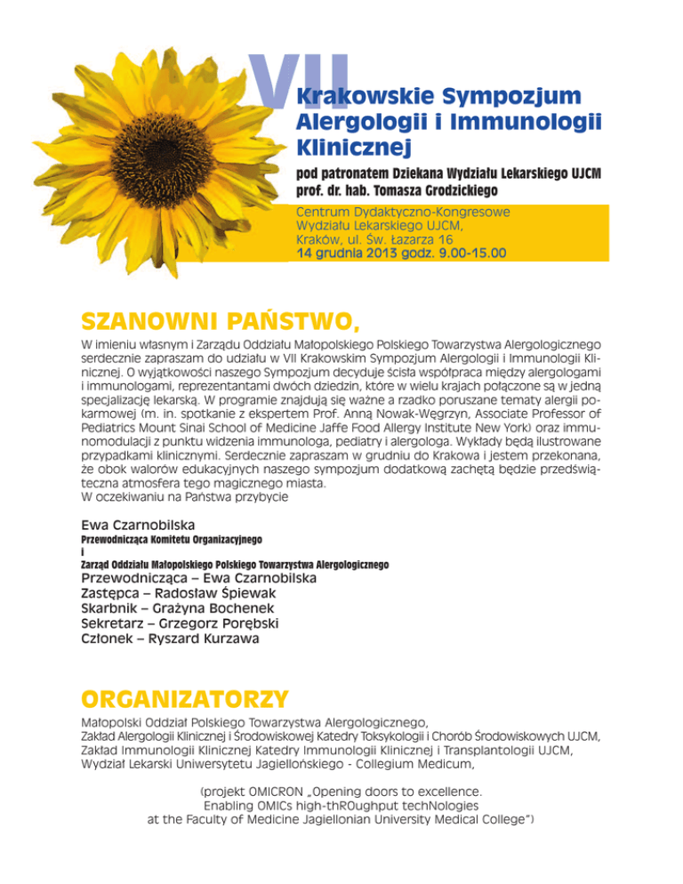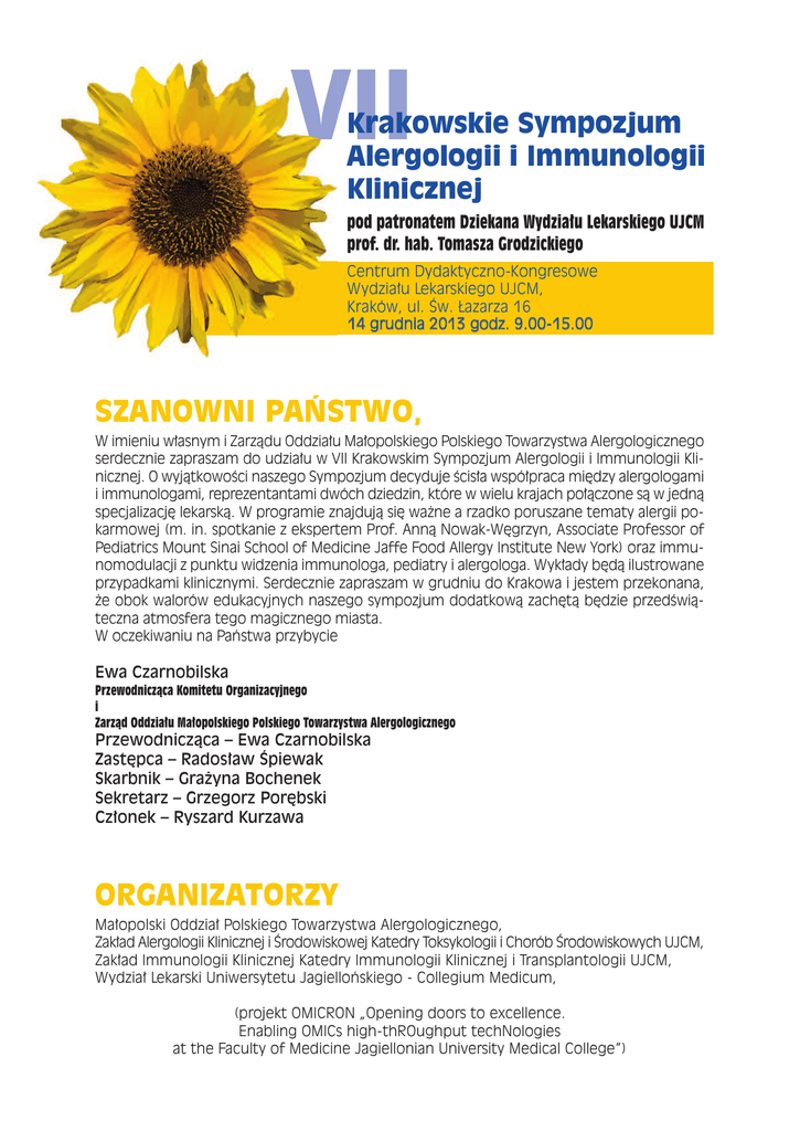 VII Krakowskie Sympozjum Alergologii i Immunologii Klinicznej pod patronatem Dziekana Wydziału Lekarskiego UJCM prof. dr. hab. Tomasza Grodzickiego Centrum Dydaktyczno-Kongresowe Wydziału Lekarskiego UJCM, Kraków, ul. Św. Łazarza 16 14 grudnia 2013 godz. 9.00-15.00 SZANOWNI PAŃSTWO, W imieniu własnym i Zarządu Oddziału Małopolskiego Polskiego Towarzystwa Alergologicznego serdecznie zapraszam do udziału w VII Krakowskim Sympozjum Alergologii i Immunologii Klinicznej. O wyjątkowości naszego Sympozjum decyduje ścisła współpraca między alergologami i immunologami, reprezentantami dwóch dziedzin, które w wielu krajach połączone są w jedną specjalizację lekarską. W programie znajdują się ważne a rzadko poruszane tematy alergii pokarmowej (m. in. spotkanie z ekspertem Prof. Anną Nowak-Węgrzyn, Associate Professor of Pediatrics Mount Sinai School of Medicine Jaffe Food Allergy Institute New York) oraz immunomodulacji z punktu widzenia immunologa, pediatry i alergologa. Wykłady będą ilustrowane przypadkami klinicznymi. Serdecznie zapraszam w grudniu do Krakowa i jestem przekonana, że obok walorów edukacyjnych naszego sympozjum dodatkową zachętą będzie przedświąteczna atmosfera tego magicznego miasta. W oczekiwaniu na Państwa przybycie Ewa Czarnobilska Przewodnicząca Komitetu Organizacyjnego i Zarząd Oddziału Małopolskiego Polskiego Towarzystwa Alergologicznego Przewodnicząca – Ewa Czarnobilska Zastępca – Radosław Śpiewak Skarbnik – Grażyna Bochenek Sekretarz – Grzegorz Porębski Członek – Ryszard Kurzawa ORGANIZATORZY Małopolski Oddział Polskiego Towarzystwa Alergologicznego, Zakład Alergologii Klinicznej i Środowiskowej Katedry Toksykologii i Chorób Środowiskowych UJCM, Zakład Immunologii Klinicznej Katedry Immunologii Klinicznej i Transplantologii UJCM, Wydział Lekarski Uniwersytetu Jagiellońskiego - Collegium Medicum, (projekt OMICRON „Opening doors to excellence. Enabling OMICs high-thROughput techNologies at the Faculty of Medicine Jagiellonian University Medical College”) VII Krakowskie Sympozjum Alergologii i Immunologii Klinicznej pod patronatem Dziekana Wydziału Lekarskiego UJCM prof. dr. hab. Tomasza Grodzickiego Centrum Dydaktyczno-Kongresowe Wydziału Lekarskiego UJCM, Kraków, ul. Św. Łazarza 16 14 grudnia 2013 godz. 9.00-15.00 BIURO ORGANIZACYJNE Symposium Cracoviense 31-123 Kraków, ul. Krupnicza 3 tel. 12 422-76-00, fax 12 421-38-57 e-mail: [email protected]; www.symposium.pl Alior Bank o/Kraków ul. Karmelicka 28, Kraków 77 2490 0005 0000 4530 9032 2768 opłatę rejestracyjną - 100 zł - należy wpłacić na konto Symposium Cracoviense jw. z dopisem: Sympozjum Alergologii i Immunologii Klinicznej Dla członków Polskiego Towarzystwa Alergologicznego i Immunologicznego wstęp bezpłatny. KOMITET NAUKOWO-ORGANIZACYJNY Dr hab. med. Ewa Czarnobilska – Przewodnicząca Dr n. farm. Dorota Myszkowska – Z-ca przewodniczącej Prof. dr hab. med. Krystyna Obtułowicz Prof. dr hab. med. Anna Pituch-Noworolska Dr n. med. Marcel Mazur Mgr Iwona Jaros – Sekretarz VII Krakowskie Sympozjum Alergologii i Immunologii Klinicznej pod patronatem Dziekana Wydziału Lekarskiego UJCM prof. dr. hab. Tomasza Grodzickiego Centrum Dydaktyczno-Kongresowe Wydziału Lekarskiego UJCM, Kraków, ul. Św. Łazarza 16 14 grudnia 2013 godz. 9.00-15.00 PROGRAM 14.12.2013 – SOBOTA 9.00 Otwarcie Konferencji Dziekan Wydziału Lekarskiego UJCM – Prof. dr hab. med. Tomasz Grodzicki, Prof. dr hab. med. Krystyna Obtułowicz, Prof. dr hab. med. Tomasz Guzik, Dr hab. med. Ewa Czarnobilska 9.00-12.00 SESJA ALERGOLOGICZNA Prowadzący: Prof. dr hab. med. Krzysztof Sładek, Prof. dr hab. med. Ryszard Kurzawa Alergia pokarmowa – nowe metody diagnostyki i leczenia Anna Nowak-Węgrzyn - 45 min Eozynofilowe zapalenia przewodu pokarmowego a nietolerancje pokarmowe Krzysztof Fyderek - 20 min Przewód pokarmowy w niedoborach odporności – alergia i schorzenia autoimmunizacyjne Anna Pituch-Noworolska - 20 min Alergia kontaktowa u dzieci i młodzieży szkolnej z wypryskiem alergicznym na dodatki do pokarmów Anna Chmielewska, Wojciech Dyga, Ewa Czarnobilska - 20 min Alergia pokarmowa jako przyczyna wyprysku atopowego Zygmunt Nowacki - 15 min Alergia pokarmowa jest skutkiem wyprysku atopowego Radosław Śpiewak - 15 min 12.00-12.30 Przerwa - Lunch VII Krakowskie Sympozjum Alergologii i Immunologii Klinicznej pod patronatem Dziekana Wydziału Lekarskiego UJCM prof. dr. hab. Tomasza Grodzickiego Centrum Dydaktyczno-Kongresowe Wydziału Lekarskiego UJCM, Kraków, ul. Św. Łazarza 16 14 grudnia 2013 godz. 9.00-15.00 12.30-13.00 Sesja Posterowa Prowadzący: Dr Grzegorz Porębski Rola szlaku IL-12/INF-gamma w mykobakteriozach Magdalena Strach Zagrażające życiu reakcje polekowe u dzieci Małgorzata Leśniak, Jarosław Woroń, Ewa Czarnobilska Zastosowanie monitoringu pyłkowego podczas swoistej immunoterapii alergenowej Dorota Myszkowska, Marcin Stobiecki, Wojciech Dyga, Ewa Czarnobilska Zróżnicowanie odpowiedzi immunologicznej u osób z IgE zależną alergią pokarmową w reakcji na frakcje białek glutenowych pszenicy Jacek Waga, Andrzej Skoczowski, Anna Chmielewska, Wojciech Dyga, Krystyna Obtułowicz, Ewa Czarnobilska Skuteczność i bezpieczeństwo desensytyzacji w nadwrażliwości na leki Katarzyna Piotrowicz-Wójcik, Grzegorz Porębski, Ewa Czarnobilska Program lekowy dla chorych na ciężką astmę alergiczną – doświadczenia własne Marcin Stobiecki 13.00-14.30 SESJA IMMUNOLOGICZNA Prowadzący: Prof. dr hab. med. Maciej Siedlar, Prof. dr hab. med. Anna Pituch Noworolska Izolowany niedobór IgM – ignorowany pierwotny niedobór odporności Danuta Kowalczyk, Anna Szaflarska - 20 min Immunomodulacja w nawracających infekcjach u dorosłych – spojrzenie immunologa internisty Izabela Kierzkowska - 20 min Immunomodulacja w nawracających infekcjach dróg oddechowych – spojrzenie alergologa pediatry Łukasz Błażowski - 30 min Podsumowani