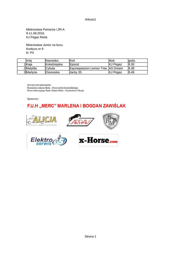 Arkusz1 Mistrzostwa Pomorza i ZR-A 9-11.09.2016. KJ Pegaz Reda Mistrzostwa Junior na kucu Konkurs nr 9 kl. P3 Imię 1 Kaja 2 Matylda 3 Martyna Nazwisko Kołodziejska Cybula Ossowska Koń Epizod Equinepassion Lemon Tree Jacky 35 Strona 1 klub KJ Pegaz AS Dream KJ Pegaz godz. 9.30 9.38 9.46