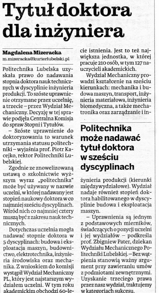 Tytuldoktora dla inzyniera M a ^ a l e n a Mizerax^a [email protected] Politechnika Lubelska uzyskala prawo do nadawania stopnia doktora nauk technicznych w dyscyplinie inzynieria produkcji. To szoste uprawnienie otrzymane przez uczelni^, a trzecie - przez Wydzial Mechaniczny. Decyzj? w tej sprawie podjf la Centralna Komisja do spraw Stopni i Tytulow. - Szoste uprawnienie do doktoryzowania to warunek utrzymania statusu politechniki - wyjasnia prof. Piotr Kacejko, rektor Politechniki Lubelskiej. Zgodnie ze znowelizowan^ ustaw^ 0 szkolnictwie wyzszym wyraz „politechnika" moze bye uzywany w nazwie uczelni, w ktorej nadawany jest stopien naukowy doktora w co najmniej szesciu dyscyplinach. Wsrod nich co najmniej cztery musz^ bye z zakresu nauk technicznych. Dotyehezas uczelnia mogla nadawac stopnie doktora w 5 dyscyplinach: budowa i eksploatacja maszyn, budowniawo, elektrotechnika, inzynieria srodowiska oraz mechanika. Z wnioskiem do komisji wyst^pil Wydzial Mechaniczny PL, ktory jest najstarszjma wydzialem uczelni. W tym roku akademickim obchodzi 6o-le- cie istnienia. Jest to tez najwi^ksza jednostka, w ktorej pracuje 210 osob, w tym 127 nauczycieli akademickich. Wydzial Mechaniczny prowadzi ksztalcenie na szesciu kierunkach: mechanika i budowa maszyn, transport, inzynieria materialowa, inzynieria biomedyczna, a takze mechatronika oraz zarz^dzanie i in- Politechnika moze nadawac tytuf doktora wszesciu dyscyplinach zynieria produkcji (kierunki mi^dzywydzialowe). Wydzial nadaje rowniez stopien doktora habilitowanego w dyscyplinie budowa i eksploatacja maszyn. - Uprawnienia s^ jednym z podstawowych miernikow, swiadcz^cych o pozycji uczelni i jej wydzialow - podkresla prof. Zbigniew Pater, dziekan Wydzialu Mechanicznego Politechniki Lubelskiej. - Bez wqtpienia stanowi^ v/azny argument przy zawieraniu umow z podmiotami zewn^trznymi. Uzyskanie trzeciego prawa przez nasz wydzial, traktujemy w kateeoriach sukcesu.