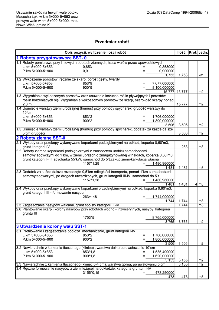 Usuwanie szkód na lewym wale potoku Macocha Łęki w km 5+000-5+853 oraz prawym wale w km 5+000-5+900, msc. Nowa Wieś, gmina K... Zuzia (C) DataComp 1994-2009(lic. 4) Przedmiar robót Opis pozycji, wyliczenie ilości robót Ilość Krot. Jedn. 1 Roboty przygotowawcze SST- 0 1.1 Roboty pomiarowe przy liniowych robotach ziemnych, trasa wałów przeciwpowodziowych L.km 5+000-5+853 0,853 = 0,853000 P.km 5+000-5+900 0,9 = 0,900000 1,753 1,753 1.2 Wykoszenie porostów, ręcznie ze skarp, porost gęsty, twardy L.km 5+000-5+853 853*9 = 7 677,000000 P.km 5+000-5+900 900*9 = 8 100,000000 15 777 15 777 1.3 Wygrabianie wykoszonych porostów oraz usuwanie kożucha roślin pływających i porostów roślin korzeniących się, Wygrabianie wykoszonych porostów ze skarp, szerokość skarpy ponad 2,0˙m 15 777 1.4 Usunięcie warstwy ziemi urodzajnej (humus) przy pomocy spycharek, grubość warstwy do 15˙cm L.km 5+000-5+853 853*2 = 1 706,000000 P.km 5+000-5+900 900*2 = 1 800,000000 3 506 3 506 1.5 Usunięcie warstwy ziemi urodzajnej (humus) przy pomocy spycharek, dodatek za każde dalsze 5˙cm grubości 3 506 km m2 m2 m2 m2 2 Roboty ziemne SST-0 2.1 Wykopy oraz przekopy wykonywane koparkami podsiębiernymi na odkład, koparka 0,60˙m3, grunt kategorii IV 2.2 Roboty ziemne koparkami podsiębiernymi z transportem urobku samochodami samowyładowczymi do 1˙km, w ziemi uprzednio zmagazynowanej w hałdach, koparka 0,60˙m3, grunt kategorii I-III, spycharka 55˙kW, samochód do 5˙t,zakup ziemi-kalkulacja własna 1157*1,28 = 1 480,960000 1 481 2.3 Dodatek za każde dalsze rozpoczęte 0,5˙km odległości transportu, ponad 1˙km samochodami samowyładowczymi, po drogach utwardzonych, grunt kategorii III-IV, samochód do 5˙t 1157*1,28 = 1 480,960000 1 481 2.4 Wykopy oraz przekopy wykonywane koparkami przedsiębiernymi na odkład, koparka 0,60˙m3, grunt kategorii III - formowanie nasypu 263+1481 = 1 744,000000 1 744 2.5 Zagęszczanie nasypów walcami, grunt spoisty kategorii III-IV 2.6 Plantowanie skarp i korony nasypów przy robotach wodno - inżynieryjnych, nasypy, kategoria gruntu III 1753*5 = 8 765,000000 8 765 263 m3 1 481 m3 1 481 4 m3 1 744 1 744 m3 m3 8 765 m2 3 506 m2 3 155 3 155 m2 m2 473 m3 3 Utwardzenie korony wału SST-1 3.1 Profilowanie i zagęszczanie podłoża mechanicznie, grunt kategorii I-IV L.km 5+000-5+853 853*2 P.km 5+000-5+900 900*2 = = 1 706,000000 1 800,000000 3 506 3.2 Nawierzchnie z kamienia tłuczonego (kliniec) , warstwa dolna po uwałowaniu 10˙cm L.km 5+000-5+853 853*1,8 = 1 535,400000 P.km 5+000-5+900 900*1,8 = 1 620,000000 3 155 3.3 Nawierzchnie z kamienia tłuczonego (kliniec 0-4 cm), warstwa górna, po uwałowaniu 5 cm 3.4 Ręczne formowanie nasypów z ziemi leżącej na odkładzie, kategoria gruntu III-IV 3155*0,15 = 473,250000 473 Usuwanie szkód na lewym wale potoku Macocha Łęki w km 5+000-5+853 oraz prawym wale w km 5+000-5+900, msc. Nowa Wieś, gmina K... Zuzia (C) DataComp 1994-2009(lic. 4) Opis pozycji, wyliczenie ilości robót Ilość Krot. Jedn. 4 Roboty wykończeniowe SST-0 4.1 Kody CPV: 45246400-7 Roboty w zakresie ochrony przeciwpowodziowej Obsianie skarp 1753*5 = 8 765,000000 8 765 8 765 m2