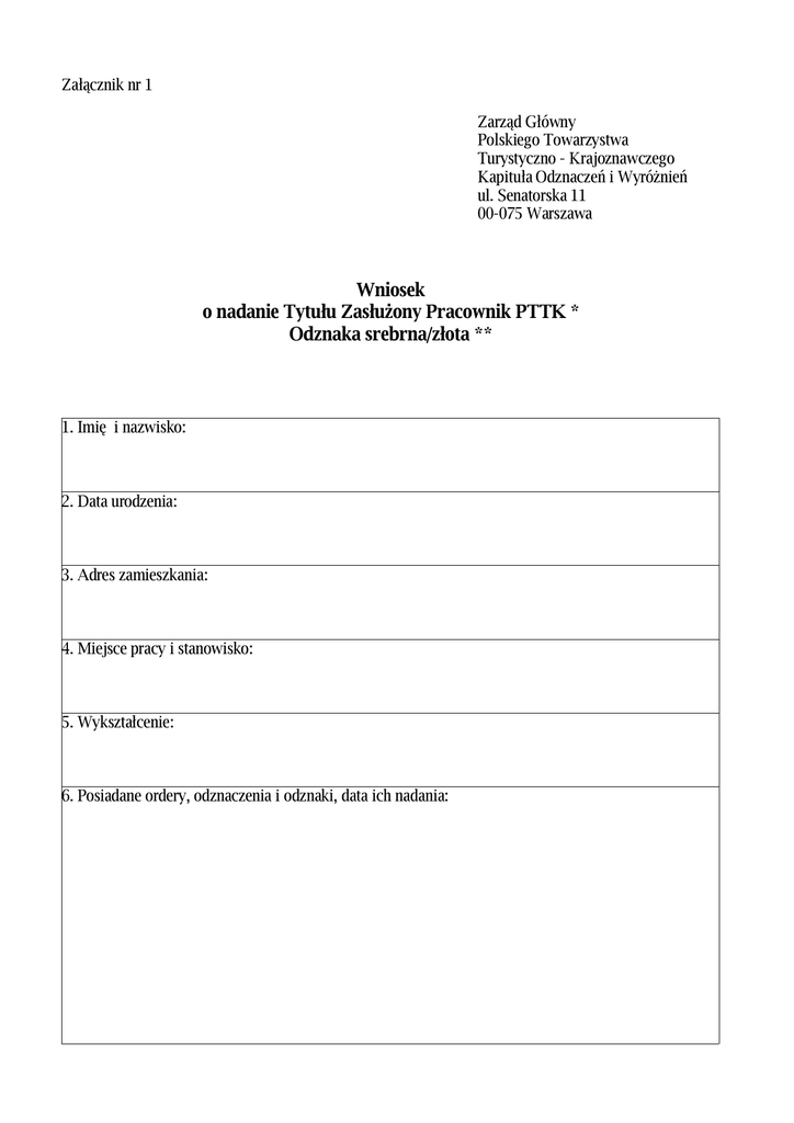 Załącznik nr 1 Zarząd Główny Polskiego Towarzystwa Turystyczno - Krajoznawczego Kapituła Odznaczeń i Wyróżnień ul. Senatorska 11 00-075 Warszawa Wniosek o nadanie Tytułu Zasłużony Pracownik PTTK * Odznaka srebrna/złota ** 1. Imię i nazwisko: 2. Data urodzenia: 3. Adres zamieszkania: 4. Miejsce pracy i stanowisko: 5. Wykształcenie: 6. Posiadane ordery, odznaczenia i odznaki, data ich nadania: 7. Uzasadnienie wniosku: 8. Wniosek przedstawia (nazwa wnioskodawcy): miejscowość i data ........................................................ podpis osoby upoważnionej .................................. 9. Decyzja Kapituły w sprawie nadania Tytułu: 10. Adnotacja o nadaniu Tytułu: Tytuł Zasłużony Pracownik PTTK - odznaka srebrna/złota nadano dnia ..................................................... * Wniosek należy wypełniać pismem drukowanym. ** Podkreślić właściwy stopień odznaki.