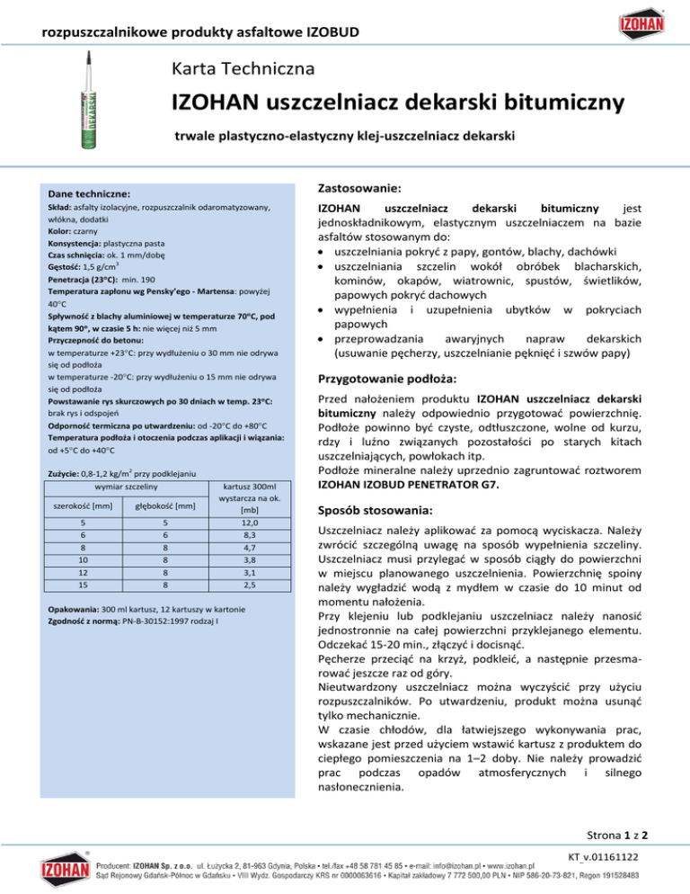 rozpuszczalnikowe produkty asfaltowe IZOBUD Karta Techniczna IZOHAN uszczelniacz dekarski bitumiczny trwale plastyczno-elastyczny klej-uszczelniacz dekarski Zastosowanie: Dane techniczne: Skład: asfalty izolacyjne, rozpuszczalnik odaromatyzowany, włókna, dodatki Kolor: czarny Konsystencja: plastyczna pasta Czas schnięcia: ok. 1 mm/dobę Gęstość: 1,5 g/cm3 Penetracja (23C): min. 190 Temperatura zapłonu wg Pensky’ego - Martensa: powyżej 40C Spływność z blachy aluminiowej w temperaturze 70C, pod kątem 90, w czasie 5 h: nie więcej niż 5 mm Przyczepność do betonu: w temperaturze +23C: przy wydłużeniu o 30 mm nie odrywa się od podłoża w temperaturze -20C: przy wydłużeniu o 15 mm nie odrywa się od podłoża Powstawanie rys skurczowych po 30 dniach w temp. 23C: brak rys i odspojeń Odporność termiczna po utwardzeniu: od -20C do +80C Temperatura podłoża i otoczenia podczas aplikacji i wiązania: od +5C do +40C Zużycie: 0,8-1,2 kg/m2 przy podklejaniu wymiar szczeliny szerokość [mm] głębokość [mm] 5 6 8 10 12 15 5 6 8 8 8 8 kartusz 300ml wystarcza na ok. [mb] 12,0 8,3 4,7 3,8 3,1 2,5 Opakowania: 300 ml kartusz, 12 kartuszy w kartonie Zgodność z normą: PN-B-30152:1997 rodzaj I Sposób stosowania cd IZOHAN uszczelniacz dekarski bitumiczny jest jednoskładnikowym, elastycznym uszczelniaczem na bazie asfaltów stosowanym do: uszczelniania pokryć z papy, gontów, blachy, dachówki uszczelniania szczelin wokół obróbek blacharskich, kominów, okapów, wiatrownic, spustów, świetlików, papowych pokryć dachowych wypełnienia i uzupełnienia ubytków w pokryciach papowych przeprowadzania awaryjnych napraw dekarskich (usuwanie pęcherzy, uszczelnianie pęknięć i szwów papy) Przygotowanie podłoża: Przed nałożeniem produktu IZOHAN uszczelniacz dekarski bitumiczny należy odpowiednio przygotować powierzchnię. Podłoże powinno być czyste, odtłuszczone, wolne od kurzu, rdzy i luźno związanych pozostałości po starych kitach uszczelniających, powłokach itp. Podłoże mineralne należy uprzednio zagruntować roztworem IZOHAN IZOBUD PENETRATOR G7. Sposób stosowania: Uszczelniacz należy aplikować za pomocą wyciskacza. Należy zwrócić szczególną uwagę na sposób wypełnienia szczeliny. Uszczelniacz musi przylegać w sposób ciągły do powierzchni w miejscu planowanego uszczelnienia. Powierzchnię spoiny należy wygładzić wodą z mydłem w czasie do 10 minut od momentu nałożenia. Przy klejeniu lub podklejaniu uszczelniacz należy nanosić jednostronnie na całej powierzchni przyklejanego elementu. Odczekać 15-20 min., złączyć i docisnąć. Pęcherze przeciąć na krzyż, podkleić, a następnie przesmarować jeszcze raz od góry. Nieutwardzony uszczelniacz można wyczyścić przy użyciu rozpuszczalników. Po utwardzeniu, produkt można usunąć tylko mechanicznie. W czasie chłodów, dla łatwiejszego wykonywania prac, wskazane jest przed użyciem wstawić kartusz z produktem do ciepłego pomieszczenia na 1–2 doby. Nie należy prowadzić prac podczas opadów atmosferycznych i silnego nasłonecznienia. Strona 1 z 2 KT_v.01161122 rozpuszczalnikowe produkty asfaltowe IZOBUD Właściwości: może być stosowany na suche i mokre podłoża ma doskonałą odporność na promieniowanie UV, starzenie i warunki atmosferyczne bezpieczny w kontakcie ze styropianem utwardza się pod wpływem odparowania rozpuszczalnika tworząc uszczelnienie o wysokiej elastyczności bardzo dobrze przyczepny do wielu podłoży bitumicznych i mineralnych Przechowywanie: Przechowywać w temperaturze od +5C do +25C w oryginalnie zamkniętych opakowaniach i chronić przed wilgocią. Termin przydatności produktu wynosi 365 dni od daty otwarcia. Uwagi: Nie należy stosować wyrobu wewnątrz pomieszczeń przeznaczonych na stały pobyt ludzi i branży żywnościowej oraz do materiałów smołowych. Wszystkie wymienione parametry odnoszą się do temperatury +23C i 55% wilgotności względnej powietrza. Wyższe temperatury i niższa wilgotność powietrza przyspieszają, a niższe temperatury i wyższa wilgotność powietrza opóźniają czas obróbki i przebieg twardnienia. Wyrób zawiera rozpuszczalniki organiczne. Przy pracy należy nosić odzież, okulary i rękawice ochronne. Wyrób należy stosować w miejscach przewiewnych, z dala od ognia. Wyrób należy chronić przed dostępem dzieci. Narzędzia zabrudzone podczas wykonywania prac izolacyjnych można czyścić rozpuszczalnikami benzynowymi. Udzielamy gwarancji odnośnie jakości naszych materiałów w ramach naszych warunków sprzedaży i dostawy. Dla budowli o specjalnych wymaganiach, których nie obejmuje niniejsza instrukcja, udostępniamy naszym Klientom własną fachową służbę doradczą. Z chwilą wydania przez nas nowej karty technicznej niniejsza instrukcja traci swą ważność. Strona 2 z 2 KT_v.01161122