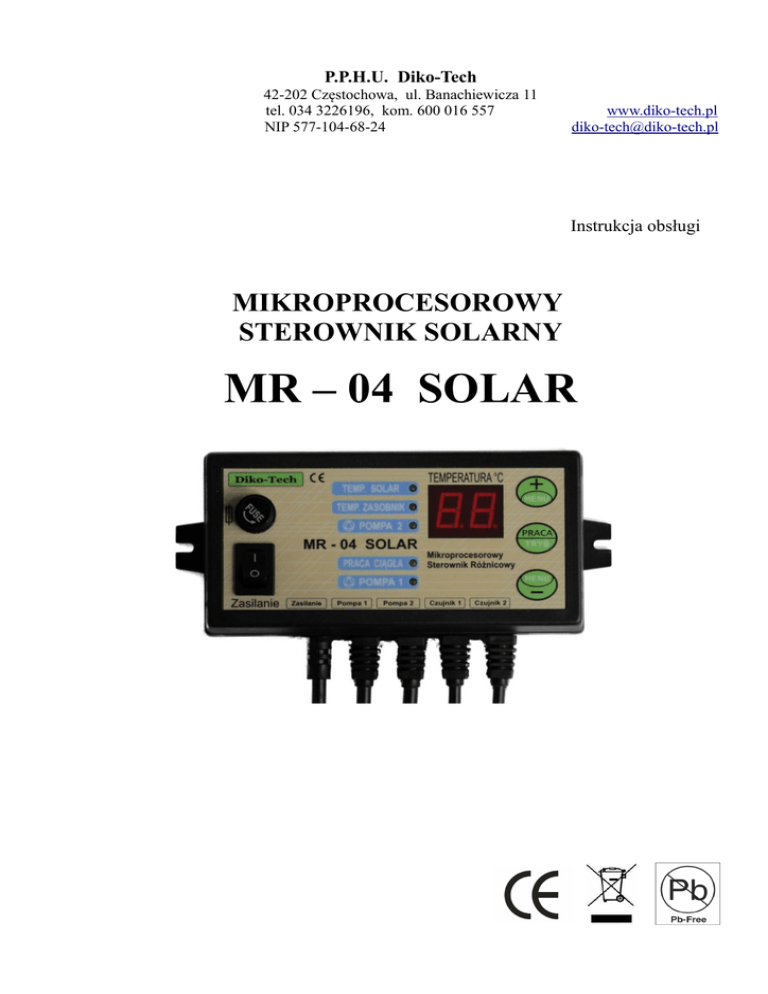 P.P.H.U. Diko-Tech 42-202 Częstochowa, ul. Banachiewicza 11 tel. 034 3226196, kom. 600 016 557 NIP 577-104-68-24 www.diko-tech.pl [email protected] Instrukcja obsługi MIKROPROCESOROWY STEROWNIK SOLARNY MR – 04 SOLAR Sterownik może być użytkowany tylko w obrębie gospodarstwa domowego i podobnego. Przed przystąpieniem do montażu, napraw czy konserwacji oraz podczas wykonywania wszelkich prac przyłączeniowych należy bezwzględnie odłączyć zasilanie sieciowe poprzez wyciągnięcie wtyczki zasilającej z gniazdka zasilającego oraz upewnić się czy zaciski i przewody elektryczne nie są pod napięciem. Po wyłączeniu sterownika za pomocą przełącznika w pozycję „0” na przewodach sterowniczych występuje napięcie niebezpieczne. Sterownik nie może być wykorzystywany niezgodnie z jego przeznaczeniem. Należy zastosować dodatkową automatykę zabezpieczającą instalację hydrauliczną oraz elektryczną przed skutkami awarii bądź błędów w jego oprogramowaniu. Należy dobrać odpowiednie wartości parametrów do danego typu kolektora uwzględniając wszystkie warunki pracy instalacji. Błędny dobór parametrów może doprowadzić do stanu awaryjnego kolektora lub zasobnika (przegrzanie kolektora lub zasobnika). Modyfikacja zaprogramowanych parametrów powinna być przeprowadzona tylko przez osobę zaznajomioną z niniejszą instrukcją. Stosować tylko w obiegach grzewczych wykonanych zgodnie z obowiązującymi przepisami. Instalacja elektryczna powinna być zabezpieczona bezpiecznikiem dobranym odpowiednio do stosowanego obciążenia. W sterowniku zastosowano odłączanie elektroniczne podłączanych urządzeń zgodnie z normą PN-EN 60730-1 (działanie typu 2Y). Oznacza to że przy zasilaniu sterownika napięciem sieciowym na wyjściach pomp występuje napięcie niebezpieczne nawet gdy nie są wysterowane. Chronić sterownik przed dostępem dzieci oraz osób niepowołanych. UWAGA URZADZENIE ELEKTRYCZNE POD NAPIĘCIEM Montaż urządzenia należy powierzyć osobie posiadającej odpowiednie uprawnienia elektryczne!!! Przed uruchomieniem sterownika należy dokonać skuteczności zerowania pomp, oraz pomiaru izolacji przewodów elektrycznych. Przed dokonaniem jakichkolwiek czynności związanych z zasilaniem urządzenia, podłączeniem pompy oraz montażem czujnika należy upewnić się że sterownik nie jest pod napięciem sieci. (odłącz wtyczkę zasilającą z gniazdka) Strona 2 1. Przeznaczenie Sterownik MR-04 SOLAR przeznaczony jest do pracy: - w układzie ciepłej wody użytkowej (C.W.U.) - w układzie solarnym - centralnego ogrzewania (C.O.) - praca z wymiennikiem Wyjście nazwane „pompa 2” może obsługiwać dodatkowo: - pompa obiegowa C.W.U. Z dodatkową funkcją czasowego włącz/wyłącz - elektrozawór bezpieczeństwa, - dogrzewanie wody poprzez dodatkowe źródło ciepła np. obieg C.O. lub grzałka - sterowanie grzałką tylko przy braku energii cieplnej z kolektora. Załączenie pompy nr1 następuje po osiągnięciu różnicy temperatur między czujnikiem pierwszym i drugim a wyłączenie o histerezę ustawioną w sterowniku. Dodatkowo chroni pompę przed zastaniem (funkcja Anty-Stop). Do wyboru mamy pracę pompy ze stałą mocą lub płynną zależną od różnicy temperatur pomiędzy czujnikami. Pompa nr2 załącza się w zależności od podprogramu, opis w dalszej części instrukcji. Jest przystosowany do pracy z wodą jak i płynem niezamarzającym np. glikol. Sterownik może obsługiwać następujące układy solarne: 2. Ładowanie zasobnika przez 1. Ładowanie zasobnika CWU przez kolektor solarny, dodatkowo steruje kolektor solarny (wersja podstawowa) pompą obiegową CWU (pompa nr2) Strona 3 3. Ładowanie zasobnika CWU z funkcją dogrzewania grzałką, konieczne rozbudowanie o część wykonawczą (stycznik). 5. Ładowanie zasobnika CWU przez kolektor solarny oraz kocioł C.O. dwie wężownice. 4. Ładowanie zasobnika CWU z funkcją zrzutu nadmiaru ciepła 6. Ładowanie zasobnika CWU z funkcją dogrzewania grzałką z priorytetem dla dogrzewania przez kolektor ( ogranicza zużycie energii elektrycznej) konieczne rozbudowanie o część wykonawczą (stycznik). 7. Ładowanie zasobnika CWU z funkcją przeładowania ciepła do drugiego zasobnika Strona 4 2. Zasada działania Sterownik dąży do jak najefektywniejszego wykorzystania energii cieplnej z kolektora słonecznego lub pieca w celu nagrzania wody i utrzymania jej na jak najwyższym poziomie. Rozwiązanie to oszczędza znaczne ilości energii oraz nie wychładza bojlera przez kolektor lub piec gdy temperatura na nim spadnie. Sterownik spełnia zadanie też w układzie centralnego ogrzewania lub z wymiennikiem. Funkcja wakacje pozwala na zrzut ciepła do kolektora słonecznego bez potrzeby dodatkowego schładzania zasobnika CWU podczas nieobecności domowników. Wyjście sterownicze Pompa nr2 jest uniwersalnym wyjściem programowanym przez użytkownika mogącym pracować z jednym z następujących podprogramów: - P0 Sterowanie pompą obiegową CWU lub elektrozaworem bezpieczeństwa w przypadku zbyt wysokiej temperatury, regulowany w zakresie od 25°C do 95°C. Z histerezą 4°C. - P1 Sterowanie dogrzewaniem wody w zasobniku przez dodatkowe źródło ciepła np. instalacja C.O. lub dodatkowa grzałka elektryczna. - P2 Sterowanie dogrzewaniem wody w zasobniku przez grzałkę elektryczną z funkcją inteligentnej kontroli zużycia energii elektrycznej. W tym rozwiązaniu jeżeli sterownik wykryje dogrzewanie wody przez kolektor słoneczny wyłączy grzałkę by ograniczyć zużycie energii elektrycznej i tym samym obniżyć koszty ogrzania wody użytkowej. Funkcja czasowego włącz/wyłącz pozwala uruchamiać pompę na krótkie odcinki czasu np. w celu dogrzania obiegu CWU. 3. Funkcje Sterownika - Wskazania temperatury z dwóch punktów pomiarowych na przemian. - Automatyczna lub ciągła praca pompy nr1 - Programowane wyjście sterownicze nr2 - Diody sygnalizujące stan pracy urządzeni