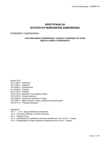 Numer referencyjny – P/66/IW/14 SPECYFIKACJA ISTOTNYCH WARUNKÓW ZAMÓWIENIA PRZEDMIOT ZAMÓWIENIA: DOSTAWA MIĘSA CZERWONEGO, TŁUSZCZY ZWIERZĘCYCH ORAZ WĘDLIN Z MIĘSA CZERWONEGO. Numer CPV: 15111100-0 – Wołowina 15111200-1 - Cielęcina 15113000-3 – Wieprzowina 15114000-0 – Podroby 15131130-5 – Wędliny 15131134-3- Kaszanka i inne wędliny krwiste 15131210-0 – Szynka wędzona 15131000-5 – Konserwy i przetwory z mięsa 15131200-7 - Mięso suszone, solone, wędzone lub marynowane 15412111-0 – Tłuszcze zwierzęce Załączniki: Nr 1.1 – 1.42 – Opisy przedmiotu zamówienia. Nr 2 – Formularz ofertowy z wzorami wykazów. Nr 3 – Projekt umowy. Nr 4 – Oświadczenie o spełnianiu warunków określonych w art. 22 ust. 1 ustawy. Nr 5 – Oświadczenie o braku podstaw do wykluczenia art. 24 ust. 1 ustawy. Strona 1 z 155 Numer referencyjny – P/66/IW/14 1. Specyfikacja Istotnych Warunków Zamówienia została sporządzona zgodnie z ustawą z dnia 29 stycznia 2004 r. Prawo Zamówień Publicznych (tekst jedn. Dz. U. z 2013 r. poz. 907 z późn. zm.) i uregulowaniami prawnymi wydanymi na jej podstawie oraz innymi aktami prawnymi. 2. Zamawiający jest jednostką budżetową i nie jest płatnikiem podatku VAT UE w rozumieniu przepisów ustawy z dnia 11 marca 2004 r. o podatku od towarów i usług (Dz. U. Nr 54, poz. 535 z późn. zm.). 3. Ilekroć w treści występuje słowo „Ustawa”, Zamawiający przywołuje ustawę Prawo Zamówień Publicznych. 4. Ilekroć w treści występuje słowo „SIWZ” Zamawiający przywołuje Specyfikację Istotnych Warunków Zamówienia. I NAZWA ORAZ ADRES ZAMAWIAJĄCEGO JEDNOSTKA WOJSKOWA NR 4620 UL. OKÓLNA 37, 87 – 100 TORUŃ faks +48 56 653 36 60, tel. +48 56 653 38 24 strona internetowa: www.12wog.pl NIP: 956-228-88-38; REGON: 340901725 II TRYB UDZIELENIA ZAMÓWIENIA Zamawiający zaprasza do składania ofert w ramach postępowania prowadzonego w trybie przetargu nieograniczonego, o szacunkowej wartości zamówienia przekraczającej kwoty określone w przepisach wydanych na podstawie art. 11 ust. 8 ustawy. III OPIS PRZEDMIOTU ZAMÓWIENIA 1. Przedmiotem zamówienia jest: Dostawa mięsa czerwonego, tłuszczy zwierzęcych oraz wędlin z mięsa czerwonego, w asortymencie i ilościach podanych w rozdziale IV niniejszej specyfikacji. 2. Przedmiot zamówienia winien spełniać wymagania określone w obowiązujących przepisach prawa dotyczącego żywności, w szczególności w przepisach wymienionych w załącznikach nr 1.1 – 1.42 do SIWZ. 3. Szczegółowe wymogi dla przedmiotu zamówienia zawarto w załącznikach 1.1 – 1.42 do SIWZ („Opis przedmiotu zamówienia”). 4. Zamawiający określił minimalne ilości zakupu oraz ilości planowane, które będą realizowane po potwierdzeniu otrzymania środków finansowych. 5. Miejsce realizacji: dostawy realizowane będą do jednostek wojskowych w Toruniu i Inowrocławiu, w asortymencie i ilościach wskazanych każdorazowo przez Odbiorcę w zamówieniu oraz w opakowaniach przewidzianych w umowie – pod rygorem odmowy przyjęcia dostawy i dokonania zapłaty. 6. Przyjęcie dostaw odbywać się będzie w poniedziałki, środy i piątki w godzinach od 7:00 do 13:00. 7. Zamawiający zastrzega sobie możliwość w formie pisemnej zmniejszenia przyjętych w umowie ilości, wartości i częstotliwości dostaw, w sytuacjach, których Zamawiający nie mógł przewidzieć w chwili jej zawarcia (np. restrukturyzacja sił zbrojnych, zmiany ilości żywionych żołnierzy). Wartością umowy będzie wówczas końcowa wartość faktycznie zrealizowanych dostaw. Zamawiający nie będzie ponosił ujemnych skutków spowodowanych zmniejszeniem ilości i wartości dostaw przewidzianych w umowie. 8. Zamawiający zastrzega sobie prawo do weryfikacji zgodności norm jakościowych dostarczanych produktów z jakością ustaloną w niniejszej SIWZ. Prawo do kontroli (tj. pobrania prób i badania dostarczonego towaru) w imieniu Zamawiającego przysługuje właściwemu miejscowo dla Zamawiającego lub Odbiorcy akredytowanemu laboratorium lub laboratorium spełniającemu wymagania normy PN-EN ISO/IEC 17025. Koszt pobrania prób i badania żywności poniesie Wykonawca w każdym przypadku, jeżeli ocena jakości dostarczonych towarów dokonana przez laboratoria przywołane wyżej okaże się niezgodna z normami jakościowymi i opisem przedmiotu zamówienia. 9. W szczególnie uzasadnionych przypadkach (np. osiągania wyższych stanów gotowości bojowej, szkolenia rezerw osobowych, likwidacji klęsk żywiołowych, restrukturyzacji sił zbrojnych, kryzysu, Strona 2 z 155 Numer referencyjny – P/66/IW/14 zagrożenia lub wojny lub innych zadań postawionych Zamawiającemu przez organa władzy państwowej), Wykonawca zagwarantuje bezpłatny dowóz towaru oraz zwiększenie ilości i częstotliwości dostaw (przy niezmienności wartości umowy) do miejsc stacjonowania jednostek wojskowych oraz innych miejsc wskazanych przez Zamawiającego. Zamawiający zastrzega sobie możliwość dostaw we wskazane przez siebie miejsce w odległości do 40 km od granic administracyjnych m. Torunia / Inowrocławia. 10. Zamawiający powiadomi pisemnie Wykonawcę o zmianach, o których mowa w pkt 9, ze wskazaniem ich przyczyny, określeniem wymaganych ilości towaru do poszczególnych Odbiorców, częstotliwości dostaw oraz wskazaniem ewentualnie nowych Odbiorców, z konkretnym wskazaniem dnia, do którego będą zmiany obowiązywały. 11. Wykonawca zobowiązuje się dostarczyć przedmiot zamówienia transportem zgodnie wymogami rozporządzenia (WE) nr 853/2004 Parlamentu Europejskiego i Rady z dnia 29 kwietnia 2004 r. ustanawiającego szczególne przepisy dotyczące higieny w odniesieniu do żywności pochodzenia zwierzęcego (Dz.U. z 2006r nr. 171 poz. 1225) i rozporządzenia (WE) nr 852 /2004 Parlamentu Europejskiego i Rady z dnia 29 kwietnia 2004r w sprawie higieny środków spożywczych (DZ.U. UE L 139 z 30 kwietnia 2004r, str.1 , Dz.U. UE 