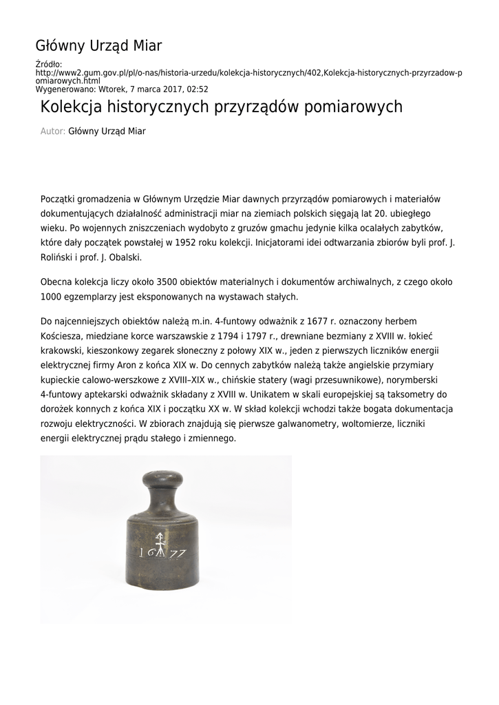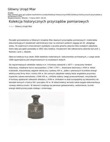 Główny Urząd Miar Źródło: http://www2.gum.gov.pl/pl/o-nas/historia-urzedu/kolekcja-historycznych/402,Kolekcja-historycznych-przyrzadow-p omiarowych.html Wygenerowano: Wtorek, 7 marca 2017, 02:52 Kolekcja historycznych przyrządów pomiarowych Autor: Główny Urząd Miar Początki gromadzenia w Głównym Urzędzie Miar dawnych przyrządów pomiarowych i materiałów dokumentujących działalność administracji miar na ziemiach polskich sięgają lat 20. ubiegłego wieku. Po wojennych zniszczeniach wydobyto z gruzów gmachu jedynie kilka ocalałych zabytków, które dały początek powstałej w 1952 roku kolekcji. Inicjatorami idei odtwarzania zbiorów byli prof. J. Roliński i prof. J. Obalski. Obecna kolekcja liczy około 3500 obiektów materialnych i dokumentów archiwalnych, z czego około 1000 egzemplarzy jest eksponowanych na wystawach stałych. Do najcenniejszych obiektów należą m.in. 4-funtowy odważnik z 1677 r. oznaczony herbem Kościesza, miedziane korce warszawskie z 1794 i 1797 r., drewniane bezmiany z XVIII w. łokieć krakowski, kieszonkowy zegarek słoneczny z połowy XIX w., jeden z pierwszych liczników energii elektrycznej firmy Aron z końca XIX w. Do cennych zabytków należą także angielskie przymiary kupieckie calowo-werszkowe z XVIII–XIX w., chińskie statery (wagi przesuwnikowe), norymberski 4-funtowy aptekarski odważnik składany z XVIII w. Unikatem w skali europejskiej są taksometry do dorożek konnych z końca XIX i początku XX w. W skład kolekcji wchodzi także bogata dokumentacja rozwoju elektryczności. W zbiorach znajdują się pierwsze galwanometry, woltomierze, liczniki energii elektrycznej prądu stałego i zmiennego. Urząd posiada bogaty zbiór odważników i wag, który ukazuje rozwój wagarstwa w XIX i XX w. Wśród polskich, niemieckich (pruskich), rosyjskich czy austriackich odważników, wykonywanych najczęściej z żeliwa lub stali, znajdują się również odważniki szklane, porcelanowe i bakelitowe. Wśród wag należy wymienić wagi stołowe typu Robervala czy Berangera, równoramienne wagi słupkowe, wagi uchylne, statery oraz bezmiany. Kolekcja GUM jako jedyna w kraju eksponuje najdokładniejsze urządzenia do mierzenia czasu i częstotliwości – cezowe zegary atomowe. Zgromadzona dokumentacja fotograficzna, ukazuje pracę członków polskiej administracji miar oraz prezentuje nieistniejące już stanowiska pomiarowe. W podręcznej biblioteczce znajdują się cenne woluminy m.in. tłumaczenie dzieła Tytusa Liwiusza Burattiniego Misura Universale z 1675 r. (wydanie PAU z 1897 r.), Edykt względem powszechnego ustanowienia miar i wag w prowincji Prus Południowych Fryderyka Wilhelma z 1796 r. (w języku polskim i niemieckim), Porównanie miar i wag polskich z zagranicznymi W. Kolberga z 1819 r. Zorganizowane grupy, zainteresowane zapoznaniem się z naszymi zbiorami, zapraszamy do wcześniejszego kontaktu: Kaja Drąg ul. Elektoralna 2 Główny Urząd Miar 00-139 Warszawa tel.: (22) 581 90 71