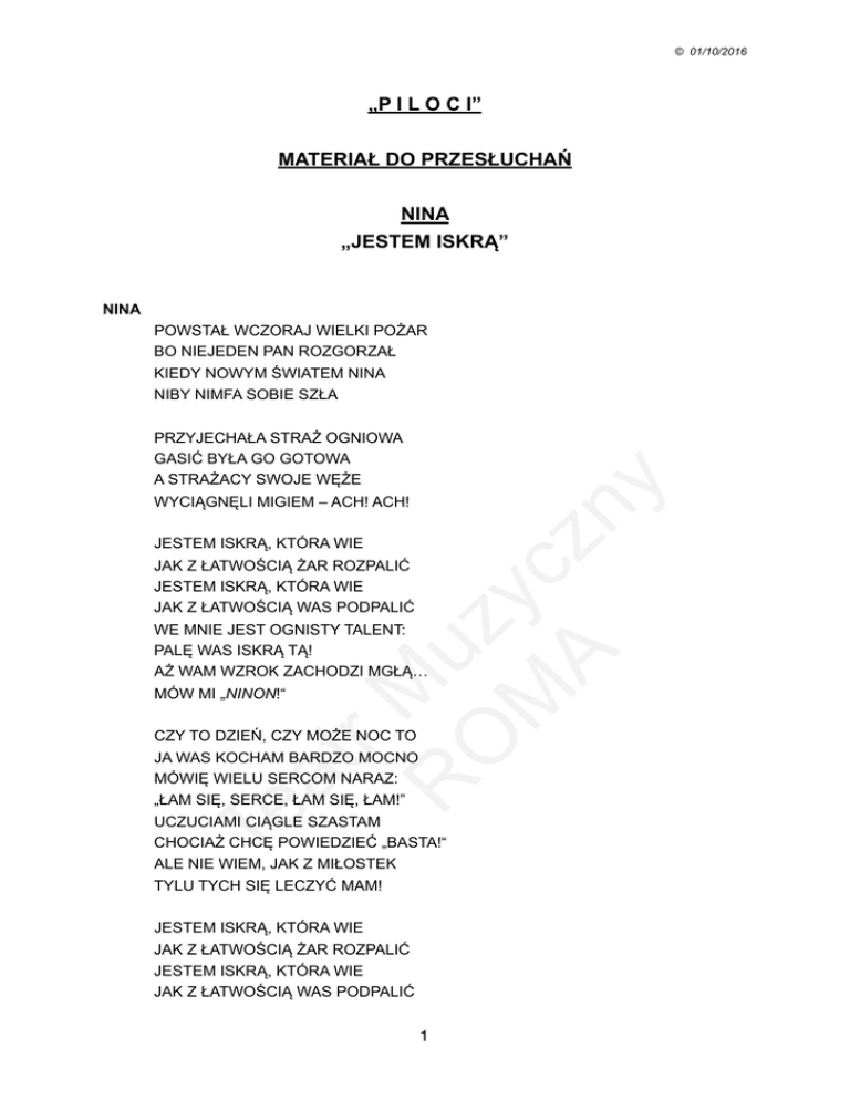 © 01/10/2016 „P I L O C I” MATERIAŁ DO PRZESŁUCHAŃ NINA „JESTEM ISKRĄ” NINA POWSTAŁ WCZORAJ WIELKI POŻAR BO NIEJEDEN PAN ROZGORZAŁ KIEDY NOWYM ŚWIATEM NINA NIBY NIMFA SOBIE SZŁA y PRZYJECHAŁA STRAŻ OGNIOWA GASIĆ BYŁA GO GOTOWA A STRAŻACY SWOJE WĘŻE tr M R u O zy M c A zn WYCIĄGNĘLI MIGIEM – ACH! ACH! JESTEM ISKRĄ, KTÓRA WIE JAK Z ŁATWOŚCIĄ ŻAR ROZPALIĆ JESTEM ISKRĄ, KTÓRA WIE JAK Z ŁATWOŚCIĄ WAS PODPALIĆ WE MNIE JEST OGNISTY TALENT: PALĘ WAS ISKRĄ TĄ! AŻ WAM WZROK ZACHODZI MGŁĄ… MÓW MI „NINON!“ CZY TO DZIEŃ, CZY MOŻE NOC TO Te a JA WAS KOCHAM BARDZO MOCNO MÓWIĘ WIELU SERCOM NARAZ: „ŁAM SIĘ, SERCE, ŁAM SIĘ, ŁAM!” UCZUCIAMI CIĄGLE SZASTAM CHOCIAŻ CHCĘ POWIEDZIEĆ „BASTA!“ ALE NIE WIEM, JAK Z MIŁOSTEK TYLU TYCH SIĘ LECZYĆ MAM! JESTEM ISKRĄ, KTÓRA WIE JAK Z ŁATWOŚCIĄ ŻAR ROZPALIĆ JESTEM ISKRĄ, KTÓRA WIE JAK Z ŁATWOŚCIĄ WAS PODPALIĆ 1 © 01/10/2016 LECZ JEŻELI KTÓRYŚ Z WAS Te a tr M R u O zy M c A zn y CHCE ZE MNĄ ZROBIĆ QUI PRO QUO USŁYSZY TYLKO TO: „MÓJ PANIE, SIO!” 2