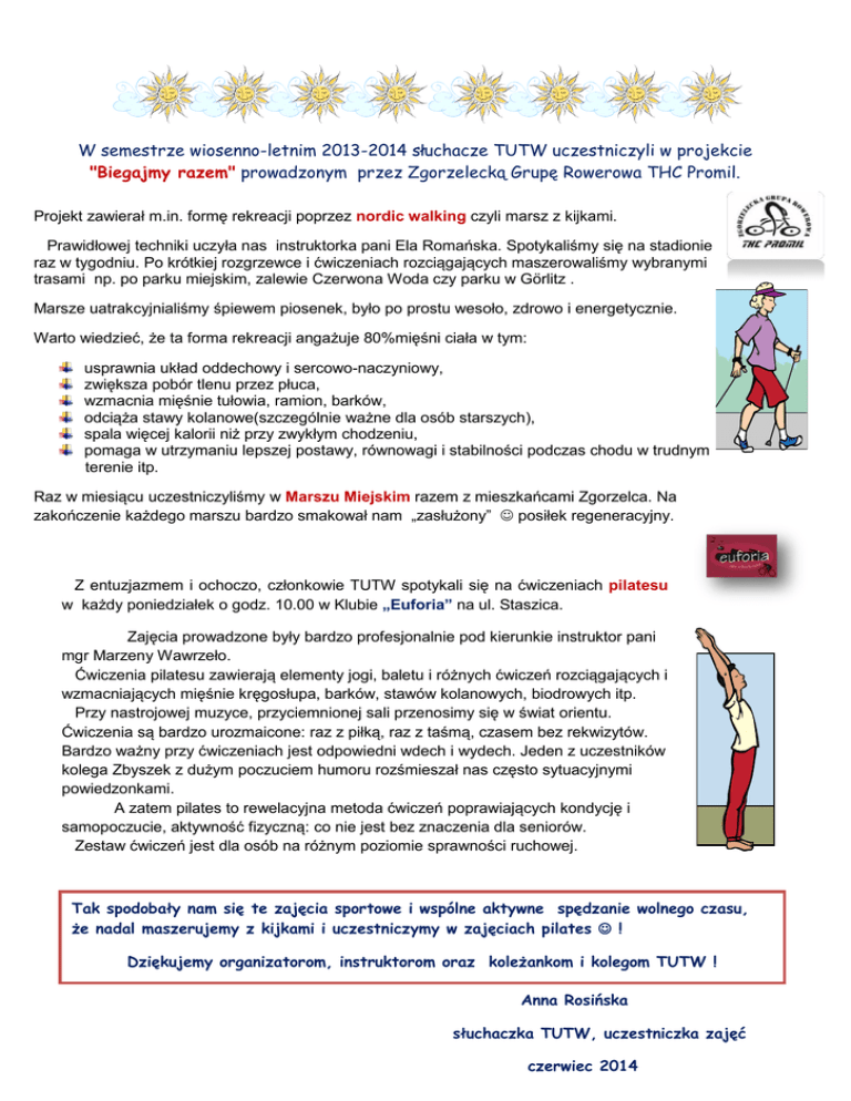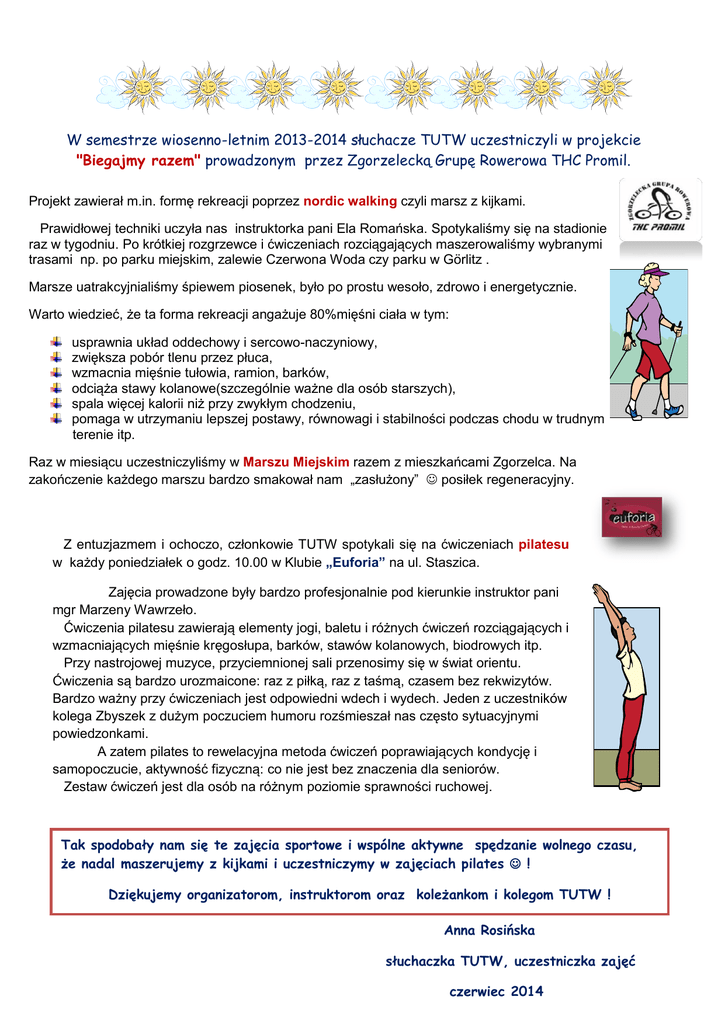 W semestrze wiosenno-letnim 2013-2014 słuchacze TUTW uczestniczyli w projekcie "Biegajmy razem" prowadzonym przez Zgorzelecką Grupę Rowerowa THC Promil. Projekt zawierał m.in. formę rekreacji poprzez nordic walking czyli marsz z kijkami. Prawidłowej techniki uczyła nas instruktorka pani Ela Romańska. Spotykaliśmy się na stadionie raz w tygodniu. Po krótkiej rozgrzewce i ćwiczeniach rozciągających maszerowaliśmy wybranymi trasami np. po parku miejskim, zalewie Czerwona Woda czy parku w Görlitz . Marsze uatrakcyjnialiśmy śpiewem piosenek, było po prostu wesoło, zdrowo i energetycznie. Warto wiedzieć, że ta forma rekreacji angażuje 80%mięśni ciała w tym: usprawnia układ oddechowy i sercowo-naczyniowy, zwiększa pobór tlenu przez płuca, wzmacnia mięśnie tułowia, ramion, barków, odciąża stawy kolanowe(szczególnie ważne dla osób starszych), spala więcej kalorii niż przy zwykłym chodzeniu, pomaga w utrzymaniu lepszej postawy, równowagi i stabilności podczas chodu w trudnym terenie itp. Raz w miesiącu uczestniczyliśmy w Marszu Miejskim razem z mieszkańcami Zgorzelca. Na zakończenie każdego marszu bardzo smakował nam „zasłużony” posiłek regeneracyjny. Z entuzjazmem i ochoczo, członkowie TUTW spotykali się na ćwiczeniach pilatesu w każdy poniedziałek o godz. 10.00 w Klubie „Euforia” na ul. Staszica. Zajęcia prowadzone były bardzo profesjonalnie pod kierunkie instruktor pani mgr Marzeny Wawrzeło. Ćwiczenia pilatesu zawierają elementy jogi, baletu i różnych ćwiczeń rozciągających i wzmacniających mięśnie kręgosłupa, barków, stawów kolanowych, biodrowych itp. Przy nastrojowej muzyce, przyciemnionej sali przenosimy się w świat orientu. Ćwiczenia są bardzo urozmaicone: raz z piłką, raz z taśmą, czasem bez rekwizytów. Bardzo ważny przy ćwiczeniach jest odpowiedni wdech i wydech. Jeden z uczestników kolega Zbyszek z dużym poczuciem humoru rozśmieszał nas często sytuacyjnymi powiedzonkami. A zatem pilates to rewelacyjna metoda ćwiczeń poprawiających kondycję i samopoczucie, aktywność fizyczną: co nie jest bez znaczenia dla seniorów. Zestaw ćwiczeń jest dla osób na różnym poziomie sprawności ruchowej. Tak spodobały nam się te zajęcia sportowe i wspólne aktywne spędzanie wolnego czasu, że nadal maszerujemy z kijkami i uczestniczymy w zajęciach pilates ! Dziękujemy organizatorom, instruktorom oraz koleżankom i kolegom TUTW ! Anna Rosińska słuchaczka TUTW, uczestniczka zajęć czerwiec 2014