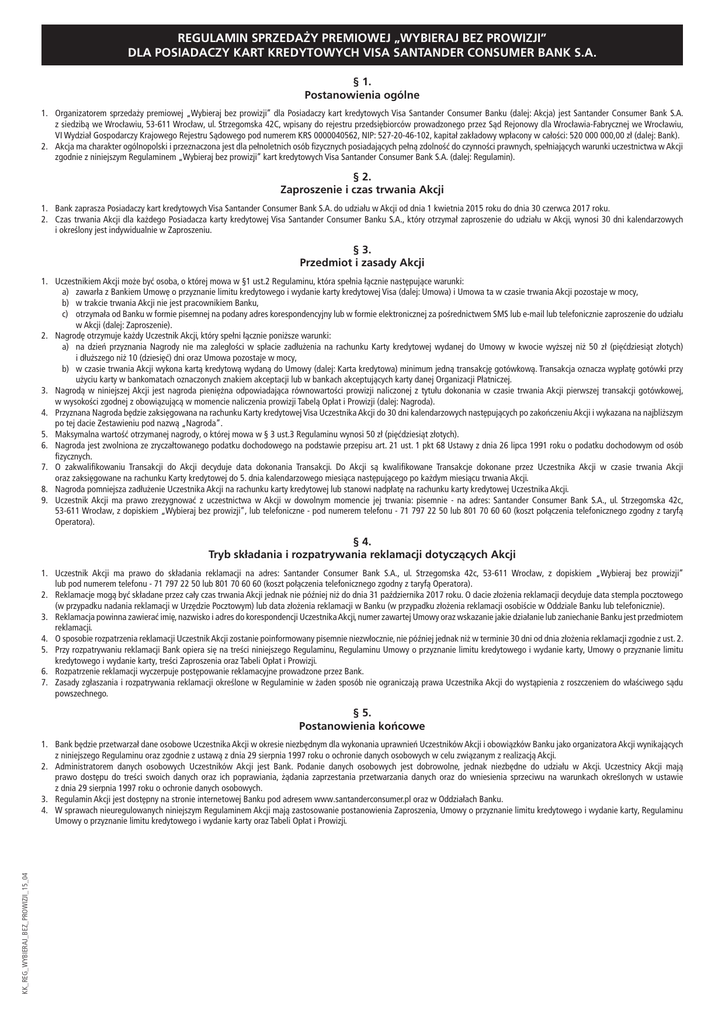 REGULAMIN SPRZEDAŻY PREMIOWEJ „WYBIERAJ BEZ PROWIZJI” DLA POSIADACZY KART KREDYTOWYCH VISA SANTANDER CONSUMER BANK S.A. § 1. Postanowienia ogólne 1. Organizatorem sprzedaży premiowej „Wybieraj bez prowizji” dla Posiadaczy kart kredytowych Visa Santander Consumer Banku (dalej: Akcja) jest Santander Consumer Bank S.A. z siedzibą we Wrocławiu, 53-611 Wrocław, ul. Strzegomska 42C, wpisany do rejestru przedsiębiorców prowadzonego przez Sąd Rejonowy dla Wrocławia-Fabrycznej we Wrocławiu, VI Wydział Gospodarczy Krajowego Rejestru Sądowego pod numerem KRS 0000040562, NIP: 527-20-46-102, kapitał zakładowy wpłacony w całości: 520 000 000,00 zł (dalej: Bank). 2. Akcja ma charakter ogólnopolski i przeznaczona jest dla pełnoletnich osób fizycznych posiadających pełną zdolność do czynności prawnych, spełniających warunki uczestnictwa w Akcji zgodnie z niniejszym Regulaminem „Wybieraj bez prowizji” kart kredytowych Visa Santander Consumer Bank S.A. (dalej: Regulamin). § 2. Zaproszenie i czas trwania Akcji 1. Bank zaprasza Posiadaczy kart kredytowych Visa Santander Consumer Bank S.A. do udziału w Akcji od dnia 1 kwietnia 2015 roku do dnia 30 czerwca 2017 roku. 2. Czas trwania Akcji dla każdego Posiadacza karty kredytowej Visa Santander Consumer Banku S.A., który otrzymał zaproszenie do udziału w Akcji, wynosi 30 dni kalendarzowych i określony jest indywidualnie w Zaproszeniu. § 3. Przedmiot i zasady Akcji 1. Uczestnikiem Akcji może być osoba, o której mowa w §1 ust.2 Regulaminu, która spełnia łącznie następujące warunki: a) zawarła z Bankiem Umowę o przyznanie limitu kredytowego i wydanie karty kredytowej Visa (dalej: Umowa) i Umowa ta w czasie trwania Akcji pozostaje w mocy, b) w trakcie trwania Akcji nie jest pracownikiem Banku, c) otrzymała od Banku w formie pisemnej na podany adres korespondencyjny lub w formie elektronicznej za pośrednictwem SMS lub e-mail lub telefonicznie zaproszenie do udziału w Akcji (dalej: Zaproszenie). 2. Nagrodę otrzymuje każdy Uczestnik Akcji, który spełni łącznie poniższe warunki: a) na dzień przyznania Nagrody nie ma zaległości w spłacie zadłużenia na rachunku Karty kredytowej wydanej do Umowy w kwocie wyższej niż 50 zł (pięćdziesiąt złotych) i dłuższego niż 10 (dziesięć) dni oraz Umowa pozostaje w mocy, b) w czasie trwania Akcji wykona kartą kredytową wydaną do Umowy (dalej: Karta kredytowa) minimum jedną transakcję gotówkową. Transakcja oznacza wypłatę gotówki przy użyciu karty w bankomatach oznaczonych znakiem akceptacji lub w bankach akceptujących karty danej Organizacji Płatniczej. 3. Nagrodą w niniejszej Akcji jest nagroda pieniężna odpowiadająca równowartości prowizji naliczonej z tytułu dokonania w czasie trwania Akcji pierwszej transakcji gotówkowej, w wysokości zgodnej z obowiązującą w momencie naliczenia prowizji Tabelą Opłat i Prowizji (dalej: Nagroda). 4. Przyznana Nagroda będzie zaksięgowana na rachunku Karty kredytowej Visa Uczestnika Akcji do 30 dni kalendarzowych następujących po zakończeniu Akcji i wykazana na najbliższym po tej dacie Zestawieniu pod nazwą „Nagroda”. 5. Maksymalna wartość otrzymanej nagrody, o której mowa w § 3 ust.3 Regulaminu wynosi 50 zł (pięćdziesiąt złotych). 6. Nagroda jest zwolniona ze zryczałtowanego podatku dochodowego na podstawie przepisu art. 21 ust. 1 pkt 68 Ustawy z dnia 26 lipca 1991 roku o podatku dochodowym od osób fizycznych. 7. O zakwalifikowaniu Transakcji do Akcji decyduje data dokonania Transakcji. Do Akcji są kwalifikowane Transakcje dokonane przez Uczestnika Akcji w czasie trwania Akcji oraz zaksięgowane na rachunku Karty kredytowej do 5. dnia kalendarzowego miesiąca następującego po każdym miesiącu trwania Akcji. 8. Nagroda pomniejsza zadłużenie Uczestnika Akcji na rachunku karty kredytowej lub stanowi nadpłatę na rachunku karty kredytowej Uczestnika Akcji. 9. Uczestnik Akcji ma prawo zrezygnować z uczestnictwa w Akcji w dowolnym momencie jej trwania: pisemnie - na adres: Santander Consumer Bank S.A., ul. Strzegomska 42c, 53-611 Wrocław, z dopiskiem „Wybieraj bez prowizji”, lub telefoniczne - pod numerem telefonu - 71 797 22 50 lub 801 70 60 60 (koszt połączenia telefonicznego zgodny z taryfą Operatora). § 4. Tryb składania i rozpatrywania reklamacji dotyczących Akcji 1. Uczestnik Akcji ma prawo do składania reklamacji na adres: Santander Consumer Bank S.A., ul. Strzegomska 42c, 53-611 Wrocław, z dopiskiem „Wybieraj bez prowizji” lub pod numerem telefonu - 71 797 22 50 lub 801 70 60 60 (koszt połączenia telefonicznego zgodny z taryfą Operatora). 2. Reklamacje mogą być składane przez cały czas trwania Akcji jednak nie później niż do dnia 31 października 2017 roku. O dacie złożenia reklamacji decyduje data stempla pocztowego (w przypadku nadania reklamacji w Urzędzie Pocztowym) lub data złożenia reklamacji w Banku (w przypadku złożenia reklamacji osobiście w Oddziale Banku lub telefonicznie). 3. Reklamacja powinna zawierać imię, nazwisko i adres do korespondencji Uczestnika Akcji, numer zawartej Umowy oraz wskazanie jakie działanie lub zaniechanie Banku jest przedmiotem reklamacji. 4. O sposobie rozpatrzenia reklamacji Uczestnik Akcji zostanie poinformowany pisemnie niezwłocznie, nie później jednak niż w terminie 30 dni od dnia złożenia reklamacji zgodnie z ust. 2. 5. Przy rozpatrywaniu reklamacji Bank opiera się na treści niniejszego Regulaminu, Regulaminu Umowy o przyznanie limitu kredytowego i wydanie karty, Umowy o przyznanie limitu kredytowego i wydanie karty, treści Zaproszenia oraz Tabeli Opłat i Prowizji. 6. Rozpatrzenie reklamacji wyczerpuje postępowanie reklamacyjne prowadzone przez Bank. 7. Zasady zgłaszania i rozpatrywania reklamacji określone w Regulaminie w żaden sposób nie ograniczają prawa Uczestnika Akcji do wystąpienia z roszczeniem do właściwego sądu powszechnego. § 5. Postanowienia koń