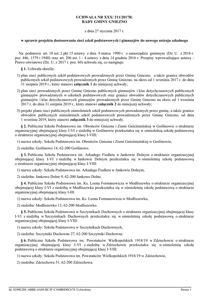 UCHWAŁA NR XXX/ 211/2017R. RADY GMINY GNIEZNO z dnia 27 stycznia 2017 r. w sprawie projektu dostosowania sieci szkół podstawowych i gimnazjów do nowego ustroju szkolnego Na podstawie art. 18 ust. 2 pkt 15 ustawy z dnia 8 marca 1990 r. o samorządzie gminnym (Dz. U. z 2016 r. poz. 446, 1579 i 1948) oraz art. 206 ust. 1 - 4 ustawy z dnia 14 grudnia 2016 r. Przepisy wprowadzające ustawę Prawo oświatowe (Dz. U. z 2017 r. poz. 60) uchwala się, co następuje: § 1. Uchwała określa: 1) plan sieci publicznych szkół podstawowych prowadzonych przez Gminę Gniezno, a także granice obwodów publicznych szkół podstawowych prowadzonych przez Gminę Gniezno, na okres od 1 września 2017 r. do dnia 31 sierpnia 2019 r., który stanowi załącznik 1 do niniejszej uchwały; 2) plan sieci prowadzonych przez Gminę Gniezno publicznych gimnazjów i klas dotychczasowych publicznych gimnazjów prowadzonych w szkołach podstawowych oraz granice obwodów dotychczasowych publicznych gimnazjów i klas dotychczasowych gimnazjów prowadzonych przez Gminę Gniezno na okres od 1 września 2017 r. do dnia 31 sierpnia 2019 r., który stanowi załącznik 2 do niniejszej uchwały; 3) projekt planu sieci publicznych ośmioletnich szkół podstawowych prowadzonych przez gminę, a także granice obwodów publicznych ośmioletnich szkół podstawowych prowadzonych przez Gminę Gniezno, od dnia 1 września 2019, który stanowi załącznik 3 do niniejszej uchwały. § 2. Publiczna Szkoła Podstawowa im. Obrońców Gniezna i Ziemi Gnieźnieńskiej w Goślinowie o strukturze organizacyjnej obejmującej klasy I-VI z siedzibą w Goślinowie przekształca się w ośmioletnią szkołę podstawową o strukturze organizacyjnej obejmującej klasy I-VIII: 1) nazwa szkoły: Szkoła Podstawowa im. Obrońców Gniezna i Ziemi Gnieźnieńskiej w Goślinowie, 2) siedziba: Goślinowo 14, 62-200 Goślinowo. § 3. Publiczna Szkoła Podstawowa im. Arkadego Fiedlera w Jankowie Dolnym o strukturze organizacyjnej obejmującej klasy I-VI z siedzibą w Jankowie Dolnym przekształca się w ośmioletnią szkołę podstawową o strukturze organizacyjnej obejmującej klasy I-VIII: 1) nazwa szkoły: Szkoła Podstawowa im. Arkadego Fiedlera w Jankowie Dolnym, 2) siedziba: Jankowo Dolne 9, 62-200 Jankowo Dolne. § 4. Publiczna Szkoła Podstawowa im. Ks. Leona Formanowicza w Modliszewku o strukturze organizacyjnej obejmującej klasy I-VI z siedzibą w Modliszewku przekształca się w ośmioletnią szkołę podstawową o strukturze organizacyjnej obejmującej klasy I-III: 1) nazwa szkoły: Szkoła Podstawowa im. Ks. Leona Formanowicza w Modliszewku, 2) siedziba: Modliszewko 13, 62-200 Modliszewko. § 5. Publiczna Szkoła Podstawowa w Szczytnikach Duchownych o strukturze organizacyjnej obejmującej klasy I-VI z siedzibą w Szczytnikach Duchownych przekształca się w ośmioletnią szkołę podstawową o strukturze organizacyjnej obejmującej klasy I-VIII: 1) nazwa szkoły: Szkoła Podstawowa w Szczytnikach Duchownych, 2) siedziba: Szczytniki Duchowne 27, 62-200 Szczytniki Duchowne. § 6. Publiczna Szkoła Podstawowa im. Powstańców Wielkopolskich 1918/19 w Zdziechowie o strukturze organizacyjnej obejmującej klasy I-VI z siedzibą w Zdziechowie przekształca się w ośmioletnią szkołę podstawową o strukturze organizacyjnej obejmującej klasy I-VIII: 1) nazwa szkoły: Szkoła Podstawowa im. Powstańców Wielkopolskich 1918/19 w Zdziechowie, 2) siedziba: Zdziechowa 51, 62-200 Zdziechowa. Id: 9299E2DC-6BBE-4A88-BC5F-C360B0D0C674. Uchwalony Strona 1 § 7. Publiczne Gimnazjum w Jankowie Dolnym z siedzibą w Jankowie Dolnym włącza się do Szkoły Podstawowej im. Arkadego Fiedlera z siedzibą w Jankowie Dolnym na następujących warunkach: 1) Szkoła Podstawowa im. Arkadego Fiedlera w Jankowie Dolnym rozpocznie działalność z dniem 1 września 2017 r. 2) kształcenie w klasie I Szkoły Podstawowej im. Arkadego Fiedlera w Jankowie Dolnym rozpocznie się w roku szkolnym 2017/2018. 3) Publiczne Gimnazjum w Jankowie Dolnym zakończy działalność z dniem 31 sierpnia 2017 r. § 8. Publiczne Gimnazjum w Szczytnikach Duchownych z siedzibą w Szczytnikach Duchownych włącza się do Szkoły Podstawowej w Szczytnikach Duchownych na następujących warunkach: 1) Szkoła Podstawowa w Szczytnikach Duchownych rozpocznie działalność z dniem 1 września 2017 r. 2) kształcenie w klasie I Szkoły Podstawowej w Szczytnikach Duchownych rozpocznie się w roku szkolnym 2017/2018. 3) Publiczne Gimnazjum w Szczytnikach Duchownych zakończy działalność z dniem 31 sierpnia 2017 r. § 9. Publiczne Gimnazjum w Zdziechowie z siedzibą w Zdziechowie włącza się do Szkoły Podstawowej im. Powstańców Wielkopolskich 1918/19 w Zdziechowie na następujących warunkach: 1) Szkoła Podstawowa im. Powstańców Wielkopolskich 1918/19 w Zdziechowie rozpocznie działalność z dniem 1 września 2017 r. 2) kształcenie w klasie I Szkoły Podstawowej im. Powstańców Wielkopolskich 1918/19 w Zdziechowie rozpocznie się w roku szkolnym 2017/2018. 3) Publiczne Gimnazjum w Zdziechowie zakończy działalność z dniem 31 sierpnia 2017 r. § 10. Niniejsza uchwała podlega podaniu do publicznej wiadomości poprzez umieszczenie jej na tablicy ogłoszeń w siedzibie Urzędu Gminy Gniezno w Gnieźnie, al.Reymonta 9-11, a także na stronie Biuletynu Informacji Publicznej Gminy Gniezno. § 11. Uchwała wchodzi w życie z dniem podjęcia. Przewodniczący Rady Gminy Piotr Łykowski Id: 9299E2DC-6BBE-4A88-BC5F-C360B0D0C674. Uchwalony Strona 2 Załącznik Nr 1 do Uchwały Nr XXX/ 211/2017r. Rady Gminy Gniezno z dnia 27 stycznia 2017 r. Plan sieci publicznych szkół podstawowych prowadzonych przez Gminę Gniezno, a także granice obwodów publicznych szkół podstawowych prowadzonych przez Gminę Gniezno, na okres od dnia 1 września 2017 r. do dnia 31 sierpnia 2019 r. Lp. 1. Nazwa szkoły Publiczna Szkoła Podstawowa im. Obrońców Gniezna i Ziemi Gnieźnieńskiej w Goślinowie 2. Publiczn