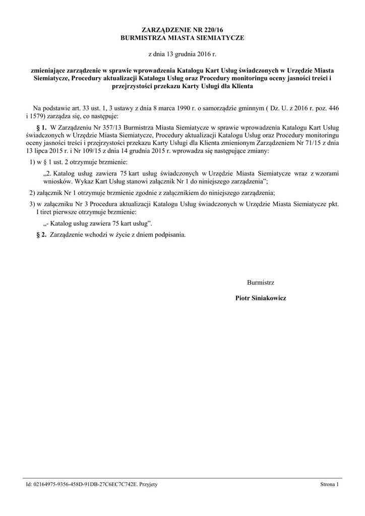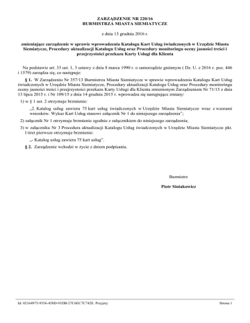 ZARZĄDZENIE NR 220/16 BURMISTRZA MIASTA SIEMIATYCZE z dnia 13 grudnia 2016 r. zmieniające zarządzenie w sprawie wprowadzenia Katalogu Kart Usług świadczonych w Urzędzie Miasta Siemiatycze, Procedury aktualizacji Katalogu Usług oraz Procedury monitoringu oceny jasności treści i przejrzystości przekazu Karty Usługi dla Klienta Na podstawie art. 33 ust. 1, 3 ustawy z dnia 8 marca 1990 r. o samorządzie gminnym ( Dz. U. z 2016 r. poz. 446 i 1579) zarządza się, co następuje: § 1. W Zarządzeniu Nr 357/13 Burmistrza Miasta Siemiatycze w sprawie wprowadzenia Katalogu Kart Usług świadczonych w Urzędzie Miasta Siemiatycze, Procedury aktualizacji Katalogu Usług oraz Procedury monitoringu oceny jasności treści i przejrzystości przekazu Karty Usługi dla Klienta zmienionym Zarządzeniem Nr 71/15 z dnia 13 lipca 2015 r. i Nr 109/15 z dnia 14 grudnia 2015 r. wprowadza się następujące zmiany: 1) w § 1 ust. 2 otrzymuje brzmienie: „2. Katalog usług zawiera 75 kart usług świadczonych w Urzędzie Miasta Siemiatycze wraz z wzorami wniosków. Wykaz Kart Usług stanowi załącznik Nr 1 do niniejszego zarządzenia”; 2) załącznik Nr 1 otrzymuje brzmienie zgodnie z załącznikiem do niniejszego zarządzenia; 3) w załączniku Nr 3 Procedura aktualizacji Katalogu Usług świadczonych w Urzędzie Miasta Siemiatycze pkt. I tiret pierwsze otrzymuje brzmienie: „- Katalog usług zawiera 75 kart usług”. § 2. Zarządzenie wchodzi w życie z dniem podpisania. Burmistrz Piotr Siniakowicz Id: 02164975-9356-458D-91DB-27C6EC7C742E. Przyjety Strona 1 Załącznik do Zarządzenia Nr 220/16 Burmistrza Miasta Siemiatycze z dnia 13 grudnia 2016 r. WYKAZ KART USŁUG NAZW WYDZIAŁU Referat FinansowoBudżetowy (FB) Referat Gospodarki Komunalnej (GK) NAZWA KARTY Złożenie deklaracji na podatek od nieruchomości, rolny, leśny przez osoby prawne Złożenie informacji w sprawie podatku od nieruchomości, leśnego, rolnego przez osoby fizyczne Złożenie deklaracji na podatek od środków transportowych przez osoby fizyczne i prawne Złożenie deklaracji o wysokości opłaty za gospodarowanie odpadami komunalnymi Wydanie zaświadczenia o niezaleganiu w podatkach lub stwierdzeniu stanu zaległości Odroczenie terminu płatności, rozłożenie na raty, umorzenie zaległości w podatku od nieruchomości - osoby fizyczne i prawne Decyzja o środowiskowych uwarunkowaniach dla przedsięwzięcia mogącego potencjalnie znacząco oddziaływać na środowisko Decyzja o środowiskowych uwarunkowaniach dla przedsięwzięcia mogącego zawsze znacząco oddziaływać na środowisko Udostępnienie terenu z wyjątkiem dróg i rowów Zezwolenie na usunięcie drzew lub krzewów Zwrot podatku akcyzowego zawartego w cenie oleju napędowego wykorzystywanego do produkcji rolnej Zezwolenie na utrzymanie psa rasy agresywnej Przydział lokali mieszkalnych i socjalnych z zasobów gminy Dzierżawa gruntów gminnych Sprzedaż lokali mieszkalnych na rzecz ich najemców Sprzedaż nieruchomości w trybie przetargowym Sprzedaż nieruchomości w trybie bezprzetargowym Obciążanie nieruchomości służebnością przesyłu (nie dotyczy pasa drogi publicznej) Ustalenie wstąpienia w stosunek najmu lokalu mieszkalnego po zgonie dotychczasowego najemcy ( w trybie art. 691 Kodeksu cywilnego) Zamiana lokali mieszkalnych i socjalnych wchodzących w skład mieszkaniowego zasobu gminy Sporządzenie wypisu i wyrysu z miejscowego planu zagospodarowania przestrzennego lub studium uwarunkowań i kierunków zagospodarowania przestrzennego miasta Wydanie decyzji na zajęcie pasa drogowego drogi gminnej Wydanie zezwolenia na lokalizację zjazdu Referat Infrastruktury (IF) Rozgraniczenie nieruchomości Nadanie numeru porządkowego nieruchomości Podział nieruchomości Zezwolenie na lokalizację w pasie drogowym urządzeń lub obiektów nie związanych z gospodarką drogową lub potrzebami ruchu drogowego Id: 02164975-9356-458D-91DB-27C6EC7C742E. Przyjety NUMER KARTY FB.0143.1.5.2013 FB.0143.2.5.2013 FB.0143.3.3.2013 FB.0143.4.3.2013 FB.0143.5.3.2013 FB.0143.6.3.2013 GK.0143.1.3.2013 GK.0143.2.3.2013 GK.0143.4.4.2013 GK.0143.8.3.2013 GK.0143.9.4.2013 GK.0143.10.3.2013 GK.0143.11.5.2013 GK.0143.12.4.2013 GK.0143.13.4.2013 GK.0143.14.4.2013 GK.0143.15.4.2013 GK.0143.18.3.2013 GK.0143.20.3.2013 GK.0143.21.3.2013 IF.0143.3.4.2013 IF.0143.5.3.2013 IF.0143.6.3.2013 IF.0143.16.3.2013 IF.0143.17.3.2013 IF.0143.19.3.2013 IF.0143.22.2.2013 Strona 1 Referat Organizacyjny (OR) Samodzielne stanowisko ds. organizacji opieki nad dziećmi i oświaty(Oś) Referat Przedsiębiorczoś ci, Promocji i Turystyki(PR) Urząd Stanu Cywilnego (USC) Wydanie zezwolenia na prowadzenie placówki wsparcia dziennego OR.0143.1.4.2013 Ambasador Siemiatycz OR.0143.2.2.2013 Pomoc materialna o charakterze socjalnym dla uczniów Oś.0143.1.2.2013 Oś.0143.2.3.2013 Dofinansowanie kosztów kształcenia pracowników młodocianych Oś.0143.3.2.2013 Wpis do rejestru żłobków i klubów dziecięcych Stypendium im. Jana Pawła II Realizacja wniosków składanych do Centralnej Ewidencji i Informacji o Działalności Gospodarczej Zaświadczenie potwierdzające dane z ewidencji działalności gospodarczej Licencja na taxi Zmiana treści licencji taxi Zezwolenia na sprzedaż napojów alkoholowych Oświadczenie o wartości sprzedaży napojów alkoholowych Wpis do ewidencji innych obiektów świadczących usługi hotelarskie Przyznanie karty Rodzina 5+ Przyznanie Karty Dużej Rodziny Wydanie materiałów promocyjnych Oś.0143.4.2.2013 PR.0143.3.5.2013 PR.0143.4.5.2013 PR.0143.5.6.2013 PR.0143.6.4.2013 PR.0143.7.3.2013 PR.0143.8.2.2013 PR.0143.9.2.2013 PR.0143.10.2.2013 Jednorazowe zezwolenie na sprzedaż napojów alkoholowych PR.0143.11.1.2013 Zezwolenie na wyprzedaż napojów alkoholowych PR.0143.12.1.2013 Zawiadomienie o zawieszeniu wykonywania krajowego transportu drogowego w zakresie przewozu osób taksówką PR.01430.13.1.2013 PR.0143.1.6.2013 PR.0143.2.5.2013 Odtworzenie aktu stanu cywilneg