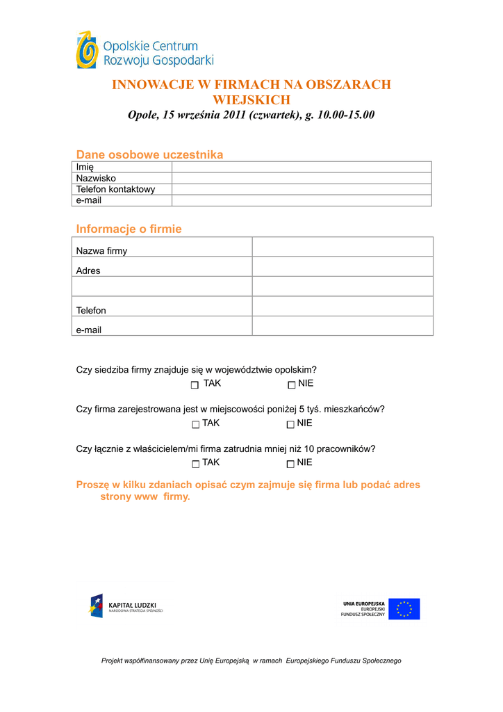 INNOWACJE W FIRMACH NA OBSZARACH WIEJSKICH Opole, 15 września 2011 (czwartek), g. 10.00-15.00 Dane osobowe uczestnika Imię Nazwisko Telefon kontaktowy e-mail Informacje o firmie Nazwa firmy Adres Telefon e-mail Czy siedziba firmy znajduje się w województwie opolskim? TAK NIE Czy firma zarejestrowana jest w miejscowości poniżej 5 tyś. mieszkańców? TAK NIE Czy łącznie z właścicielem/mi firma zatrudnia mniej niż 10 pracowników? TAK NIE Proszę w kilku zdaniach opisać czym zajmuje się firma lub podać adres strony www firmy. Projekt współfinansowany przez Unię Europejską w ramach Europejskiego Funduszu Społecznego