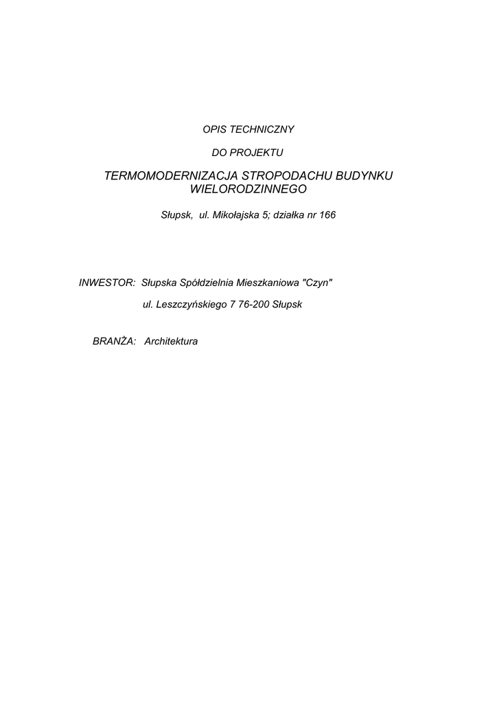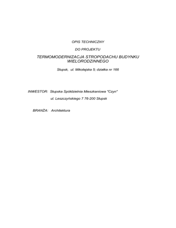 OPIS TECHNICZNY DO PROJEKTU TERMOMODERNIZACJA STROPODACHU BUDYNKU WIELORODZINNEGO Słupsk, ul. Mikołajska 5; działka nr 166 INWESTOR: Słupska Spółdzielnia Mieszkaniowa "Czyn" ul. Leszczyńskiego 7 76-200 Słupsk BRANśA: Architektura 1. PODSTAWA OPRACOWANIA - Zlecenie inwestora, Wizja lokalna, Inwentaryzacja stropodachu budynku przy ul. Mikołajskiej 5. Dokumentacja fotograficzna, Obowiązujące przepisy, 2. ZAKRES OPRACOWANIA Opracowanie obejmuje zakresem remont i termomodernizację stropodachu budynku mieszkalnego wielorodzinnego: − wykonanie termoizolacji stropodachu budynku; − wykonanie izolacji przeciwwilgociowej stropodachu budynku − wymiana obróbek blacharskich − wykonanie dodatkowej rury spustowej 3. PRZEDMIOT INWESTYCJI. Przedmiotem inwestycji jest remont i termomodernizacja stropodachu budynku mieszkalnego wielorodzinnego przy ulicy Mikołajskiej 5 usytuowanego na działce 166 w Słupsku. Nie planuje się zmian w zagospodarowaniu terenu otaczającym obiekt za wyjątkiem włączenia dodatkowej rury spustowej do istniejącej sieci kanalizacji deszczowej. 4. STNIEJĄCY STAN ZAGOSPODAROWANIA. Budynek mieszkalny wielorodzinny przy ul. Mikołajskiej 5 stanowi własność Słupskiej Spółdzielni Mieszkaniowej „Czyn”. Zlokalizowany jest w Słupsku na działce nr 166. Budynek mieszkalny wielorodzinny posiada 6 wejść do klatek schodowych: od strony północno - wschodniej. 5. PROJEKT TERMOMODERNIZACJI 5.1 PRZEZNACZENIE I PROGRAM UśYTKOWY OBIEKTU BUDOWLANEGO Obiekt jest budynkiem mieszkalnym wielorodzinnym w zabudowie wolnostojącej, podpiwniczonym, posiada 5 kondygnacji nadziemnych. Budynek został zbudowany w technologii tradycyjnej, ocieplony i przykryty jest stropodachem. Obiekt z 6 klatkami schodowymi. Przeznaczenie i program uŜytkowy obiektu nie ulega zmianie. 5.2 FORMA ARCHITEKTONICZNA I FUNKCJA OBIEKTU BUDOWLANEGO. 5.3.1 FORMA ARCHITEKTONICZNA Forma architektoniczna budynku nie ulega zmianie. 5.3.2 FUNKCJA BUDYNKU Funkcja budynku nie ulega zmianie. 5.4 PROJEKTOWANE ROZWIĄZANIA Szczegółowe rozwiązania zawarto w części rysunkowej niniejszego opracowania. Zakres : − wykonanie termoizolacji stropodachu budynku; − wykonanie izolacji przeciwwilgociowej stropodachu budynku − wymiana obróbek blacharskich − wykonanie dodatkowej rury spustowej 5.4.1 TERMOIZOLACJA STROPODACHU BYDYNKU Projekt obejmuje zakresem docieplenie oraz zaizolowanie przeciwwilgociowo stropodachu budynku. Jako docieplenie stropodachu niewentylowanego zastosowano styropian Dach/Podłoga EPS 100-038 (λ max=0.038 W/mK) oklejonego z jednej strony papą asfaltową podkładową - gr. 16cm (styropapa) nad częścią mieszkalną (ogrzewaną) oraz styropian Dach/Podłoga EPS 100-038 (λ max=0.038 W/mK) oklejonego z jednej strony papą asfaltową podkładową - gr. 12cm (styropapa) nad częścią nieogrzewaną. Wykonując ocieplenie naleŜy ściśle się trzymać zaleceń i rozwiązań systemowych producenta oraz dokumentacji technicznej. Płyty warstwowe termoizolacyjne „Styropapa” przeznaczone są do wykonywania izolacji termicznej dachów. Stosuje się je od strony zewnętrznej stropodachów i moŜna je układać na juŜ istniejących pokryciach papowych. Powierzchnia podłoŜa powinna tworzyć równą płaszczyznę. Bezpośrednio na płytach moŜna wykonywać pokrycia dachowe z pap zgrzewalnych. Przymocowanie płyt do podłoŜa dokonać przy uŜyciu klejów lub łączników mechanicznych objętych normami lub Aprobatami Technicznymi ITB, dopuszczającymi te wyroby do tego typu zastosowań. ZuŜycie kleju i ilość łączników wynika z uwzględnienia sił ssania wiatru (naleŜy wyodrębnić strefy dachu: środkową, krawędziową, naroŜną) oraz siły przyczepności kleju i nośności łącznika (wartości te podają producenci). Kleje i łączniki znajdują się w ofercie systemowej dostawcy materiału. Kolejność wykonywania robót: - prace przygotowawcze (oczyszczenie podłoŜa pod płyty termoizolacyjne), - zagruntowanie podłoŜa, - ułoŜenie płyt termoizolacyjnych, - wykonanie nowego pokrycia dachowego - 2 warstwy papy termozgrzewalnej, - wykonanie nowych obróbek blacharskich. 5.4.2 PRACE PRZYGOTOWAWCZE Przed przystąpieniem do robót dociepleniowych naleŜy przygotować materiały, narzędzia i sprzęt zgodnie ze specyfikacją techniczną wykonania docieplenia. Sprawdzić czy materiały odpowiadają wymaganiom norm i aprobat technicznych oraz czy mają świadectwa jakości (certyfikaty). 5.4.3 PRZYGOTOWANIE PODŁOśA Przed przystąpieniem do ocieplenia stropodachu naleŜy dokładnie sprawdzić powierzchnię i dokonać oceny stanu technicznego podłoŜa. PodłoŜe powinno być nośne, suche, równe, oczyszczone z powłok antyadhezyjnych (jak np.: brud, kurz, pył, tłuste zabrudzenia ) oraz wolne od agresji biologicznej i chemicznej. JeŜeli istnieją pęcherze, to naleŜy je naciąć, podsuszyć palnikiem i podkleić. W przypadku występowania fałd naleŜy je ściąć lub naciąć i przykleić. Niewielkie nierówności podłoŜa zaleca się zniwelować poprzez przyklejenie 2-3 warstw z asfaltowych pap podkładowych. Wskazane jest „podziurawienie” starego pokrycia w celu udroŜnienia i umoŜliwienia odprowadzenia wilgoci spod istniejących warstw papowych. W celu polepszenia przyczepności zaleca się zagruntowanie środkiem bitumicznym np. Icopal Water Primer istniejącego podłoŜa papowego lub środkiem odpowiadajcym przyjętemu systemowi docieplenia. Przed zagruntowaniem dachu naleŜy oczycić i wyrówna jego powierzchnię. Środek gruntujący naleŜy wcierać za pomocą szczotek lub wałka w suche podłoŜe. Po zagruntowaniu podłoŜa musi ono dobrze wyschnąć, tworząc jednolitą powłokę. 5.4.4 MOCOWANIE PŁYT TERMOIZOLACYJNYCH Płyty laminowane papą naleŜy mocować za pomoc kleju bitumicznego do klejenia styropianu. Oprócz mocowania za pomoc kleju zaleca się dodatkowo zastosowanie łączników mechanicznych (około 4 łczniki/m2). Płyty laminowane jedno
