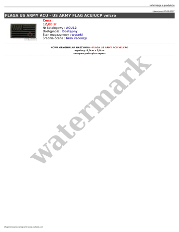Informacje o produkcie Utworzono 07-03-2017 FLAGA US ARMY ACU - US ARMY FLAG ACU/UCP velcro Cena : 12,00 zł Nr katalogowy : ACU12 Dostępność : Dostępny Stan magazynowy : wysoki Średnia ocena : brak recenzji w at er m ar k NOWA ORYGINALNA NASZYWKA - FLAGA US ARMY ACU VELCRO wymiary: 8,5cm x 5,0cm naszywa podszyta rzepem Wygenerowano w programie www.oscGold.com