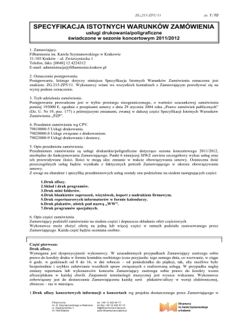 ZG.215-ZP5/11 str. 1/10 SPECYFIKACJA ISTOTNYCH WARUNKÓW ZAMÓWIENIA usługi drukowania/poligraficzne świadczone w sezonie koncertowym 2011/2012 1. Zamawiający. Filharmonia im. Karola Szymanowskiego w Krakowie 31-103 Kraków – ul. Zwierzyniecka 1 Telefon, faks: [0048] 12 4224312 E-mail: [email protected] 2. Oznaczenie postępowania. Postępowanie, którego dotyczy niniejsza Specyfikacja Istotnych Warunków Zamówienia oznaczone jest znakiem: ZG.215-ZP5/11. Wykonawcy winni we wszystkich kontaktach z Zamawiającym powoływać się na wyżej podane oznaczenie. 3. Tryb udzielenia zamówienia. Postępowanie prowadzone jest w trybie przetargu nieograniczonego, o wartości szacunkowej zamówienia poniżej 193000 €, zgodnie z przepisami ustawy z dnia 29 stycznia 2004 roku „Prawo zamówień publicznych” (Dz. U. Nr 19, poz. 177) z późniejszymi zmianami, zwanej w dalszej części Specyfikacji Istotnych Warunków Zamówienia „PZP”. 4. Przedmiot zamówienia wg CPV. 79810000-5 Usługi drukowania. 79820000-8 Usługi związane z drukowaniem. 79823000-9 Usługi drukowania i dostawy. 5. Opis przedmiotu zamówienia. Przedmiotem zamówienia są usługi drukarskie/poligraficzne dotyczące sezonu koncertowego 2011/2012, niezbędne do funkcjonowania Zamawiającego. Punkt 6 niniejszej SIWZ zawiera szczegółowy wykaz usług oraz ich przewidywane ilości. Ilości te mogą ulec zmianie w trakcie obowiązywania umowy. Ostateczna ilość poszczególnych usług będzie wynikała z faktycznych potrzeb Zamawiającego w okresie obowiązywania umowy. Z uwagi na charakter i specyfikę przedmiotowych usług zostały one podzielone na siedem następujących części: 1.Druk afiszy. 2.Skład i druk programów. 3.Druk mini folderów. 4.Druk blankietów zaproszeń, wizytówek, kopert z nadrukiem firmowym. 5.Druk repertuarowych informatorów w formie kalendarzy. 6.Druk plakatów, ulotek pod nazwą „WW”. 7.Druk programów specjalnych. 6. Opis części zamówienia. Zamawiający podzielił zamówienie na siedem części i dopuszcza składanie ofert częściowych. Wykonawca może złożyć ofertę na jedną lub więcej części w ramach podziału zastosowanego przez Zamawiającego. Każda część będzie oceniana osobno. Część pierwsza: Druk afiszy. Wymagana jest dyspozycyjność wykonawcy. W uzasadnionych przypadkach Zamawiający zastrzega sobie prawo do korekty druku w formie kontaktu osobistego (czas przyjazdu: tego samego dnia, co wezwanie, w ciągu 6 godz. w godzinach od 8 do 16, w dni robocze – od poniedziałku do piątku), tak, aby możliwe było bezpośrednie i szybkie załatwianie wszelkich spraw związanych z realizowaną usługą. W przypadku nagłej zmiany repertuaru lub wykonawców koncertu Zamawiający zastrzega sobie prawo do korekty wzoru afisza/plakatu w każdej chwili. Znajomość terminologii muzycznej jest wysoce wskazana. Wykonawca zobowiązany jest do dostarczania Zamawiającemu każdej serii plakatów/afiszy w wersji elektronicznej, zbiorczo – raz w miesiącu. 1.Druk afiszy koncertowych informacji o koncertach wg projektu dostarczonego przez Zamawiającego w str. 2/10 ZG.215-ZP5/11 formie elektronicznej – plik do druku w formacie pdf. Format B-1. Pełny kolor (4+0), papier kredowy o gramaturze minimum 170 g/m². Łączna ilość 12650 szt. afiszy. Ilości poszczególnych serii w tabeli poniżej. Lp. / Oznaczenie Ilość wzorów Tygodniowo / jednorazowo szt. Razem (szt.) 1/S 70 150 10500 2 / ARS 10 80 800 3 / WD 9 150 1350 Zamówienie będzie realizowane sukcesywnie w okresie sezonu koncertowego 2011/2012 od 22.08.2011 r. do 30.06.2012 r. zgodnie z dostarczonym przez Zamawiającego harmonogramem. Wykonawca zobowiąże się do dostarczania plakatów najpóźniej do godziny 12:00 na 9 dni przed koncertem, którego plakaty dotyczą, z tym, że pierwsza seria afiszy „S” winna być wykonana i dostarczona do dnia 22.08.2011 r. 2. Wykonanie afiszy „Mini5” – pomniejszonych do formatu A5 afiszy z punktu 1 (poz. 1 tabeli - S) techniką wydruku cyfrowego. Papier kredowy o gramaturze minimum 135 g/m². Łączna ilość: 50 wzorów po 300 szt. = 15 000 szt. Zamówienie będzie realizowane sukcesywnie w okresie sezonu koncertowego 2011/2012 r. od 22.08.2011 do 30.06.2012 r. zgodnie z dostarczonym przez Zamawiającego harmonogramem koncertów. Wykonawca zobowiąże się do dostarczania afiszów najpóźniej do godziny 12:00 na 9 dni przed koncertem, którego afisze dotyczą. 3.Druk afiszy „Musica da camera, musica da chiesa” wg projektu dostarczonego przez Zamawiającego w formie elektronicznej – plik do druku w formacie pdf. Format B-1. Nadruk pełny kolor (4+0), papier kredowy o gramaturze minimum 170 g/m². Łączna ilość: 1350 szt. afiszy – 150 szt. w miesiącu. Zamówienie będzie realizowane sukcesywnie w okresie sezonu koncertowego 2011/2012 1.10.2011r. do 10.05.2012r. zgodnie z dostarczonym przez Zamawiającego harmonogramem koncertów. Wykonawca zobowiąże się do dostarczania afiszów najpóźniej do godziny 12:00 na 9 dni przed koncertem, którego afisze dotyczą. 4. Druk afisza „Koncerty dla Dzieci” wg projektu dostarczonego przez Zamawiającego w formie elektronicznej – plik do druku w formacie pdf. Format: C-2, papier kredowy o gramaturze minimum 170 g/m². Tło będzie niezmienne (pełny kolor 4+0), zmianie będzie ulegać jedynie treść poszczególnych partii (8 – dotyczących poszczególnych koncertów) afiszy. Łączna ilość 1200 szt., po 150 szt. na koncert. Zamówienie będzie realizowane w okresie od 15.09.2011r. do 30.06.2012 r. zgodnie z dostarczonym przez Zamawiającego harmonogramem. Wykonawca zobowiąże się do dostarczania plakatów najpóźniej do godziny 12:00 na 9 dni przed koncertem, którego plakaty dotyczą. 5. Druk afiszy - informacji repertuarowej, cyklicznej „Koncerty dla Dzieci i Młodzieży” wg projektu dostarczonego przez Zamawiającego w formie elektronicznej – plik do druku w formacie pdf. Format ½ B-1 (cięty wzd