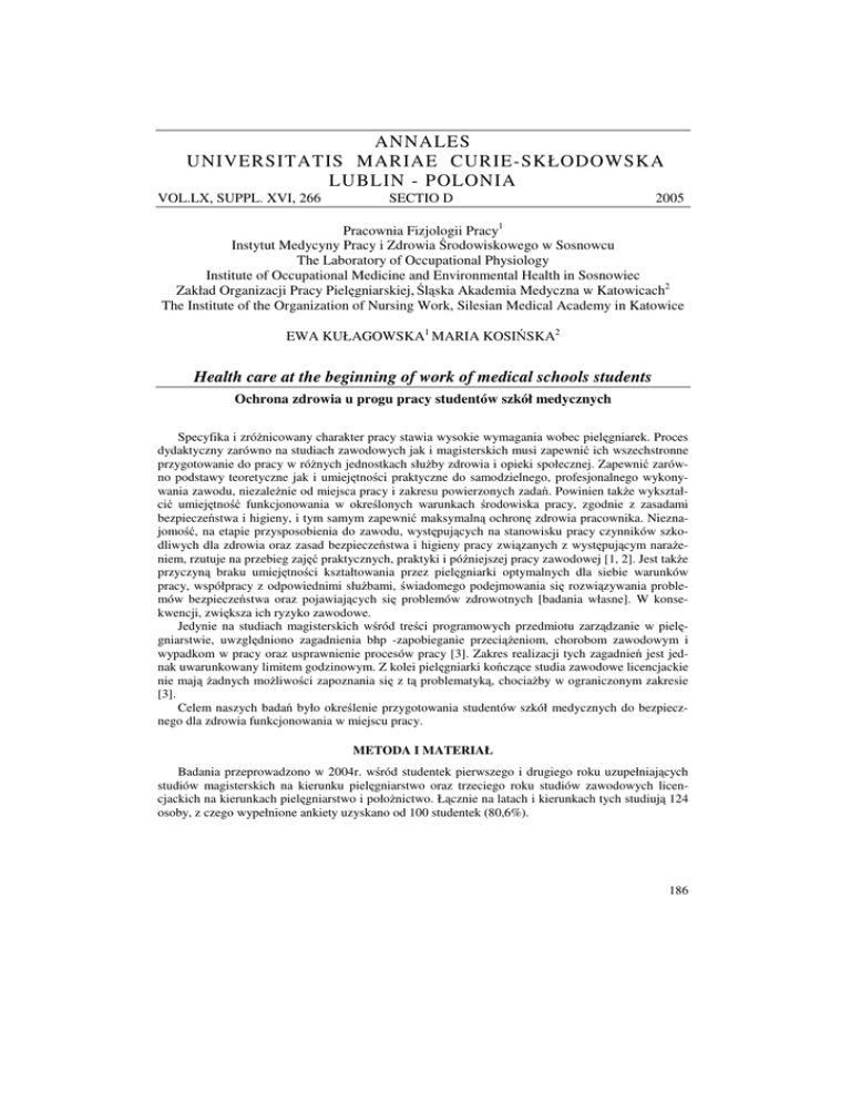 ANNALES UNIVERSITATIS MARIAE CURIE-SKŁODOWSKA LUBLIN - POLONIA VOL.LX, SUPPL. XVI, 266 SECTIO D 2005 Pracownia Fizjologii Pracy1 Instytut Medycyny Pracy i Zdrowia Środowiskowego w Sosnowcu The Laboratory of Occupational Physiology Institute of Occupational Medicine and Environmental Health in Sosnowiec Zakład Organizacji Pracy Pielęgniarskiej, Śląska Akademia Medyczna w Katowicach2 The Institute of the Organization of Nursing Work, Silesian Medical Academy in Katowice EWA KUŁAGOWSKA1 MARIA KOSIŃSKA2 Health care at the beginning of work of medical schools students Ochrona zdrowia u progu pracy studentów szkół medycznych Specyfika i zróżnicowany charakter pracy stawia wysokie wymagania wobec pielęgniarek. Proces dydaktyczny zarówno na studiach zawodowych jak i magisterskich musi zapewnić ich wszechstronne przygotowanie do pracy w różnych jednostkach służby zdrowia i opieki społecznej. Zapewnić zarówno podstawy teoretyczne jak i umiejętności praktyczne do samodzielnego, profesjonalnego wykonywania zawodu, niezależnie od miejsca pracy i zakresu powierzonych zadań. Powinien także wykształcić umiejętność funkcjonowania w określonych warunkach środowiska pracy, zgodnie z zasadami bezpieczeństwa i higieny, i tym samym zapewnić maksymalną ochronę zdrowia pracownika. Nieznajomość, na etapie przysposobienia do zawodu, występujących na stanowisku pracy czynników szkodliwych dla zdrowia oraz zasad bezpieczeństwa i higieny pracy związanych z występującym narażeniem, rzutuje na przebieg zajęć praktycznych, praktyki i późniejszej pracy zawodowej [1, 2]. Jest także przyczyną braku umiejętności kształtowania przez pielęgniarki optymalnych dla siebie warunków pracy, współpracy z odpowiednimi służbami, świadomego podejmowania się rozwiązywania problemów bezpieczeństwa oraz pojawiających się problemów zdrowotnych [badania własne]. W konsekwencji, zwiększa ich ryzyko zawodowe. Jedynie na studiach magisterskich wśród treści programowych przedmiotu zarządzanie w pielęgniarstwie, uwzględniono zagadnienia bhp -zapobieganie przeciążeniom, chorobom zawodowym i wypadkom w pracy oraz usprawnienie procesów pracy [3]. Zakres realizacji tych zagadnień jest jednak uwarunkowany limitem godzinowym. Z kolei pielęgniarki kończące studia zawodowe licencjackie nie mają żadnych możliwości zapoznania się z tą problematyką, chociażby w ograniczonym zakresie [3]. Celem naszych badań było określenie przygotowania studentów szkół medycznych do bezpiecznego dla zdrowia funkcjonowania w miejscu pracy. METODA I MATERIAŁ Badania przeprowadzono w 2004r. wśród studentek pierwszego i drugiego roku uzupełniających studiów magisterskich na kierunku pielęgniarstwo oraz trzeciego roku studiów zawodowych licencjackich na kierunkach pielęgniarstwo i położnictwo. Łącznie na latach i kierunkach tych studiują 124 osoby, z czego wypełnione ankiety uzyskano od 100 studentek (80,6%). 186 Tabela 1. Charakterystyka ilościowa grupy respondentów Liczba studiujących osób Ilość wypełnionych ankiet Studia magisterskie I rok II rok Pielęgniarstwo Pielęgniarstwo 30 32 26 (87%) 17 (53%) Studia zawodowe licencjackie III rok III rok Pielęgniarstwo Położnictwo 19 43 17 (89%) 40 (93%) WYNIKI I OMÓWIENIE Złożone, wieloczynnikowe narażenie personelu pielęgniarskiego w miejscu pracy na oddziaływanie czynników szkodliwych dla zdrowia, powinno wiązać się z punktu widzenia profilaktyki i działań prozdrowotnych z kierunkową, wstępną kwalifikacją lekarską kandydatów na studia oraz z rozszerzonymi badaniami wstępnymi przy przyjęciu do pracy. Przemawiają za tym również wyniki aktualnie przeprowadzonych badań dotyczących stanu zdrowia studentek. Jedynie 40% spośród nich uważa się za osoby zdrowe, co druga odczuwa różnego rodzaju dolegliwości, a co 10 jest przewlekle chora (Tabela 2). U części z nich zostały stwierdzone choroby, których występowanie w istotny sposób zwiększać będzie ich ryzyko zawodowe. U 15% występują potwierdzone badaniami lekarskimi schorzenia w obrębie układu ruchu, 4% posiada żylaki podudzia, a 10% schorzenia o podłożu alergicznym. W tym kontekście, nie dziwią więc wyniki dotyczące zgłaszanych przez studentki dolegliwości przed, w trakcie i bezpośrednio po zajęciach praktycznych, szczególnie w obrębie układu ruchu (Tabela 3). Tabela 2. Samoocena stanu zdrowia (n=100) Zdrowa Przewlekle chora Okresowo występują dolegliwości 40% 11% 49% Tabela 3. Rodzaje dolegliwości oraz liczba osób w procentach deklarujących ich występowanie (n=100) Odczuwane dolegliwości Przed zajęciami W trakcie zajęć Po zajęciach Ilość osób, u których występują dolegliwości 29% 74% 68% Ból stóp 3% 30% 34% Ból głowy 14% 31% 34% Zawroty głowy 6% 8% 9% Bóle łydek 5% 34% 34% Bóle mięśni całego ciała 4% 11% 12% Bóle pleców 5% 34% 25% Bóle kręgosłupa w odcinku szyjnym 5% 14% 15% Bóle kręgosłupa w odcinku piersiowym 2% 13% 11% Bóle kręgosłupa w odcinku krzyżowo-lędźwiowym 12% 45% 40% Bóle ramion 10% 10% Bóle nadgarstków 2% 3% Pieczenie powiek 4% 8% 10% Bóle brzucha 7% 6% 5% Bóle rąk (drętwienie, cierpnięcie mrowienie) 1% 6% 5% Obrzęki podudzia i stóp 4% 14% 15% Swędzące zmiany skórne 2% 5% Inne 2% 5% 6% Na podstawie dokonanej przez studentki samooceny stanu wiedzy i przygotowania do bezpiecznego dla zdrowia funkcjonowania w miejscu pracy, można stwierdzić, że 73% spośród nich czuje się wystarczająco dobrze przygotowana w tym zakresie do zawodu, podczas, gdy 27% oceniło swój stan przygotowania negatywnie (Tabela 4). Tylko 75% studentek potwierdziło, iż zagadnienia z zakresu bezpiecznego wykonywania zadań były omawiane na zajęciach, a 66% było w stanie przedstawić więcej szczegółów na ten temat, ograniczając się jedynie do wskazania przedmiotów teoretycznych lub zajęć praktycznych, w ramach których tematyka ta była realizowana. 