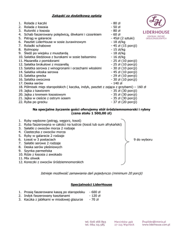 Zakąski za dodatkową opłatą 1. Rolada z kaczki - 80 zł 2. Rolada z łososia - 50 zł 3. Ruloniki z łososia - 80 zł 4. Schab faszerowany polędwicą, śliwkami i czosnkiem - 60 zł 5. Pstrąg w galarecie - 45zł (2 sztuki) 6. Pasztet LiderHouse w sosie żurawinowym - 18 zł/kg 7. Roladki schabowe - 45 zł (15 porcji) 8. Rolmopsy - 15 zł/kg 9. Śledź po wiejsku z musztardą - 18 zł/kg 10. Sałatka śledziowa z burakami w sosie balsamino - 16 zł/kg 11. Mazarella z pomidorami - 25 zł (10 porcji) 12. Sałatka brokułowi z mozarellą - 25 zł (10 porcji) 13. Sałatka serowa z winogronami i orzechami włoskimi - 30 zł (10 porcji) 14. Sałatka włoska serowa - 45 zł (10 porcji) 15. Sałatka grecka - 29 zł (10 porcji) 16. Sałatka owocowa - 30 zł (10 porcji) 17. Deska serów - 140 zł 18. Półmisek mięs staropolskich ( kaczka, indyk, pasztet z zająca z grzybami) – 160 zł 19. Jajka z kawiorem - 35 zł (30 porcji) 20. Jajka z kremem łososiowym - 35 zł (30 porcji) 21. Jajka w cieście z ostrym sosem - 35 zł (30 porcji) 22. Ryba po grecku - 37 zł (20 porcji) Na specjalne życzenie gości oferujemy stół śródziemnomorski i rybny (cena stołu 1 500,00 zł) 1. Ryby wędzone (pstrąg, węgorz, łosoś) 2. Ryba faszerowana w całości na lustrze (łosoś lub sum afrykański) 3. Sałatki z owoców morza 2 rodzaje 4. Ciasteczka z owoców morza 5. Ryby w galarecie 2 rodzaje 6. Łosoś w 3 postaciach 7. Sałatki serowe 2 rodzaje 8. Deska serów pleśniowych 9. Szynka parmeńska 10. Róże z łososia z awokado 11. Mix oliwek 12. Koreczki z owoców śródziemnomorskich 9 do wyboru Istnieje możliwość zamawiania dań pojedynczo (minimum 20 porcji) Specjalności LiderHouse 1. Prosię faszerowane kaszą po staropolsku 2. Indyk faszerowany kasztanami 3. Kaczka z jabłkami w miodowej glazurze - 600 zł - 120 zł - 70 zł