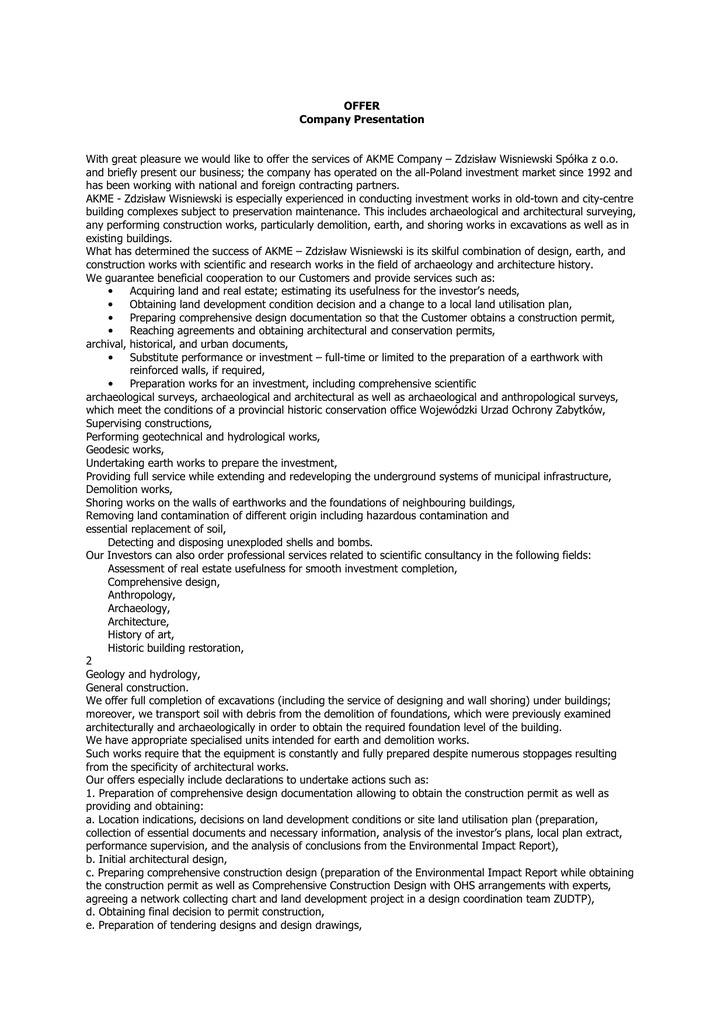 OFFER Company Presentation With great pleasure we would like to offer the services of AKME Company – Zdzisław Wisniewski Spółka z o.o. and briefly present our business; the company has operated on the all-Poland investment market since 1992 and has been working with national and foreign contracting partners. AKME - Zdzisław Wisniewski is especially experienced in conducting investment works in old-town and city-centre building complexes subject to preservation maintenance. This includes archaeological and architectural surveying, any performing construction works, particularly demolition, earth, and shoring works in excavations as well as in existing buildings. What has determined the success of AKME – Zdzisław Wisniewski is its skilful combination of design, earth, and construction works with scientific and research works in the field of archaeology and architecture history. We guarantee beneficial cooperation to our Customers and provide services such as: • Acquiring land and real estate; estimating its usefulness for the investor’s needs, • Obtaining land development condition decision and a change to a local land utilisation plan, • Preparing comprehensive design documentation so that the Customer obtains a construction permit, • Reaching agreements and obtaining architectural and conservation permits, archival, historical, and urban documents, • Substitute performance or investment – full-time or limited to the preparation of a earthwork with reinforced walls, if required, • Preparation works for an investment, including comprehensive scientific archaeological surveys, archaeological and architectural as well as archaeological and anthropological surveys, which meet the conditions of a provincial historic conservation office Wojewódzki Urzad Ochrony Zabytków, Supervising constructions, Performing geotechnical and hydrological works, Geodesic works, Undertaking earth works to prepare the investment, Providing full service while extending and redeveloping the underground systems of municipal infrastructure, Demolition works, Shoring works on the walls of earthworks and the foundations of neighbouring buildings, Removing land contamination of different origin including hazardous contamination and essential replacement of soil, Detecting and disposing unexploded shells and bombs. Our Investors can also order professional services related to scientific consultancy in the following fields: Assessment of real estate usefulness for smooth investment completion, Comprehensive design, Anthropology, Archaeology, Architecture, History of art, Historic building restoration, 2 Geology and hydrology, General construction. We offer full completion of excavations (including the service of designing and wall shoring) under buildings; moreover, we transport soil with debris from the demolition of foundations, which were previously examined architecturally and archaeologically in order to obtain the required foundation level of the building. We have appropriate specialised units intended for earth and demolition works. Such works require that the equipment is constantly and fully prepared despite numerous stoppages resulting from the specificity of architectural works. Our offers especially include declarations to undertake actions such as: 1. Preparation of comprehensive design documentation allowing to obtain the construction permit as well as providing and obtaining: a. Location indications, decisions on land development conditions or site land utilisation plan (preparation, collection of essential documents and necessary information, analysis of the investor’s plans, local plan extract, performance supervision, and the analysis of conclusions from the Environmental Impact Report), b. Initial architectural design, c. Preparing comprehensive construction design (preparation of the Environmental Impact Report while obtaining the construction permit as well as Comprehensive Construction Design with OHS arrangements with experts, agreeing a network collecting chart and land development project in a design coordination team ZUDTP), d. Obtaining final decision to permit construction, e. Preparation of tendering designs and design drawings, f. Performing project architect's supervision and obtaining occupancy permit. 2. Designing a fence for the site area, adjusted to the needs of the investment; submitting this design to an architecture and construction department Wydział Architektury i Budownictwa as well as building and mounting the fence, 3. Construction site surveying which also requires us to: Prepare base map for design purposes, Present and establish boundary lines, Mark fence line, Mark existing network within the investment area, Install temporary benchmarks, Perform gradual quantity surveys with the use of the geodetic method, cyclically prepare basic trig data, Stake out the elevation of excavation floor, Prepare as-built basic trig data. 4. Designing road access to a construction site for the time of investment, installing any necessary warning signs, preparing entry and exit, and building a wheel wash for vehicles leaving the site, 5. Preparing a substitute traffic plan for the time of survey and earth works, and then executing such works, i.e. putting up road signs for the substitute traffic and reconstructing the road pavement. 6. Preparing demolition project and undertaking demolition works as well as transporting and utilising demolition material and preparing necessary applications; moreover, submitting a notification that waste is being generated, according to the Waste Management Act of 27 April 2001 (Journal of Laws No. 62, item 628 as amended), 7. Building the protection of underground utilities network colliding with the earthwork, 3 8. Designing terminals and relocations for the utilities which collide with the excavation; obtaining construction permit and completing these works, 9. performing hydrological and geological surveys for the design purposes