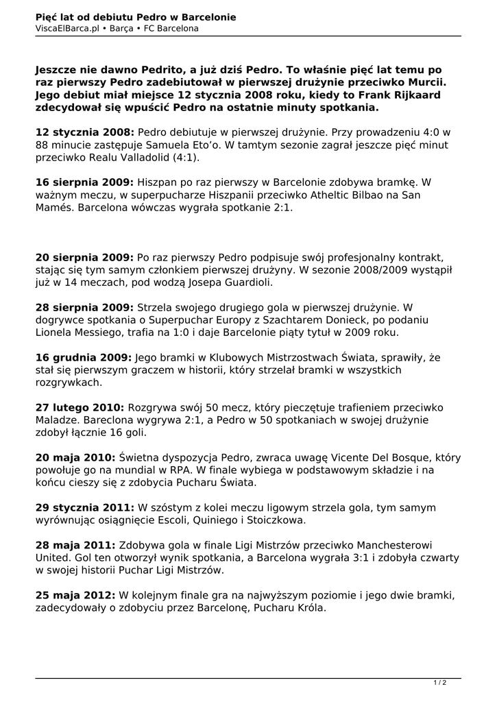 Pięć lat od debiutu Pedro w Barcelonie ViscaElBarca.pl • Barça • FC Barcelona Jeszcze nie dawno Pedrito, a już dziś Pedro. To właśnie pięć lat temu po raz pierwszy Pedro zadebiutował w pierwszej drużynie przeciwko Murcii. Jego debiut miał miejsce 12 stycznia 2008 roku, kiedy to Frank Rijkaard zdecydował się wpuścić Pedro na ostatnie minuty spotkania. 12 stycznia 2008: Pedro debiutuje w pierwszej drużynie. Przy prowadzeniu 4:0 w 88 minucie zastępuje Samuela Eto’o. W tamtym sezonie zagrał jeszcze pięć minut przeciwko Realu Valladolid (4:1). 16 sierpnia 2009: Hiszpan po raz pierwszy w Barcelonie zdobywa bramkę. W ważnym meczu, w superpucharze Hiszpanii przeciwko Atheltic Bilbao na San Mamés. Barcelona wówczas wygrała spotkanie 2:1. 20 sierpnia 2009: Po raz pierwszy Pedro podpisuje swój profesjonalny kontrakt, stając się tym samym członkiem pierwszej drużyny. W sezonie 2008/2009 wystąpił już w 14 meczach, pod wodzą Josepa Guardioli. 28 sierpnia 2009: Strzela swojego drugiego gola w pierwszej drużynie. W dogrywce spotkania o Superpuchar Europy z Szachtarem Donieck, po podaniu Lionela Messiego, trafia na 1:0 i daje Barcelonie piąty tytuł w 2009 roku. 16 grudnia 2009: Jego bramki w Klubowych Mistrzostwach Świata, sprawiły, że stał się pierwszym graczem w historii, który strzelał bramki w wszystkich rozgrywkach. 27 lutego 2010: Rozgrywa swój 50 mecz, który pieczętuje trafieniem przeciwko Maladze. Bareclona wygrywa 2:1, a Pedro w 50 spotkaniach w swojej drużynie zdobył łącznie 16 goli. 20 maja 2010: Świetna dyspozycja Pedro, zwraca uwagę Vicente Del Bosque, który powołuje go na mundial w RPA. W finale wybiega w podstawowym składzie i na końcu cieszy się z zdobycia Pucharu Świata. 29 stycznia 2011: W szóstym z kolei meczu ligowym strzela gola, tym samym wyrównując osiągnięcie Escoli, Quiniego i Stoiczkowa. 28 maja 2011: Zdobywa gola w finale Ligi Mistrzów przeciwko Manchesterowi United. Gol ten otworzył wynik spotkania, a Barcelona wygrała 3:1 i zdobyła czwarty w swojej historii Puchar Ligi Mistrzów. 25 maja 2012: W kolejnym finale gra na najwyższym poziomie i jego dwie bramki, zadecydowały o zdobyciu przez Barcelonę, Pucharu Króla. 1/2 Pięć lat od debiutu Pedro w Barcelonie ViscaElBarca.pl • Barça • FC Barcelona Autor: Maciej Kornas 2/2 Powered by TCPDF (www.tcpdf.org)