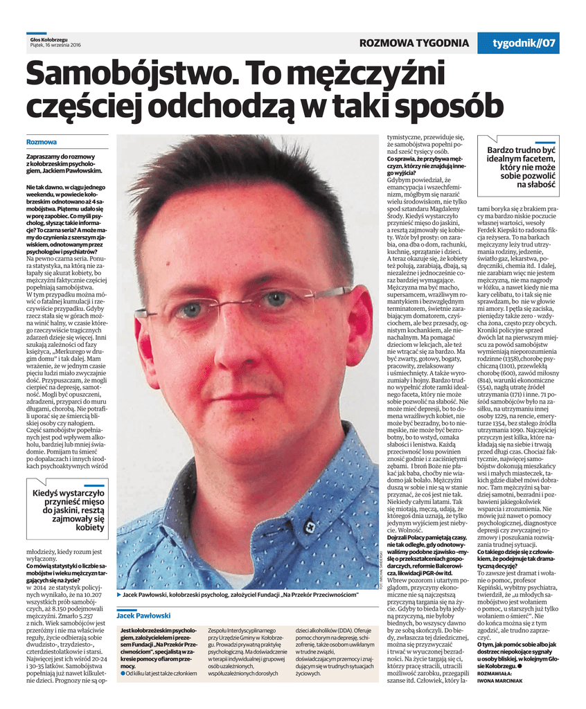 ROZMOWA TYGODNIA Głos Kołobrzegu Piątek, 16 września 2016 tygodnik//07 Samobójstwo. To mężczyźni częściej odchodzą w taki sposób Rozmowa Zapraszamy do rozmowy z kołobrzeskim psychologiem, Jackiem Pawłowskim. Nie tak dawno, w ciągu jednego weekendu, w powiecie kołobrzeskim odnotowano aż 4 samobójstwa. Piątemu udało się w porę zapobiec. Co myśli psycholog, słysząc takie informacje? To czarna seria? A może mamy do czynienia z szerszym zjawiskiem, odnotowanym przez psychologów i psychiatrów? Na pewno czarna seria. Ponura statystyka, na którą nie załapały się akurat kobiety, bo mężczyźni faktycznie częściej popełniają samobójstwa. W tym przypadku można mówić o fatalnej kumulacji i rzeczywiście przypadku. Gdyby rzecz stała się w górach można winić halny, w czasie którego rzeczywiście tragicznych zdarzeń dzieje się więcej. Inni szukają zależności od fazy księżyca, „Merkurego w drugim domu” i tak dalej. Mam wrażenie, że w jednym czasie pięciu ludzi miało zwyczajnie dość. Przypuszczam, że mogli cierpieć na depresję, samotność. Mogli być opuszczeni, zdradzeni, przyparci do muru długami, chorobą. Nie potrafili uporać się ze śmiercią bliskiej osoby czy nałogiem. Część samobójstw popełnianych jest pod wpływem alkoholu, bardziej lub mniej świadomie. Pomijam tu śmierć po dopalaczach i innych środkach psychoaktywnych wśród młodzieży, kiedy rozum jest wyłączony. Co mówią statystyki o liczbie samobójstw i wieku mężczyzn targających się na życie? w 2014 ze statystyk policyjnych wynikało, że na 10.207 wszystkich prób samobójczych, aż 8.150 podejmowali mężczyźni. Zmarło 5.237 z nich. Wiek samobójców jest przeróżny i nie ma właściwie reguły, życie odbierają sobie dwudzisto-, trzydziesto-, czterdziestolatkowie i starsi. Najwięcej jest ich wśród 20-24 i 30-35 latków. Samobójstwa popełniają już nawet kilkuletnie dzieci. Prognozy nie są op- FOT. IMICHAŁ ŚWIDERSKI Kiedyś wystarczyło przynieść mięso do jaskini, resztą zajmowały się kobiety b Jacek Pawłowski, kołobrzeski psycholog, założyciel Fundacji „Na Przekór Przeciwnościom” Jacek Pawłowski Jest kołobrzeżeskim psychologiem, zalożycielelem i prezesem Fundacji „Na Przekór Przeciwnościom”, specjalistą w zakresie pomocy ofiarom przemocy. A Od kilku lat jest także członkiem Zespołu Interdyscyplinarnego przy Urzędzie Gminy w Kołobrzegu. Prowadzi prywatną praktykę psychologiczną. Ma doświadczenie w terapii indywidualnej i grupowej osób uzależnionych, współuzależnionych dorosłych dzieci alkoholików (DDA). Oferuje pomoc chorym na depresję, schizofrenię, także osobom uwikłanym w trudne związki, doświadczajacym przemocy i znajdującym się w trudnych sytuacjach życiowych. tymistyczne, przewiduje się, że samobójstwa popełni ponad sześć tysięcy osób. Co sprawia, że przybywa mężczyzn, którzy nie znajdują innego wyjścia? Gdybym powiedział, że emancypacja i wszechfeminizm, mógłbym się narazić wielu środowiskom, nie tylko spod sztandaru Magdaleny Środy. Kiedyś wystarczyło przynieść mięso do jaskini, a resztą zajmowały się kobiety. Wzór był prosty: on zarabia, ona dba o dom, rachunki, kuchnię, sprzątanie i dzieci. A teraz okazuje się, że kobiety też polują, zarabiają, dbają, są niezależne i jednocześnie coraz bardziej wymagające. Mężczyzna ma być macho, supersamcem, wrażliwym romantykiem i bezwzględnym terminatorem, świetnie zarabiającym domatorem, czyściochem, ale bez przesady, ognistym kochankiem, ale nienachalnym. Ma pomagać dzieciom w lekcjach, ale też nie wtrącać się za bardzo. Ma być zwarty, gotowy, bogaty, pracowity, zrelaksowany i uśmiechnięty. A także wyrozumiały i hojny. Bardzo trudno wypełnić złote ramki idealnego faceta, który nie może sobie pozwolić na słabość. Nie może mieć depresji, bo to domena wrażliwych kobiet, nie może być bezradny, bo to niemęskie, nie może być bezrobotny, bo to wstyd, oznaka słabości i lenistwa. Każdą przeciwność losu powinien znosić godnie i z zaciśniętymi zębami. I broń Boże nie płakać jak baba, choćby nie wiadomo jak bolało. Mężczyźni duszą w sobie i nie są w stanie przyznać, że coś jest nie tak. Niekiedy całymi latami. Tak się miotają, męczą, udają, że któregoś dnia uznają, że tylko jedynym wyjściem jest niebycie. Wolność. Dojrzali Polacy pamiętają czasy, nie tak odległe, gdy odnotowywaliśmy podobne zjawisko –myślę o przekształceniach gospodarczych, reformie Balcerowicza, likwidacji PGR-ów itd. Wbrew pozorom i utartym poglądom, przyczyny ekonomiczne nie są najczęstszą przyczyną targania się na życie. Gdyby to bieda była jedyną przyczyną, nie byłoby biednych, bo wszyscy dawno by ze sobą skończyli. Do biedy, zwłaszcza tej dziedzicznej, można się przyzwyczaić i trwać w wyuczonej bezradności. Na życie targają się ci, którzy pracę stracili, utracili możliwość zarobku, przegapili szanse itd. Człowiek, który la- Bardzo trudno być idealnym facetem, który nie może sobie pozwolić na słabość tami boryka się z brakiem pracy ma bardzo niskie poczucie własnej wartości, wesoły Ferdek Kiepski to radosna fikcja reżysera. To na barkach mężczyzny leży trud utrzymania rodziny, jedzenie, światło gaz, lekarstwa, podręczniki, chemia itd. I dalej, nie zarabiam więc nie jestem mężczyzną, nie ma nagrody w łóżku, a nawet kiedy nie ma kary celibatu, to i tak się nie sprawdzam, bo nie w głowie mi amory. I pętla się zaciska, pieniędzy także zero - wzdycha żona, często przy obcych. Kroniki policyjne sprzed dwóch lat na pierwszym miejscu za powód samobójstw wymieniają nieporozumienia rodzinne (1358),chorobę psychiczną (1101), przewlekłą chorobę (600), zawód miłosny (814), warunki ekonomiczne (554), nagłą utratę źródeł utrzymania (171) i inne. 71 pośród samobójców było na zasiłk