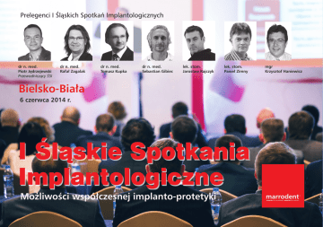 Prelegenci I Śląskich Spotkań Implantologicznych dr n. med. Piotr Jędrzejewski Przewodniczący ŚSI dr n. med. Rafał Zagalak dr n. med. Tomasz Kupka dr n. med. Sebastian Gibiec lek. stom. Jarosław Rajczyk lek. stom. Paweł Zimny mgr Krzysztof Haniewicz Bielsko-Biała 6 czerwca 2014 r. I Śląskie Spotkania Implantologiczne Możliwości współczesnej implanto-protetyki marrodent wszystko dla stomatologii! wszystko dla protetyki! ® 6 czerwca 2014 r. Marrodent Sp. z o.o. , ul. Krasińkiego 31, 43-300 Bielsko-Biała marrodent I Śląskie Spotkania Implantologiczne ® wszystko dla stomatologii! wszystko dla protetyki! Możliwości współczesnej implanto-protetyki Szanowne Koleżanki i Koledzy, pragniemy zaprosić do uczestnictwa w I Sympozjum Naukowym pod nazwą Śląskie Spotkania Implantologiczne. Naszym założeniem jest podzielenie się z Państwem możliwościami współczesnej implanto-protetyki, naszymi doświadczeniami w tym zakresie oraz chęć wspólnej dyskusji z Państwem nad nurtującymi pytaniami z tej dziedziny. Podczas obrad przedstawimy Państwu również propozycję cyklu szkoleniowego z zakresu implantologii od stopnia podstawowego do procedur zaawansowanych. Zapewniamy obecność doświadczonych Prelegentów, ciekawą tematykę i koleżeńską atmosferę. Z wyrazami szacunku 9.30 - 10.00 Rejestracja uczestników 10.00 - 10.15 Otwarcie i powitanie 10.15 - 11.15 dr n. med. Piotr Jędrzejewski WYKŁAD INAUGURACYJNY - „Chirurgia jamy ustnej - od ekstrakcji do implantacji – przegląd technik operacyjnych” 11.15 - 12.15 12.15 - 13.00 dr n. med. Rafał Zagalak „Diagnostyka i planowanie implantologiczne - od protetyki do chirurgii” dr n. med. Tomasz Kupka „Materiały dedykowane rekonstrukcjom protetycznym na dentystycznych wszczepach śródkostnych - protokół pewności i bezpieczeństwa” 13.00 - 14.00 Lunch 14.00 - 14.45 dr n. med. Sebastian Gibiec „Komputerowo wspomagane planowanie i zabiegi implantologiczne - nawigacja? Oczekiwania i możliwości” 14.45 - 15.30 15.30 - 16.15 lek. stom. Jarosław Rajczyk “Implant - właściwy i jedyny wybór?” lek. stom. Paweł Zimny „Protetyka klasyczna a protetyka w systemach CAD/CAM, wsparta na implantach stomatologicznych, w odtwarzaniu brakujących zębów” 16.15 - 17.15 mgr Krzysztof Haniewicz “Sukces w prowadzeniu kliniki stomatologicznej” 17.15 - 18.00 Spotkanie z Wykładowcą (po zakończeniu części wykładowej każdy z Uczestników ma możliwość osobistej rozmowy, wymiany doświadczeń i spostrzeżeń z wybranym przez siebie Prelegentem - „personal touch”) Przewodniczący ŚSI 8 PUNKTÓW EDUKACYJNYCH Potwierdzeniem uczestnictwa w kursie jest certyfikat premiowany punktami edukacyjnymi. Koszt uczestnictwa 490 PLN Zapewniamy całodzienny bufet kawowy oraz lunch. Informacje i zapisy: Dział szkoleń Marrodent® tel.: 33 827 83 00, 604 510 689, [email protected] Ludmiła Walczak - przedstawiciel handlowy Marrodent® tel. 600 452 538, [email protected] Ostatecznym potwierdzeniem uczestnictwa w kursie jest wpłata na poniżej podane konto bankowe. MARRODENT SP. Z O.O., 43-300 Bielsko-Biała, ul. Krasińskiego 31 nr konta: mBANK 48 1140 1049 0000 2278 7400 1024 w tytule płatności prosimy wpisać: dane do faktury, tel. kontaktowy, kod 077/14 W przypadku zgłoszenia rezygnacji, organizator zastrzega sobie prawo do zwrotu uczestnikowi 50% kosztów, jednak nie później niż 10 dni przed szkoleniem. W razie rezygnacji po tym terminie, koszty nie będą zwracane. W przypadku odwołania szkolenia przez organizatora, zwrotowi podlega całość wpłaconych pieniędzy. Zobacz także na www.marrodent.pl Prelegenci I Śląskich Spotkań Implantologicznych 6 czerwca 2014 r. Marrodent Sp. z o.o. , ul. Krasińkiego 31, 43-300 Bielsko-Biała marrodent ® wszystko dla stomatologii! wszystko dla protetyki! dr n. med. Piotr Jędrzejewski Przewodniczący ŚSI „Chirurgia jamy ustnej - od ekstrakcji do implantacji – przegląd technik operacyjnych” Wykład oparty na przekroju własnych, wieloletnich doświadczeń klinicznych, obejmujący zagadnienia: --samokształcenia i drogi rozwoju chirurga-implantologa, --możliwości operacyjnego ratowania uzębienia, --postępowania z tkankami miękkimi i kością, --możliwości współczesnej implantologii i chirurgii okołoimplantacyjnej. Zainteresowania zawodowe implantologia klasyczna, zabiegi okołoimplantacyjne i przygotowawcze do implantologii oraz ich modyfikacje własne, implantologia w chirurgii rekonstrukcyjnej, mikrochirurgia rekonstrukcyjna regionu głowy i szyi, chirurgiczne leczenie rozległych nowotworów regionu głowy i szyi. Wykształcenie 22.11.1993 r. do 10.07.1998 r.- studia na Oddziale Stomatologicznym, Wydziału Lekarskiego Uniwersytetu Medycznego im. Karola Marcinkowskiego w Poznaniu. 06.11.2003 r.- nadanie stopnia doktora nauk medycznych. 02.04.2007 r. do 05.04.2007 r.- państwowy egzamin specjalizacyjny oraz nadanie tytułu specjalisty z zakresu chirurgii szczękowo-twarzowej. Liczne staże z zakresu chirurgii plastycznej i rekonstrukcyjnej, chirurgii ogólnej, naczyniowej, neurochirurgii, ortopedii i laryngologii w Kraju i w Stanach Zjednoczonych. Doświadczenie zawodowe 02.11.1999 r. do 31. 08.2000 r.- pracownik Oddziału Klinicznego Chirurgii Szczękowo-Twarzowej w Poznaniu, 16.10.2000 r. do 07.01.2004 r.- asystent I Katedry i Kliniki Chirurgii Szczękowo-Twarzowej ŚAM w Zabrzu, 08.01.2004 r. do 09.10.2006 r.- asystent II Katedry i Kliniki Chirurgii Szczękowo-Twarzowej ŚAM w Katowicach, 10.10.2006 r. do 30.04.2007 r.- asystent Katedry i Zakładu Anatomii Prawidłowej Wydziału Lekarskiego ŚAM w Katowicach. Współautor i wykonawca preparatów układu nerwowo-naczyniowego do atlasów anatomii wieku rozwojowego regionu głowy i szyi. 01.06.2007 r. do 14.08.2013 r.- starszy asystent Kliniki Chirurgii Onkologicznej i Rekonstrukcyjnej Centrum Onkologii-Instytutu im. Marii Skłodowskiej-Curie w Gliwicach. Współwykonawca pierwszego w Polsce
