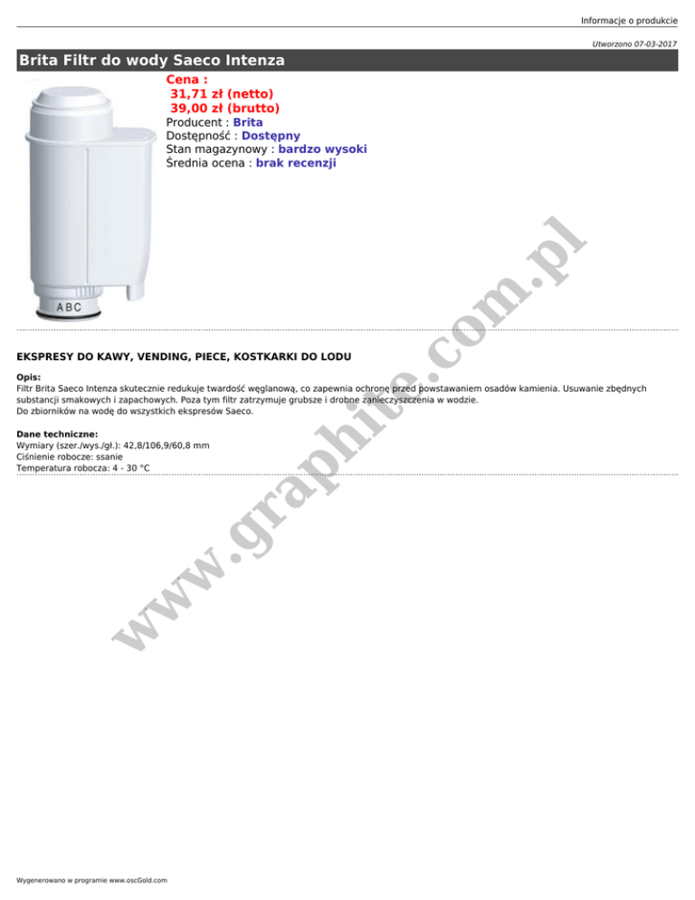 Informacje o produkcie Utworzono 07-03-2017 Brita Filtr do wody Saeco Intenza Cena : 31,71 zł (netto) 39,00 zł (brutto) e. co m .p l Producent : Brita Dostępność : Dostępny Stan magazynowy : bardzo wysoki Średnia ocena : brak recenzji EKSPRESY DO KAWY, VENDING, PIECE, KOSTKARKI DO LODU w w w ph .g ra Dane techniczne: Wymiary (szer./wys./gł.): 42,8/106,9/60,8 mm Ciśnienie robocze: ssanie Temperatura robocza: 4 - 30 °C it Opis: Filtr Brita Saeco Intenza skutecznie redukuje twardość węglanową, co zapewnia ochronę przed powstawaniem osadów kamienia. Usuwanie zbędnych substancji smakowych i zapachowych. Poza tym filtr zatrzymuje grubsze i drobne zanieczyszczenia w wodzie. Do zbiorników na wodę do wszystkich ekspresów Saeco. Wygenerowano w programie www.oscGold.com