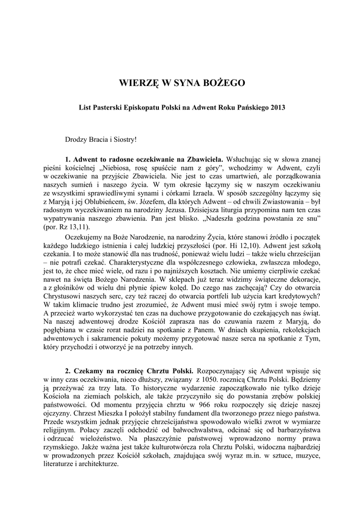 WIERZĘ W SYNA BOŻEGO List Pasterski Episkopatu Polski na Adwent Roku Pańskiego 2013 Drodzy Bracia i Siostry! 1. Adwent to radosne oczekiwanie na Zbawiciela. Wsłuchując się w słowa znanej pieśni kościelnej „Niebiosa, rosę spuśćcie nam z góry”, wchodzimy w Adwent, czyli w oczekiwanie na przyjście Zbawiciela. Nie jest to czas umartwień, ale porządkowania naszych sumień i naszego życia. W tym okresie łączymy się w naszym oczekiwaniu ze wszystkimi sprawiedliwymi synami i córkami Izraela. W sposób szczególny łączymy się z Maryją i jej Oblubieńcem, św. Józefem, dla których Adwent – od chwili Zwiastowania – był radosnym wyczekiwaniem na narodziny Jezusa. Dzisiejsza liturgia przypomina nam ten czas wypatrywania naszego zbawienia. Pan jest blisko. „Nadeszła godzina powstania ze snu” (por. Rz 13,11). Oczekujemy na Boże Narodzenie, na narodziny Życia, które stanowi źródło i początek każdego ludzkiego istnienia i całej ludzkiej przyszłości (por. Hi 12,10). Adwent jest szkołą czekania. I to może stanowić dla nas trudność, ponieważ wielu ludzi – także wielu chrześcijan – nie potrafi czekać. Charakterystyczne dla współczesnego człowieka, zwłaszcza młodego, jest to, że chce mieć wiele, od razu i po najniższych kosztach. Nie umiemy cierpliwie czekać nawet na święta Bożego Narodzenia. W sklepach już teraz widzimy świąteczne dekoracje, a z głośników od wielu dni płynie śpiew kolęd. Do czego nas zachęcają? Czy do otwarcia Chrystusowi naszych serc, czy też raczej do otwarcia portfeli lub użycia kart kredytowych? W takim klimacie trudno jest zrozumieć, że Adwent musi mieć swój rytm i swoje tempo. A przecież warto wykorzystać ten czas na duchowe przygotowanie do czekających nas świąt. Na naszej adwentowej drodze Kościół zaprasza nas do czuwania razem z Maryją, do pogłębiana w czasie rorat nadziei na spotkanie z Panem. W dniach skupienia, rekolekcjach adwentowych i sakramencie pokuty możemy przygotować nasze serca na spotkanie z Tym, który przychodzi i otworzyć je na potrzeby innych. 2. Czekamy na rocznicę Chrztu Polski. Rozpoczynający się Adwent wpisuje się w inny czas oczekiwania, nieco dłuższy, związany z 1050. rocznicą Chrztu Polski. Będziemy ją przeżywać za trzy lata. To historyczne wydarzenie zapoczątkowało nie tylko dzieje Kościoła na ziemiach polskich, ale także przyczyniło się do powstania zrębów polskiej państwowości. Od momentu przyjęcia chrztu w 966 roku rozpoczęły się dzieje naszej ojczyzny. Chrzest Mieszka I położył stabilny fundament dla tworzonego przez niego państwa. Przede wszystkim jednak przyjęcie chrześcijaństwa spowodowało wielki zwrot w wymiarze religijnym. Polacy zaczęli odchodzić od bałwochwalstwa, odcinać się od barbarzyństwa i odrzucać wielożeństwo. Na płaszczyźnie państwowej wprowadzono normy prawa rzymskiego. Jakże ważna jest także kulturotwórcza rola Chrztu Polski, widoczna najbardziej w prowadzonych przez Kościół szkołach, znajdująca swój wyraz m.in. w sztuce, muzyce, literaturze i architekturze. 2 Świętowanie tej rocznicy jest ważne, ale nie może być celem samym w sobie. Znajomość naszej przeszłości pozwala odkrywać i doceniać chrześcijańskie korzenie, z których wyrastamy. Służy to patrzeniu na teraźniejszość przez pryzmat wiary w Boga, by w konsekwencji budować naszą przyszłość na fundamencie doświadczenia żywego spotkania z Chrystusem. Chcemy, by wspomnienie historycznego wydarzenia o fundamentalnym znaczeniu dla chrześcijaństwa i państwowości na naszej ziemi, stało się impulsem do odnowienia i umocnienia naszej wiary. W ramach przygotowania do tego jubileuszu Konferencja Episkopatu Polski opracowała program duszpasterski na lata 2013-2017, którego mottem są słowa: „Przez Chrystusa, z Chrystusem, w Chrystusie. Przez wiarę i chrzest do świadectwa”. Program ten jest propozycją duchowej drogi, prowadzącej do odnowienia przymierza chrzcielnego z Bogiem, do postawienia Boga w centrum naszego życia i do dawania świadectwa wiary. Jest ono ważne w naszych rodzinach, wspólnotach, parafiach a zwłaszcza wobec naszych sióstr i braci, którzy żyją już tak, jakby Boga nie było, dla których Adwent nie istnieje, bo nie mają na co czekać. Chcemy najpierw ewangelizować samych siebie. Chcemy się nawracać. Ale chcemy także docierać z Dobrą Nowiną do tych, którzy – jak mówi Papież Franciszek – „żyją na peryferiach”. Rok pracy duszpasterskiej, który rozpoczynamy dzisiejszą niedzielą, przeżywać będziemy pod hasłem: „Wierzę w Syna Bożego”. „Wierzymy i wyznajemy, że Jezus z Nazaretu, (…) jest odwiecznym Synem Bożym, który stał się człowiekiem” (KKK 423). Wyznanie to jest fundamentem naszej wiary. Wierzymy Jezusowi, gdy przyjmujemy Jego Słowo i spotykamy się z Nim w sakramentach. Wierzymy w Jezusa, gdy przyjmujemy Go osobiście w naszym życiu, w naszych rodzinach i w naszych środowiskach. Pozwólmy Mu przemawiać do naszych serc i budzić w nich tęsknotę za tym, co prawdziwe, dobre i piękne. A zatem pozwólmy Mu, by nas prowadził drogą życia. 3. Oczekujemy na kanonizację Jana Pawła II. W rozpoczynającym się roku duszpasterskim szczególnym wydarzeniem będzie kanonizacja dwóch wielkich papieży Jana XXIII i Jana Pawła II. Z radością oczekujemy i przygotowujemy się na ogłoszenie świętym naszego wielkiego Rodaka. Wielu z nas należy do pokoleń, którym dane było doświadczyć działania mocy Bożej w tym niezwykłym człowieku. Jan Paweł II konsekwentnie uczył nas, że siła wiary zależy od otwarcia na działanie Ducha Świętego. Sam każdego dnia prosił Ducha Świętego o Jego dary. Praktykę tej modlitwy wyniósł z rodzinnego domu. Nauczył się jej od swojego ojca i był jej wierny przez całe życie. Wielokrotnie mogliśmy się przekonać, jak Bóg wysłuchiwał jego modlitwy, czyniąc go narzędziem swe