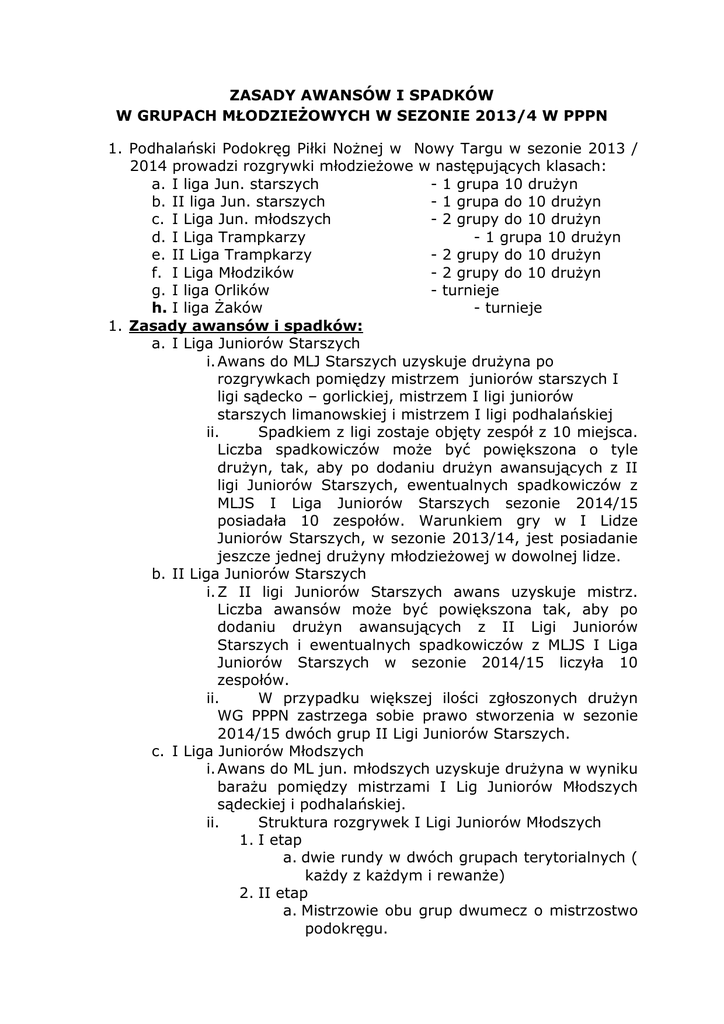 ZASADY AWANSÓW I SPADKÓW W GRUPACH MŁODZIEŻOWYCH W SEZONIE 2013/4 W PPPN 1. Podhalański Podokręg Piłki Nożnej w Nowy Targu w sezonie 2013 / 2014 prowadzi rozgrywki młodzieżowe w następujących klasach: a. I liga Jun. starszych - 1 grupa 10 drużyn b. II liga Jun. starszych - 1 grupa do 10 drużyn c. I Liga Jun. młodszych - 2 grupy do 10 drużyn - 1 grupa 10 drużyn d. I Liga Trampkarzy e. II Liga Trampkarzy - 2 grupy do 10 drużyn f. I Liga Młodzików - 2 grupy do 10 drużyn g. I liga Orlików - turnieje h. I liga Żaków - turnieje 1. Zasady awansów i spadków: a. I Liga Juniorów Starszych i. Awans do MLJ Starszych uzyskuje drużyna po rozgrywkach pomiędzy mistrzem juniorów starszych I ligi sądecko – gorlickiej, mistrzem I ligi juniorów starszych limanowskiej i mistrzem I ligi podhalańskiej Spadkiem z ligi zostaje objęty zespół z 10 miejsca. ii. Liczba spadkowiczów może być powiększona o tyle drużyn, tak, aby po dodaniu drużyn awansujących z II ligi Juniorów Starszych, ewentualnych spadkowiczów z MLJS I Liga Juniorów Starszych sezonie 2014/15 posiadała 10 zespołów. Warunkiem gry w I Lidze Juniorów Starszych, w sezonie 2013/14, jest posiadanie jeszcze jednej drużyny młodzieżowej w dowolnej lidze. b. II Liga Juniorów Starszych i. Z II ligi Juniorów Starszych awans uzyskuje mistrz. Liczba awansów może być powiększona tak, aby po dodaniu drużyn awansujących z II Ligi Juniorów Starszych i ewentualnych spadkowiczów z MLJS I Liga Juniorów Starszych w sezonie 2014/15 liczyła 10 zespołów. ii. W przypadku większej ilości zgłoszonych drużyn WG PPPN zastrzega sobie prawo stworzenia w sezonie 2014/15 dwóch grup II Ligi Juniorów Starszych. c. I Liga Juniorów Młodszych i. Awans do ML jun. młodszych uzyskuje drużyna w wyniku barażu pomiędzy mistrzami I Lig Juniorów Młodszych sądeckiej i podhalańskiej. ii. Struktura rozgrywek I Ligi Juniorów Młodszych 1. I etap a. dwie rundy w dwóch grupach terytorialnych ( każdy z każdym i rewanże) 2. II etap a. Mistrzowie obu grup dwumecz o mistrzostwo podokręgu. b. Wicemistrzowie dwumecz o 3 miejsce w I LJM. c. Gospodarzy pierwszych spotkań wyłoni losowanie. iii. W sezonie 2014 / 2015 I Liga Juniorów Młodszych będzie liczyć 10 drużyn, zakwalifikują się do niej drużyny z miejsc 1,2,3,4,5 z każdej grupy, a w przypadku awansu mistrza I LJM do MLJM, zespoły z 6 miejsc z obu grup zagrają dwumecz o awans do I LJM. Pozostałe drużyny, jak również nowozgłoszone zagrają w II Lidze Juniorów Młodszych. d. I Liga Trampkarzy i. I Liga Trampkarzy rozgrywa „przedmecz” przed meczami I Ligi Juniorów Starszych ii. Awans do ML Trampkarzy uzyskuje drużyna po rozgrywkach pomiędzy mistrzami trampkarzy I ligi sądecko – gorlickiej, mistrzem I ligi trampkarzy limanowskiej, a mistrzem I ligi podhalańskiej. Od sezonu 2014/15 rozgrywki I Ligi Trampkarzy są iii. rozdzielone od I Ligi Juniorów Starszych. iv. Spadkiem z ligi zostaje objęty zespół z 10 miejsca. Liczba spadkowiczów może być powiększona o tyle drużyn, tak, aby po dodaniu drużyn awansujących z II ligi Trampkarzy, ewentualnych spadkowiczów z MLT I Liga Trampkarzy sezonie 2014/15 posiadała 10 zespołów. e. II Liga Trampkarzy i. Rozgrywki II Ligi Trampkarzy w sezonie 2013/14 są rozdzielone od II Ligi Juniorów Starszych. ii. Struktura rozgrywek II ligi trampkarzy 1. Dwie grupy terytorialne (każdy z każdym i rewanże) iii. W sezonie 2014/15 II Liga Trampkarzy będzie liczyła 8 zespołów. iv. Spadki i awanse 1. Mistrzowie obu grup awans do I Ligi Trampkarzy 2. Drużyny z miejsc 2, 3, 4 zostają w II Lidze Trampkarzy. Liczba drużyn pozostająca w lidze może być powiększona tak, aby w sezonie 2014/15 II Liga Trampkarzy będzie liczyła 8 zespołów. 3. Pozostałe zespoły spadają do nowo-utworzonej w sezonie 2014/15 III Ligi Trampkarzy. v. WG PPPN zastrzega sobie prawo do powiększenia w sezonie 2014/15 II Ligi Trampkarzy do 10 zespołów w przypadku zgłoszenia większej ilości drużyn. 1. Związku z tym liczba drużyn pozostająca w lidze może być powiększona tak, aby w sezonie 2014/15 II Liga Trampkarzy będzie liczyła 10 zespołów. f. I Liga Młodzików i. Awans do ML Młodzików uzyskuje drużyna po rozgrywkach pomiędzy mistrzami młodzików I ligi sądecko – gorlickiej, mistrzem I ligi młodzików limanowskiej, a mistrzem I ligi podhalańskiej Struktura rozgrywek I Ligi Młodzików. ii. 1. I etap a. dwie rundy w dwóch grupach terytorialnych ( każdy z każdym i rewanże) 2. II etap a. Mistrzowie obu grup dwumecz o mistrzostwo podokręgu. b. Wicemistrzowie dwumecz o 3 miejsce w I LM. c. Gospodarzy pierwszych spotkań wyłoni losowanie. iii. W sezonie 2014 / 2015 I Liga Młodzików będzie liczyć 10 drużyn, zakwalifikują się do niej drużyny z miejsc 1,2,3,4,5 z każdej grupy, a w przypadku awansu mistrza I LM do MLM, zespołu z 6 miejsc z obu grup zagrają dwumecz o awans do I LM. Pozostałe drużyny, jak również nowozgłoszone zagrają w II Lidze Młodzików. g. I Liga Orlika i. turnieje w grupach terytorialnych ii. dokładny regulamin zostanie opracowany przez WG PPPN i udostępniony na stronie PPPN do 31 sierpnia 2013 r. iii. h. I Liga Żaka i. Turnieje w grupie. i. Mecze barażowe odbędą się w dniach 25 oraz 28 czerwca 2014r. Gospodarzem pierwszych meczy będą drużyny z OZPN Nowy Sącz ( regulamin meczy barażowych zostanie opracowany i przesłany zainteresowanym klubom do dnia 1 czerwca 2014 r.). Za Zarząd Podhalańskiego Podokręgu Piłki Nożnej Prezes PPPN Jan Kowalczyk Przewodniczący Wydziału Gier Franciszek Siuta