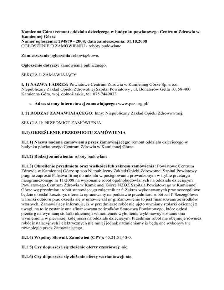 Kamienna Góra: remont oddziału dziecięcego w budynku powiatowego Centrum Zdrowia w Kamiennej Górze Numer ogłoszenia: 294879 - 2008; data zamieszczenia: 31.10.2008 OGŁOSZENIE O ZAMÓWIENIU - roboty budowlane Zamieszczanie ogłoszenia: obowiązkowe. Ogłoszenie dotyczy: zamówienia publicznego. SEKCJA I: ZAMAWIAJĄCY I. 1) NAZWA I ADRES: Powiatowe Centrum Zdrowia w Kamiennej Górze Sp. z o.o. Niepubliczny Zakład Opieki Zdrowotnej Szpital Powiatowy , ul. Bohaterów Getta 10, 58-400 Kamienna Góra, woj. dolnośląskie, tel. 075 7449033. • Adres strony internetowej zamawiającego: www.pcz.org.pl/ I. 2) RODZAJ ZAMAWIAJĄCEGO: Inny: Niepubliczny Zakład Opieki Zdrowowtnej. SEKCJA II: PRZEDMIOT ZAMÓWIENIA II.1) OKREŚLENIE PRZEDMIOTU ZAMÓWIENIA II.1.1) Nazwa nadana zamówieniu przez zamawiającego: remont oddziału dziecięcego w budynku powiatowego Centrum Zdrowia w Kamiennej Górze. II.1.2) Rodzaj zamówienia: roboty budowlane. II.1.3) Określenie przedmiotu oraz wielkości lub zakresu zamówienia: Powiatowe Centrum Zdrowia w Kamiennej Górze sp zoo Niepubliczny Zakład Opieki Zdrowotnej Szpital Powiatowy pragnie zaprosić Państwa firmę do udziału w postępowaniu prowadzonym w trybie przetargu nieograniczonego nr 11/2008 na wykonanie robót ogólnobudowlanych na oddziale dziecięcym Powiatowego Centrum Zdrowia w Kamiennej Górze NZOZ Szpitala Powiatowego w Kamiennej Górze wg przedmiaru robót stanowiącego załącznik nr f. Zakres wykonywanych prac szczegółowo będzie określał kosztorys oferenta opracowany na podstawie przedmiaru robót zał f. Szczegółowe warunki odbioru prac określa się w umowie zał nr g. Zamówienie to jest finansowane ze środków własnych. Zamawiający informuje, iŜ w przedmiarze robót nie ujęto wymiany stolarki okiennej z uwagi, na to iŜ zostanie ona sfinansowana ze środków Starostwa Powiatowego, które ogłosi przetarg na wymianę stolarki okiennej i w momencie wyłonienia wykonawcy zostanie ona wymieniona w pierwszej kolejności na oddziale dziecięcym. Przedmiar robót nie obejmuje równieŜ robót instalacyjnych i elektrycznych nie mniej jednak nadmieniamy iŜ będą one wykonywane równolegle przez Zamawiającego.. II.1.4) Wspólny Słownik Zamówień (CPV): 45.21.51.40-0. II.1.5) Czy dopuszcza się złoŜenie oferty częściowej: nie. II.1.6) Czy dopuszcza się złoŜenie oferty wariantowej: nie. II.1.7) Czy przewiduje się udzielenie zamówień uzupełniających: nie. II.2) CZAS TRWANIA ZAMÓWIENIA LUB TERMIN WYKONANIA: Okres w miesiącach: 2. SEKCJA III: INFORMACJE O CHARAKTERZE PRAWNYM, EKONOMICZNYM, FINANSOWYM I TECHNICZNYM III.1) WARUNKI DOTYCZĄCE ZAMÓWIENIA Informacja na temat wadium: nie wymaga się wpłaty wadium III.2) WARUNKI UDZIAŁU • • Opis warunków udziału w postępowaniu oraz opis sposobu dokonywania oceny spełniania tych warunków: a)nie podlegają wykluczeniu na podstawie art. 24 ust. 1 pkt. 110 oraz ust. 2 pkt.1- 4 oraz spełniają warunki określone w art. 22 ust.1 pkt.1 - 4 ustawy; b)spełnią warunki podstawowe przedmiotu zamówienia określone w rozdziale I, II i inne wymogi określone w siwz w tym równieŜ projektu umowy; c)dostarczą ofertę sporządzoną wg siwz wraz z wypełnionymi następującymi formularzami określonymi w rozdziale III siwz; d)posiadają doświadczenie z ostatnich 5 lat przed dniem wszczęcia postępowania o udzielenie zamówienia, a jeŜeli okres prowadzenia działalności jest krótszy - w tym okresie, odpowiadających swoim rodzajem i wartością robotom budowlanym stanowiącym przedmiot zamówienia, z podaniem ich wartości oraz daty, miejsca wykonania wraz załączeniem dokumentów potwierdzających, Ŝe roboty te zostały wykonane naleŜycie; e)zdobędą, na swoją własną odpowiedzialność i ryzyko, wszelkie dodatkowe informacje, które mogą być konieczne do przygotowania oferty oraz zawarcia umowy i wykonania zamówienia (poŜądane jest dokonanie wizji lokalnej na koszt własny); f)zapewnią minimalny termin płatności: 30 dni od daty odbioru robót daty wystawienia końcowej faktury vat; g)dysponują niezbędnym sprzętem oraz personelem niezbędnym dla realizacji zamówionych robót; h)zrealizują prace remontowe w terminie poŜądanym przez Zamawiającego, tj. 2 m-ce; i)udzielą gwarancji jakości (rękojmi) na 36 miesięcy od daty odbioru końcowego na zrealizowane roboty budowlane; j)przedstawią kosztorys opracowany na podstawie przedmiaru robót (odpowiadający co do zakresu i ilości robót przedmiarowi robót dostarczonemu przez Zamawiającego) obejmujący wszystkie roboty związane z realizacją dzieła budowlanego oraz koszty związane z realizacją zadania; k)zapewnią materiały odpowiadające co do jakości, wymogom wyrobów dopuszczonych do obrotu i stosowania w budownictwie określonym w art. 10 - ustawy Prawo Budowlane (tekst jednolity z 2003r. Dz. U. nr 207 poz. 2016 z pózn. zmianami) oraz wymaganiom specyfikacji istotnych warunków zamówienia. Warunki te będą spełnione przez Wykonawcę, jeŜeli potwierdza je dokumenty, o których mowa w rozdziale III. Ocena powyŜszych warunków wymaganych od oferentów zostanie dokonana na podstawie złoŜonych wraz z ofertą oświadczeń, dokumentów i wykazów, o których mowa w rozdziale III wg formuły spełnia - nie spełnia. Nie spełnienie chociaŜby jednego warunku skutkować będzie wykluczeniem oferenta z postępowania.. Informacja o oświadczeniach i dokumentach, jakie mają dostarczyć wykonawcy w celu potwierdzenia spełniania warunków udziału w postępowaniu: 1.1 formularz ofertowy zał nr a 1.2 oświadczenie oferenta nr b 1.3 oświadczenie w sprawie stosowania się do siwz zał nr c 1.4formularz upowaŜnienia do podpisania oferty zał nr d** 1.5formularz cenowy nr e 1.6przedmiar robót zał nr f (tzw. kosztorys ślepyZamawiającego) 1.7projekt umowy zał nr g 1.8 kosztorys ofertowy zał h* 1.9podwykonawcy zał nr j 1.10oświadczenie oferenta o spełnianiu warunków udziału w postępowaniu z