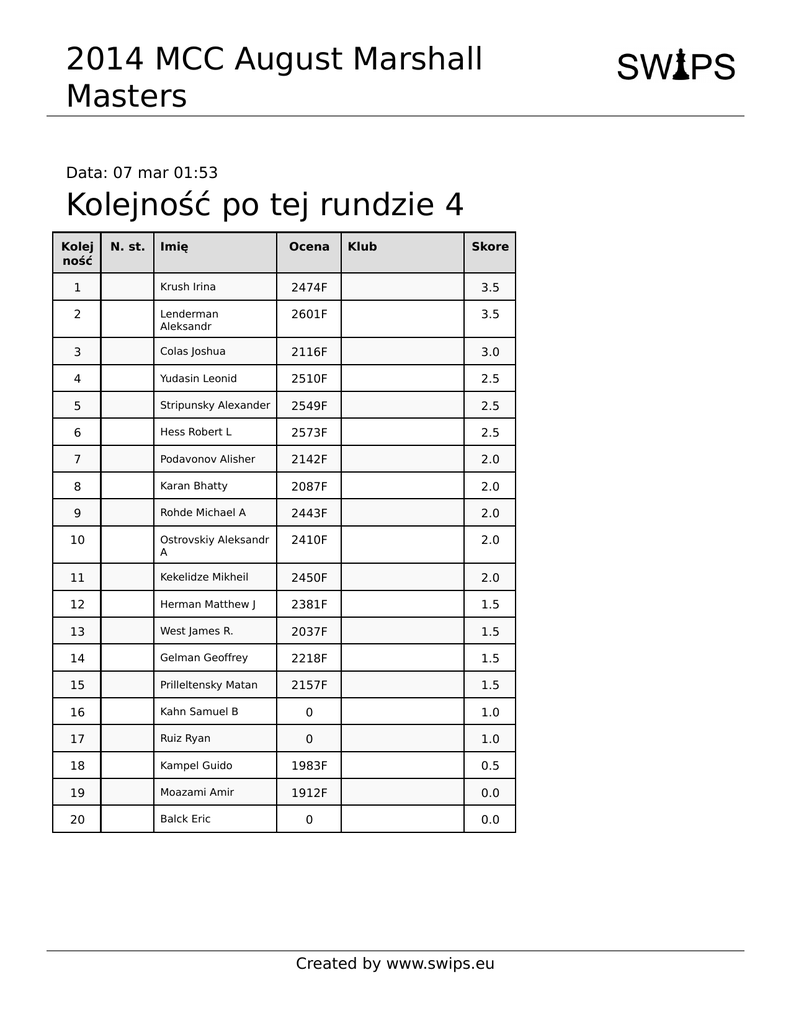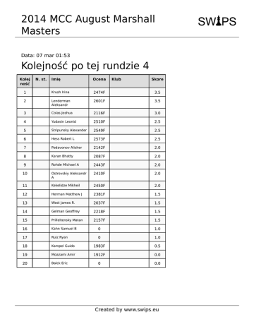 2014 MCC August Marshall Masters Data: 07 mar 01:53 Kolejność po tej rundzie 4 Kolej ność N. st. Imię Ocena Klub Skore 1 Krush Irina 2474F 3.5 2 Lenderman Aleksandr 2601F 3.5 3 Colas Joshua 2116F 3.0 4 Yudasin Leonid 2510F 2.5 5 Stripunsky Alexander 2549F 2.5 6 Hess Robert L 2573F 2.5 7 Podavonov Alisher 2142F 2.0 8 Karan Bhatty 2087F 2.0 9 Rohde Michael A 2443F 2.0 10 Ostrovskiy Aleksandr A 2410F 2.0 11 Kekelidze Mikheil 2450F 2.0 12 Herman Matthew J 2381F 1.5 13 West James R. 2037F 1.5 14 Gelman Geoffrey 2218F 1.5 15 Prilleltensky Matan 2157F 1.5 16 Kahn Samuel B 0 1.0 17 Ruiz Ryan 0 1.0 18 Kampel Guido 1983F 0.5 19 Moazami Amir 1912F 0.0 20 Balck Eric 0 0.0 Created by www.swips.eu