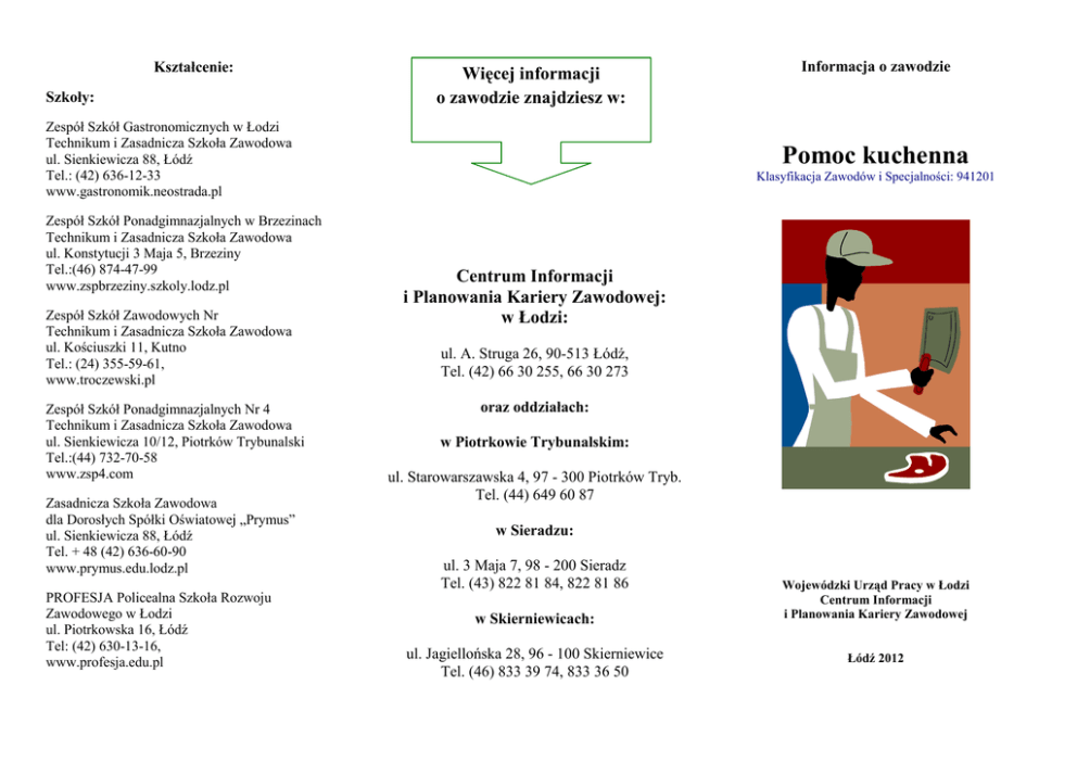 Kształcenie: Szkoły: Więcej informacji o zawodzie znajdziesz w: Zespół Szkół Gastronomicznych w Łodzi Technikum i Zasadnicza Szkoła Zawodowa ul. Sienkiewicza 88, Łódź Tel.: (42) 636-12-33 www.gastronomik.neostrada.pl Zespół Szkół Ponadgimnazjalnych w Brzezinach Technikum i Zasadnicza Szkoła Zawodowa ul. Konstytucji 3 Maja 5, Brzeziny Tel.:(46) 874-47-99 www.zspbrzeziny.szkoly.lodz.pl Zespół Szkół Zawodowych Nr Technikum i Zasadnicza Szkoła Zawodowa ul. Kościuszki 11, Kutno Tel.: (24) 355-59-61, www.troczewski.pl Zespół Szkół Ponadgimnazjalnych Nr 4 Technikum i Zasadnicza Szkoła Zawodowa ul. Sienkiewicza 10/12, Piotrków Trybunalski Tel.:(44) 732-70-58 www.zsp4.com Zasadnicza Szkoła Zawodowa dla Dorosłych Spółki Oświatowej „Prymus” ul. Sienkiewicza 88, Łódź Tel. + 48 (42) 636-60-90 www.prymus.edu.lodz.pl PROFESJA Policealna Szkoła Rozwoju Zawodowego w Łodzi ul. Piotrkowska 16, Łódź Tel: (42) 630-13-16, www.profesja.edu.pl Informacja o zawodzie Pomoc kuchenna Klasyfikacja Zawodów i Specjalności: 941201 Centrum Informacji i Planowania Kariery Zawodowej: w Łodzi: ul. A. Struga 26, 90-513 Łódź, Tel. (42) 66 30 255, 66 30 273 oraz oddziałach: w Piotrkowie Trybunalskim: ul. Starowarszawska 4, 97 - 300 Piotrków Tryb. Tel. (44) 649 60 87 w Sieradzu: ul. 3 Maja 7, 98 - 200 Sieradz Tel. (43) 822 81 84, 822 81 86 w Skierniewicach: ul. Jagiellońska 28, 96 - 100 Skierniewice Tel. (46) 833 39 74, 833 36 50 Wojewódzki Urząd Pracy w Łodzi Centrum Informacji i Planowania Kariery Zawodowej Łódź 2012 Celem pracy pomocy kuchennej jest wykonywanie różnych czynności związanych z przygotowaniem i wstępną obróbką artykułów spożywczych, które są używane przez kucharza do sporządzania dań i posiłków. Zadania zawodowe: • • • • • • • • • pomaganie kucharzowi w przygotowaniu jedzenia (np. myjąc i obierając owoce i warzywa, krojąc chleb, mięso); odmierzanie i mieszanie odpowiednich składników, np. używając wagi i innych narzędzi; nakładanie dań na talerze lub inne odpowiednie naczynia; przygotowywanie prostych dań lub dodatków, np. sosów, kanapek, zup, deserów; kontrolowanie stanu zapasów i informowanie przełożonego o potrzebie złożenia zamówienia; rozpakowywanie i umieszczanie w odpowiednim miejscu produktów; utrzymywanie miejsca pracy w czystości (np. sprzątanie blatów, mycie sprzętu kuchennego, szafek); sprzątanie kuchni (np. zmiatanie i mycie podłóg, wynoszenie śmieci); opłukiwanie i mycie naczyń oraz układanie ich w odpowiednim miejscu. Warunki podjęcia pracy w zawodzie: Osoba pracująca jako pomoc kuchenna powinna mieć wykształcenie gastronomiczne (zasadnicze zawodowe, techniczne, policealne). Niezbędne jest także orzeczenie lekarskie o braku przeciwwskazań do prac, przy wykonywaniu których istnieje możliwość przeniesienia zakażenia na inne osoby. Wydanie takiego orzeczenia poprzedza wykonanie badań do celów sanitarnoepidemiologicznych prowadzonych przez placówki Państwowej Inspekcji SanitarnoEpidemiologicznej. Mają one służyć wykryciu tego, czy osoba, która będzie pracować w kontakcie z żywnością nie jest zakażona pałeczkami duru brzusznego, durów rzekomych A, B i C, innymi pałeczkami z rodzaju Salmonella, i Shigella. Dodatkowe badanie lekarskie mają wykryć podejrzenia na nosicielstwo prątków gruźlicy oraz innych czynników chorobotwórczych, które wywołują stany chorobowe, które wykluczają pracę przy żywności serwowanej innym. i makaronu, manipulowaniu naczyniami itp.) oraz zdolność do pracy pod presją czasu (spiętrzenie pracy w kuchni np. w porach posiłków). Osoby pracujące w tym zawodzie powinien cechować ogólnie dobry stan zdrowia fizycznego i psychicznego. Przeciwwskazania do wykonywania zawodu: W kuchni nie zatrudnia się osób niedowidzących., niedosłyszących, z chorobą psychiczną a także osób z dysfunkcją kończyn dolnych i górnych. Bezwzględnym przeciwwskazaniem do podjęcia pracy w tym zawodzie są: nosicielstwo jakichkolwiek chorób zakaźnych i pasożytniczych, choroby skóry i układu nerwowego, alergie pokarmowe, zaburzenia bądź utrata zmysłu smaku, choroby płuc i przewodu pokarmowego. Wymagania psychofizyczne: Możliwości i szanse zatrudnienia: Podstawowym wymogiem jest schludność i dbałość o higienę osobistą oraz stosowanie zasad higieny w praktyce, w odniesieniu do produktów i surowców spożywczych. Ważne jest, aby pomoc kuchenna miała wiedzę z zakresu dietetyki i zbiorowego żywienia oraz zainteresowania z obszaru gastronomii. Pomoc kuchenna powinna być dokładna, a zarazem szybka w pracy. Typ zajęć sprawia, że często musi się ona zajmować różnymi czynnościami jednocześnie. Ważna jest także zdolność koncentracji i podzielność uwagi (wykonywanie kilku czynności naraz). Ważne są także: zręczność rąk i palców (np. przy siekaniu, krojeniu), koordynacja wzrokoworuchowa (np. przy odcedzaniu ziemniaków Pomoc kuchenna może być zatrudniona w restauracjach, hotelach, barach, pubach, stołówkach, pensjonatach, w firmach cateringowych, domach wczasowych, w stołówkach zakładowych i szkolnych, sanatoriach. Płace: Wynagrodzenie osób pracujących w tym zawodzie zbliżone jest do aktualnie obowiązującej stawki płacy minimalnej. W 2012 r. jest to kwota 1500 zł brutto.
