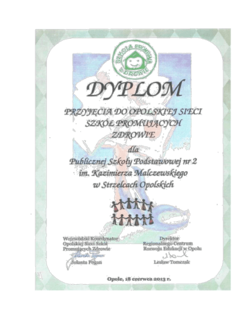 Szkolny Zespół ds. Promocji Zdrowia: 1. Elwira Morawiec- Bartczak – koordynator projektu, dyrektor szkoły 2. Małgorzata Tułodziecka – nauczyciel przyrody 3. Barbara Kuźniak – nauczyciel wychowania fizycznego, bibliotekarz 4. Barbara Babicz- pielęgniarka dyplomowana 5. Patrycja Płoszaj- zastępca dyrektora Powiatowej Stacji Sanitarno- Epidemiologicznej, kierownik sekcji Promocji Zdrowia i Oświaty Zdrowotnej 6. Adam Tymiński – młodszy aspirant -przedstawiciel policji 7. Waldemar Gaida- przedstawiciel rodziców, wicestarosta strzelecki 8. Wiesław Konieczny- przedstawiciel rodziców 9. Joanna Pieprzyk- przedstawiciel uczniów 10. Mikołaj Krukowski – przedstawiciel uczniów RAPORT Z DZIAŁAŃ PODJĘTYCH W OKRESIE PRZYGOTOWAWCZYM PRZYJĘCIA DO OPOLSKIEJ SIECI SZKÓŁ PROMUJĄCYCH ZDROWIE PRZEZ PUBLICZNĄ SZKOŁĘ PODSTAWOWĄ NR 2 im. KAZIMIERZA MALCZEWSKIEGO W STRZELCACH OPOLSKICH rok szkolny 2012/2013 Spis treści: I. Wstęp 1. Forma przedstawienia idei Szkoły Promującej Zdrowie społeczności szkolnej. 2. Sposób przekonania rady pedagogicznej do idei Szkoły Promującej Zdrowie. 3. Sposób, w jaki dokonano oceny podtrzymania przez 100% społeczności szkolnej gotowości wstąpienia do sieci. II. Sprawozdanie III. Zakończenie - podsumowanie PODSTAWOWE INFORMACJE O SZKOLE Nazwa szkoły Publiczna Szkoła Podstawowa nr 2 im. Kazimierza Malczewskiego Adres 47-100 Strzelce Opolskie ul. Wawrzyńca Świerzego 3 Telefon 77 461 3522 Adres e-mail [email protected] Strona www psp2strzelce.pl Imię i nazwisko Elwira Morawiec- Bartczak dyrektora szkoły Imię i nazwisko Elwira Morawiec- Bartczak koordynatora Członkowie szkolnego Małgorzata Tułodziecka- nauczyciel zespołu przyrody, Barbara Kuźniaknauczyciel wychowania fizycznego, Barbara Babicz- pielęgniarka szkolna, Partycja Płoszaj- pracownik Stacji Sanitarno- Epidemiologicznej, powiatowy lider ds. zdrowia, Adam Tymiński- pracownik ds. nieletnich, Wiesław Konieczny i Waldemar Gaida- przedstawiciele rodziców, Joanna Pieprzyk i Mikołaj Krukowski- przedstawiciele społeczności uczniowskiej Data podjęcia uchwały Uchwała Rady Pedagogicznej przystąpienia do nr 5/2012/2013 z dnia12 lutego 2013 programu Logo Szkoły w programie Szkoły Promującej Zdrowie Hasło szkoły w programie Szkoły Promującej Zdrowie „ Jemy zdrowo, bawimy się wesoło. To nasz sposób jest na siły , by wyniki lepsze były.” I. WSTĘP 1. Forma przedstawienia idei Szkoły Promującej Zdrowie społeczności szkolnej. 2. Sposób przekonania rady pedagogicznej do idei SZPZ. 3. Sposób, w jaki dokonano oceny podtrzymania przez 100% społeczności szkolnej gotowości do wstąpienia do sieci. Zgodnie z definicją zdrowia wg. Światowej Organizacji Zdrowia „ Zdrowie to stan dobrego samopoczucia fizycznego, psychicznego i społecznego, a nie tylko brak choroby lub niepełnosprawności.” Publiczna Szkoła Podstawowa nr 2 im. Kazimierza Malczewskiego w Strzelcach Opolskich od szeregu lat zajmuje się promocją zdrowia i prowadzi edukację prozdrowotną , która spójna jest z koncepcją pracy szkoły. Dlatego też szkoła ma do spełnienia ważną rolę w zakresie edukacji zdrowotnej, poprzez wskazywanie prawidłowych wzorców postępowania, uczenie zdrowego stylu życia i wpajanie uczniom potrzeby dbania o zdrowie swoje i innych. Zatem szkoła powinna stwarzać takie warunki dla każdego ucznia , pracownika , aby ten samoistnie podejmował konkretne działania na rzecz edukacji prozdrowotnej. Stworzenie życzliwej atmosfery wpływało na uczenie się jak tworzyć w naszej szkole środowisko sprzyjające zdrowiu. Jednak podejmowanym wcześniejszym działaniom brakowało pogłębionej analizy problemu, brak badania ich skutków. Dużą pomocą, w jaki sposób dokonać tej analizy było przekazanie informacji zdobytych podczas kursu „Jak tworzyć szkołę promującą zdrowie?” Poszerzenie wiedzy na temat zadań podejmowanych w ramach szkoły promującej zdrowie spowodowało ,że inicjatywa zyskała pełną aprobatę wśród Grona Pedagogicznego oraz Rady Rodziców. Aby zrealizować nasze pomysły wykonaliśmy szereg zadań: 1. Zapoznanie uczniów, rodziców, nauczycieli oraz pozostałego personelu szkoły z ideą szkoły promującej zdrowie – szkolenia, apele, pogadanki w klasach. 2. Dokonanie rozpoznania, czy szkoła spełnia warunki wstępne przystąpienia do sieci Szkół Promujących Zdrowie. 3. Powołanie zespołu, który podejmuje (planuje i wdraża) działania na rzecz promocji zdrowia oraz koordynatora, który kieruje pracami zespołu. 4. Zorganizowanie konkursu na logo i hasło Szkoły Promującej Zdrowie Hasło: „ Jemy zdrowo, bawimy się wesoło. To nasz sposób jest na siły , by wyniki lepsze były.” 5. Przeprowadzenie diagnozy aprobaty środowiska szkolnego –100% społeczności uczniowskiej wyraziło aprobatę dla tworzenia Szkoły Promującej Zdrowie, 100 % pracowników szkoły, 91 % rodziców Rada Pedagogiczna wraz z Radą Rodziców na swoim posiedzeniu w dniu 12 lutego 2013 r. podjęli uchwałę w sprawie przystąpienia do tworzenia szkoły promującej zdrowie Rok szkolny 2012/2013 był rokiem przygotowawczym, który wykorzystaliśmy na: 1. podsumowaniu naszej pracy w ramach edukacji prozdrowotnej w odniesieniu do pięciu standardów. 2. Przeprowadzenie diagnozy stanu wyjściowego, a na jej podstawie - wybór priorytetów. 3. Opracowanie planu pracy na rok szkolny 2013/2014-2014/2015 oraz realizację zadań zaplanowanych w okresie przygotowawczym oraz ich ewaluacja. 4. Opracowanie przez zespół oraz przyjęcie do realizacji przez Radę Pedagogiczną planu pracy w zakresie programu Szkoły Promującej Zdrowie W związku z powyższym uznaliśmy ,że gotowi jesteśmy do wstąpienia do Opolskiej Sieci Szkół Promujących Zdrowie , a akceptacja naszych działań przez w/w podmioty jest na tyle wysoka , co utwierdziło nas ,że zakończą się one pełnym sukcesem. II. SPRAWOZDANIE W przeprowadzeniu ewaluacji stanu wyjściow